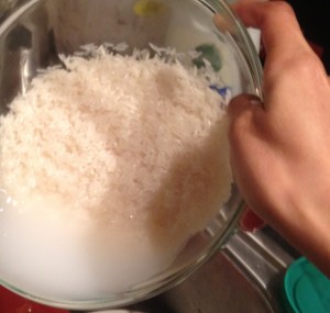 The rice for this dish is called arroz blanco, just regular white rice but you cook it slightly differently than the way you would typically cook rice. Boil 6 cups of water. Once that is boiling, wash the rice in cold water until the water is clear and pour the rice into the boiling water and let it boil for 5 min. Drain the water and wash the rice with cold water again. Put a light covering of olive oil in the empty pot (or a frying pan) and add the rice. Cover, set to minimum heat and let the rice cook for another 20 min or until it is ready.