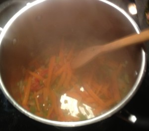 Cook the vegetables in a medium size pot with a tablespoon of olive oil or until the onions are cooked. Add 4 cups of water and let it cook for 15 min.