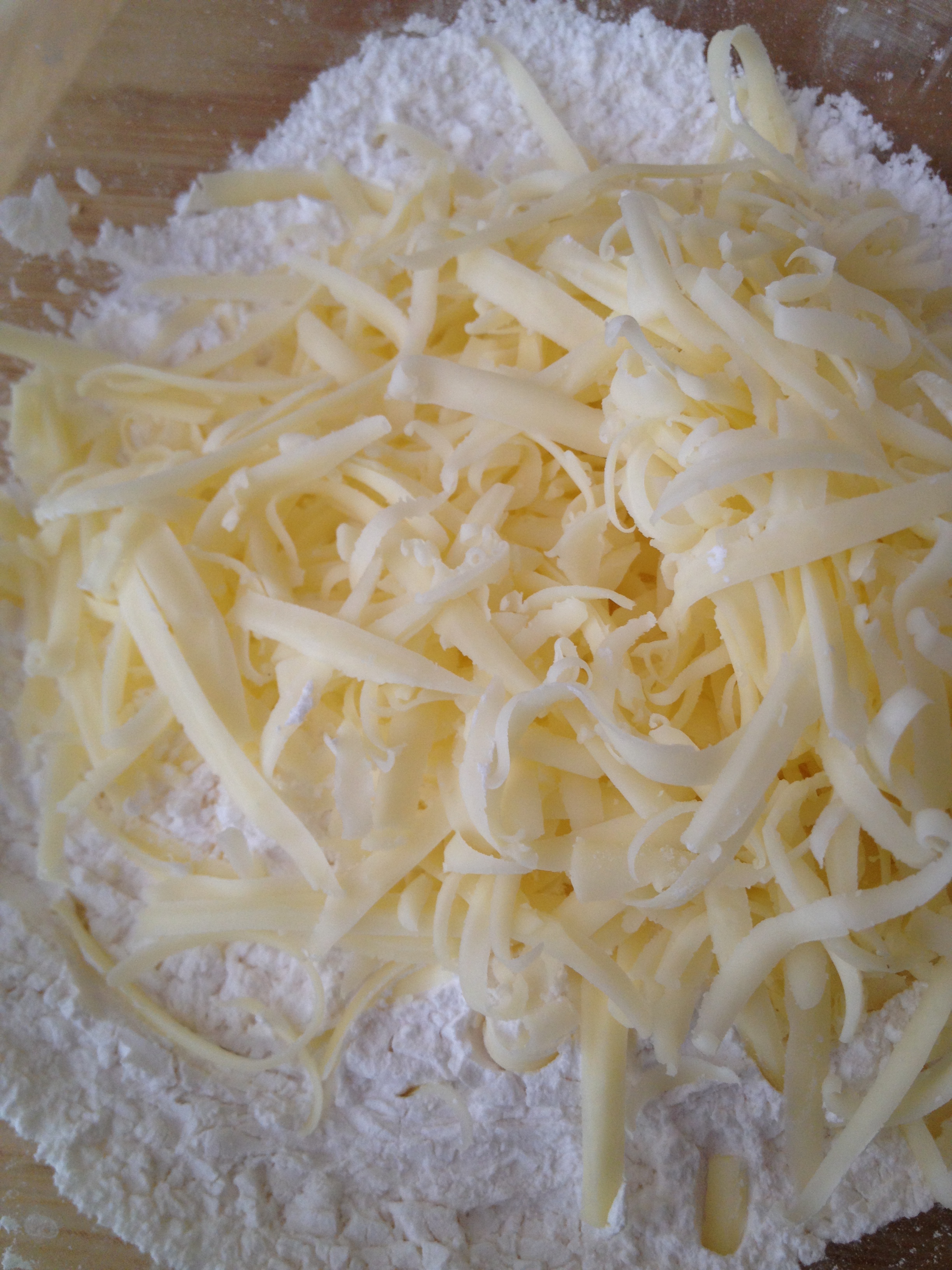 Mix the tapioca flour and the baking powder in a mixing bowl. Add the cheese and mix well until cheese is covered in the flour.