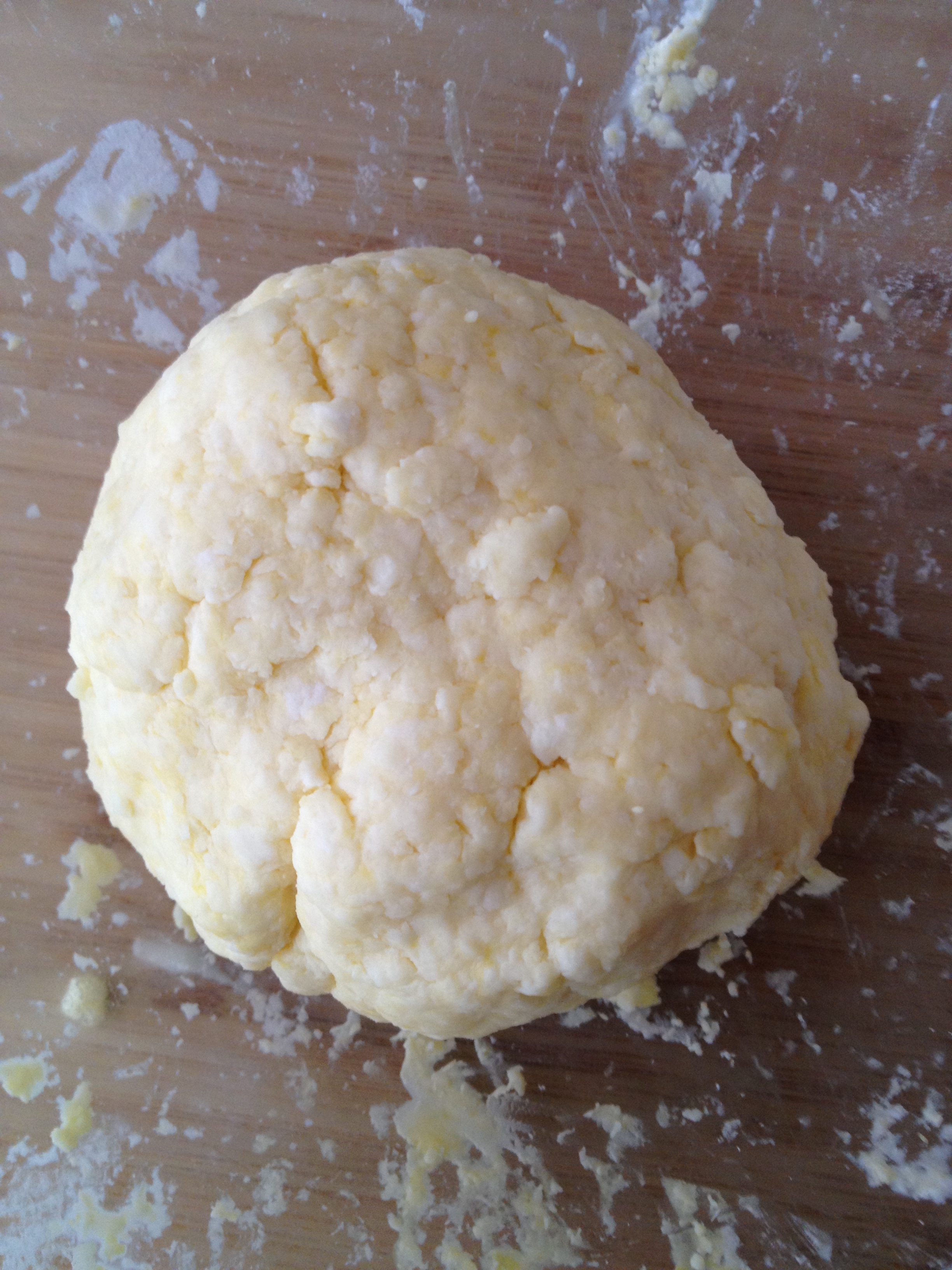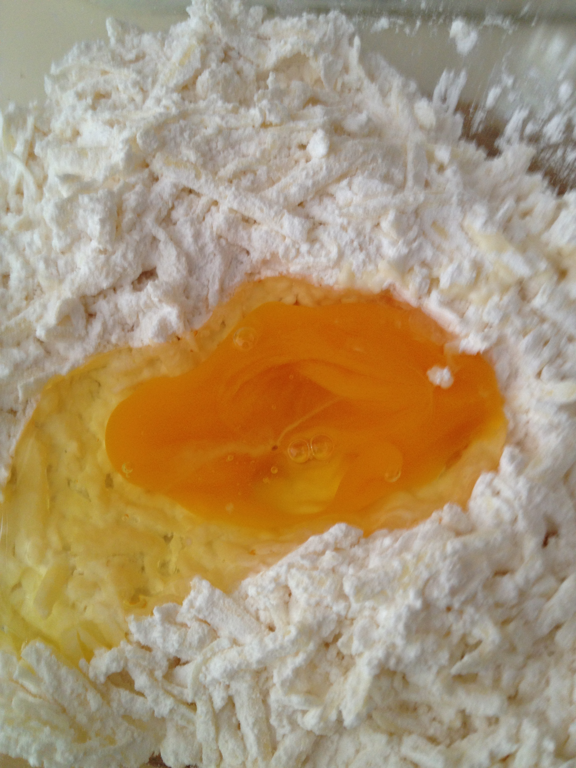 Add the egg to the mix of cheese and flour, and mix. If the dough starts sticking together, you don’t need to add milk if it keeps separating add 1 tbs of milk at that time.