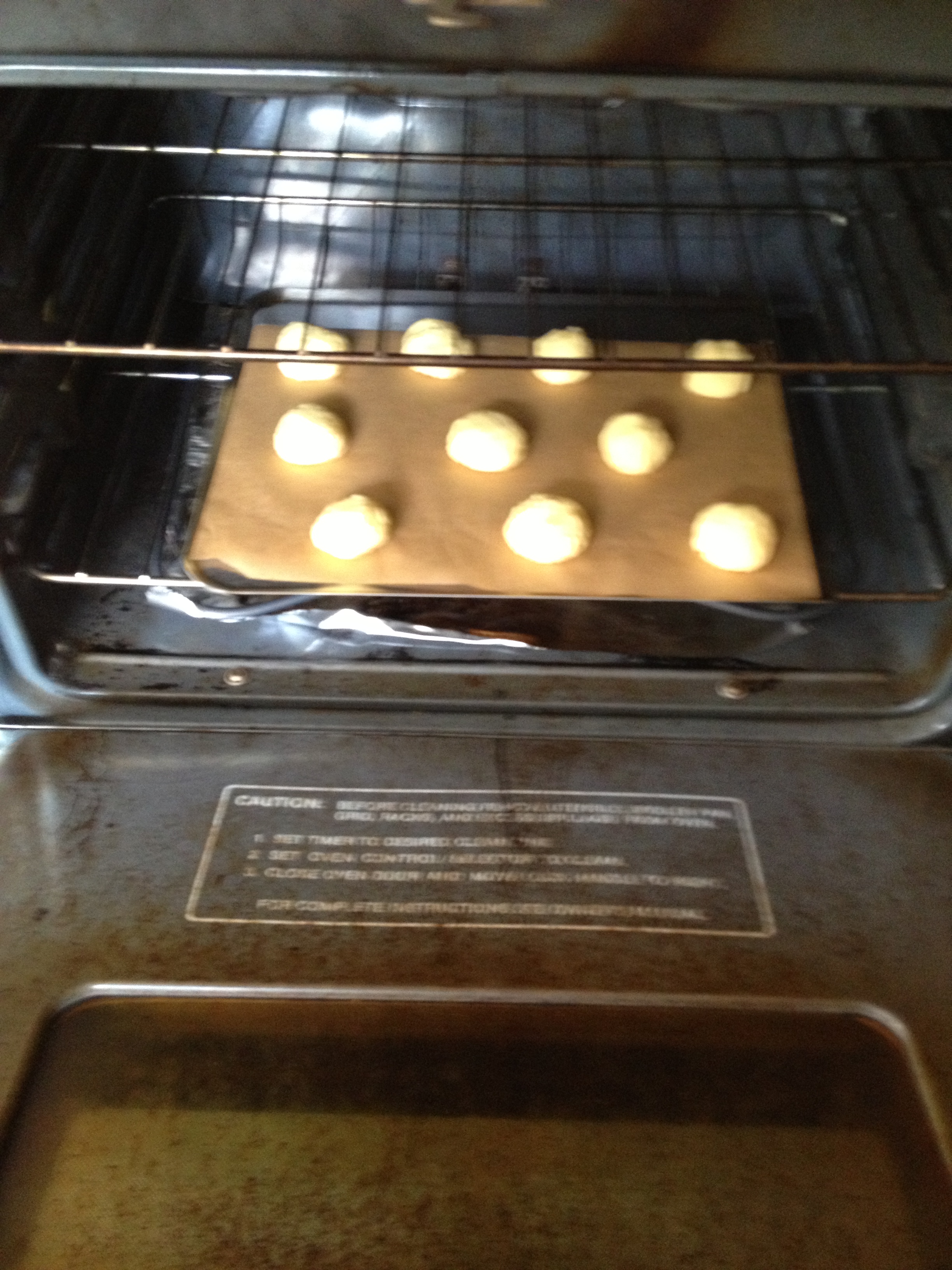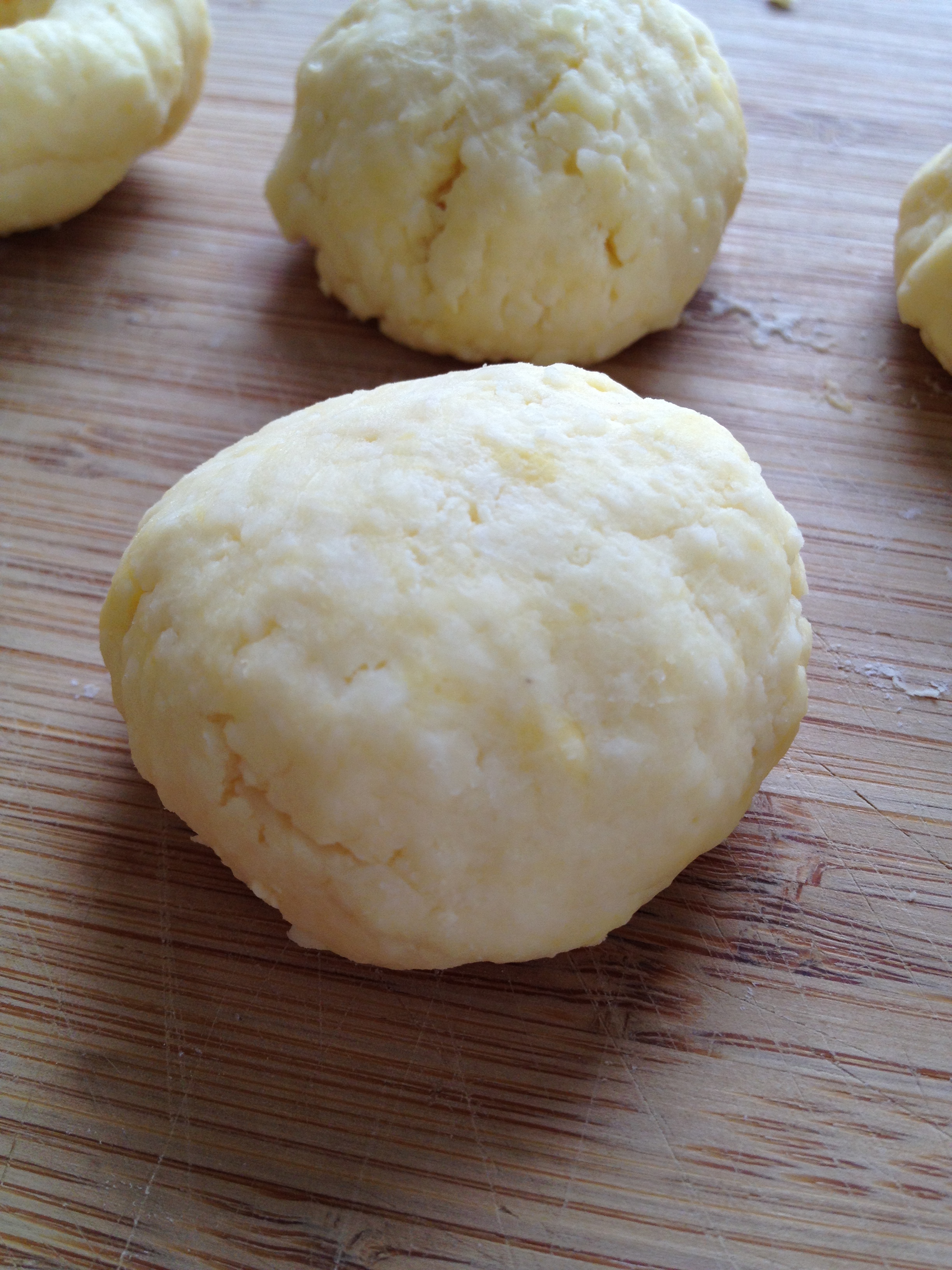 In this case I added one tbs of milk and made a nice ball of dough. Divide the dough in 10 pieces of the same size and shape them into balls. Put a thumbprint in the bottom of each ball (to help with even puffing in the oven).