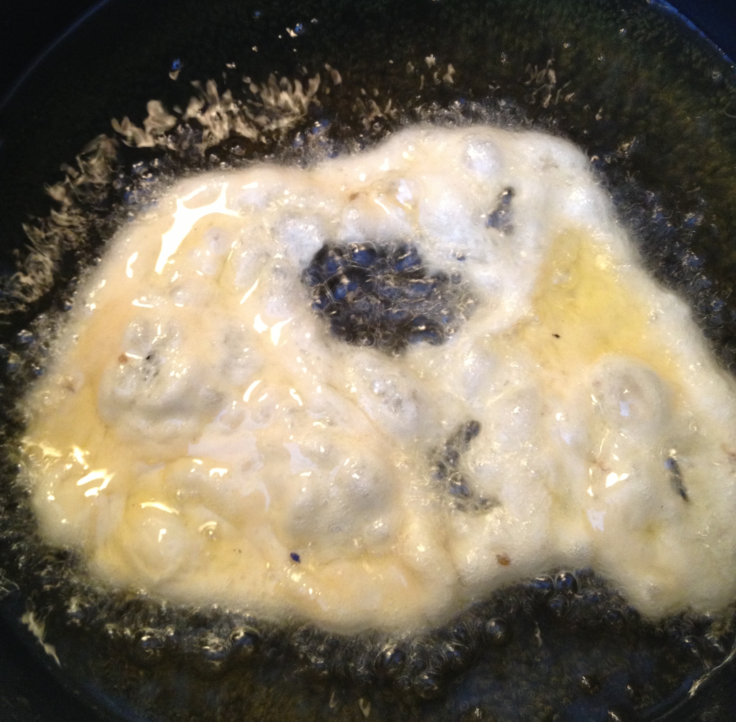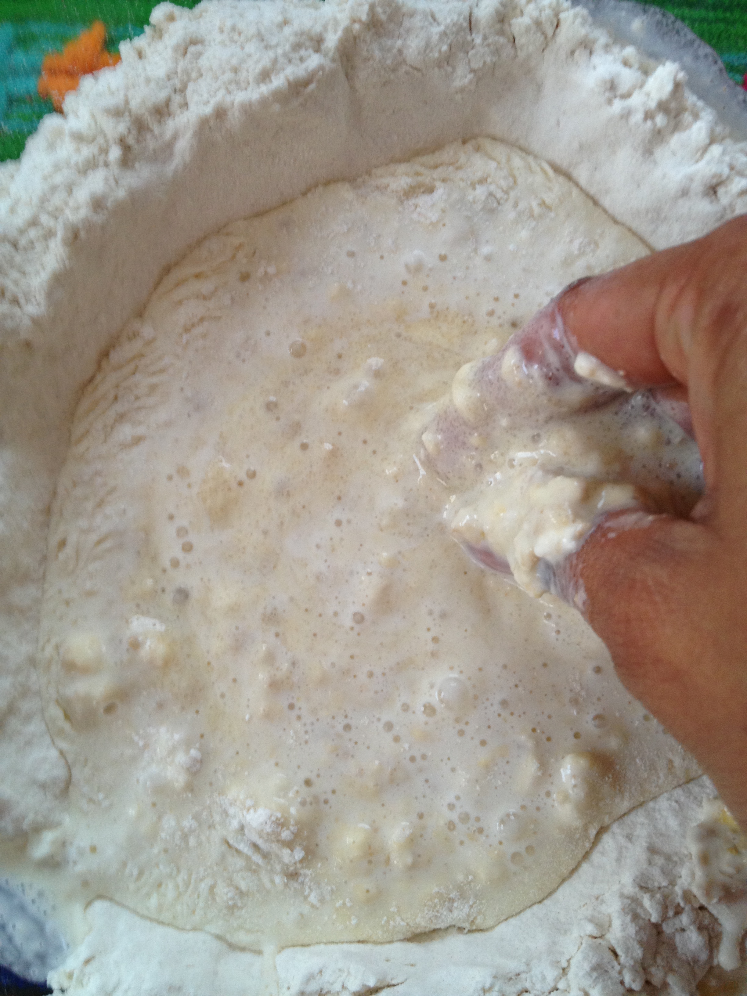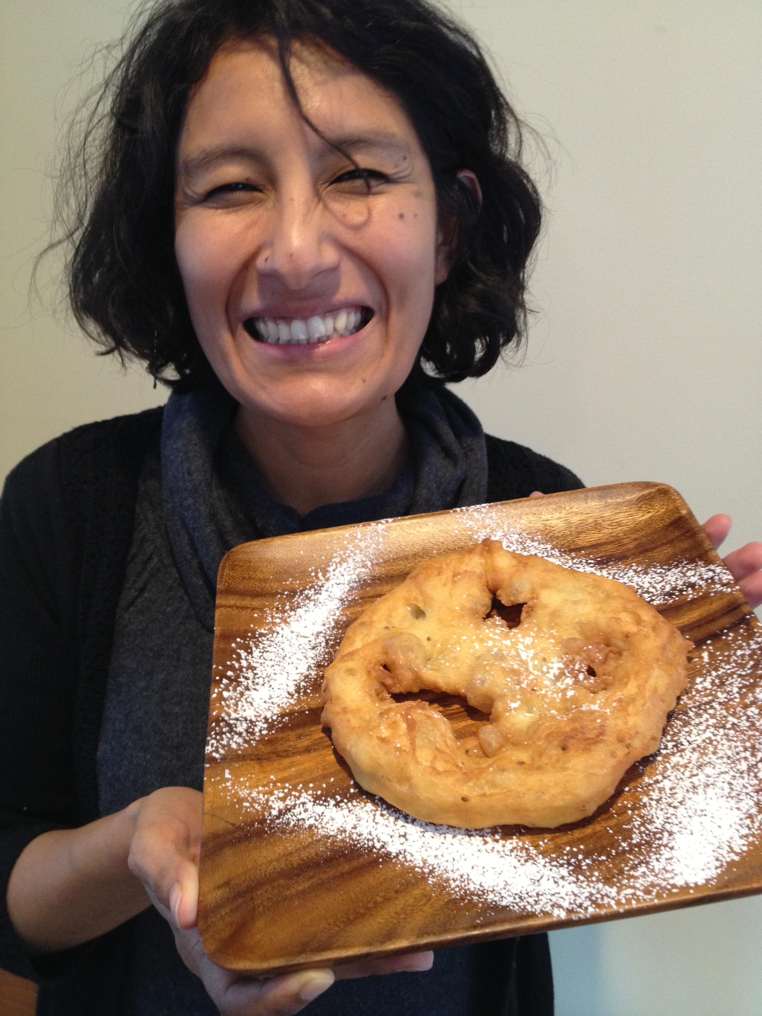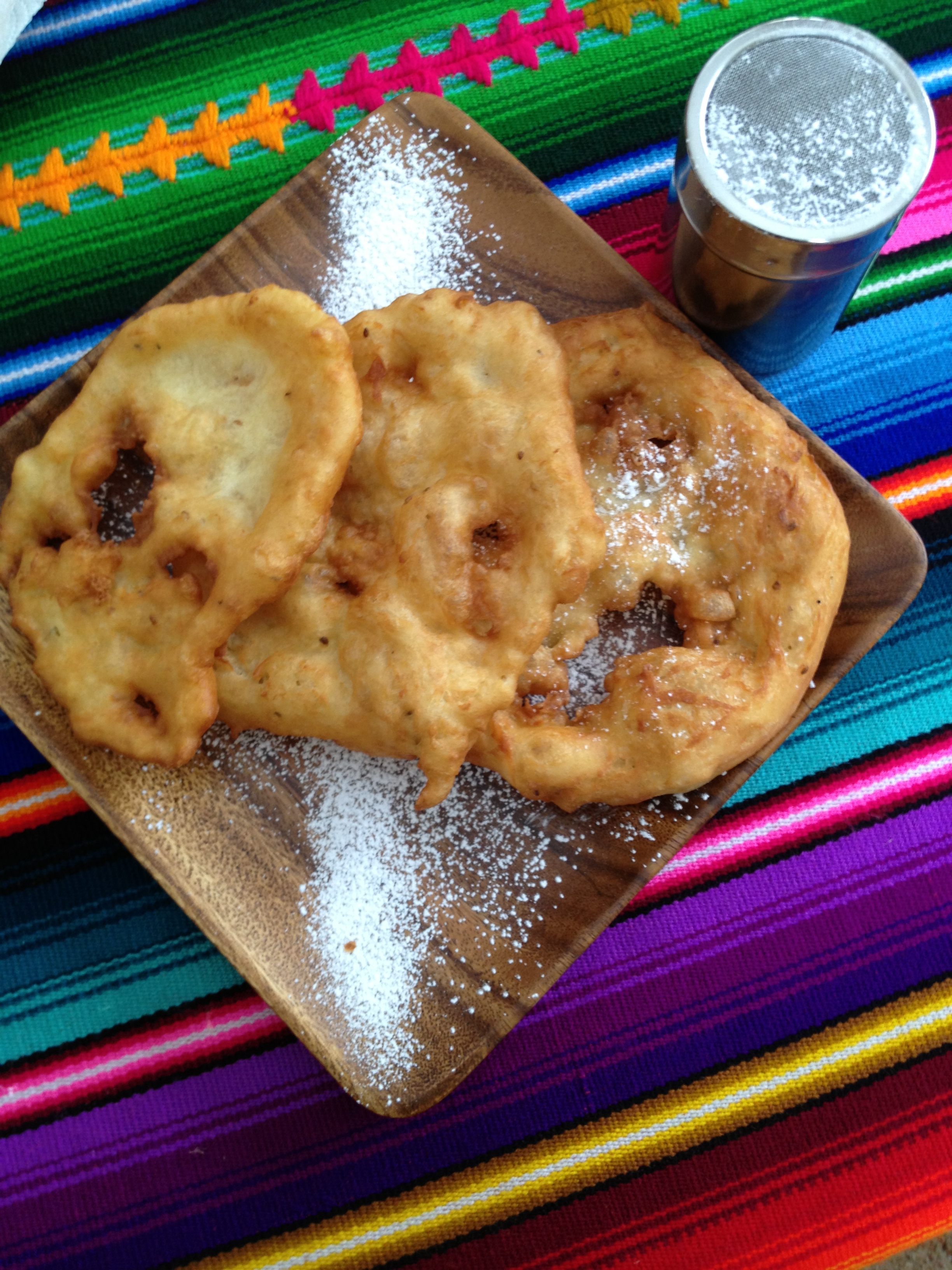 The dough should still be sticky, that is a good sign, but not liquid. To make the buñuelos. pass your fingers through the oil and take a small portion of the dough and shape the dough into round disks and poke holes in the middle. This takes some practice so don’t get to scared. You want them nice and round, very thin in the middle and thick at the edges.