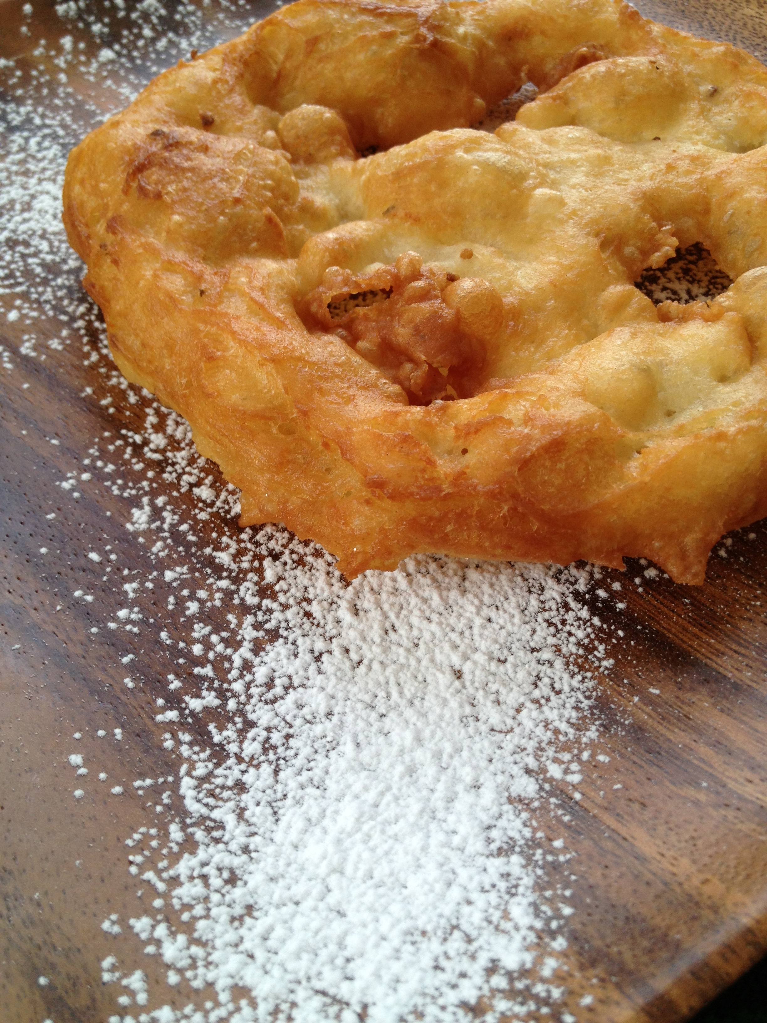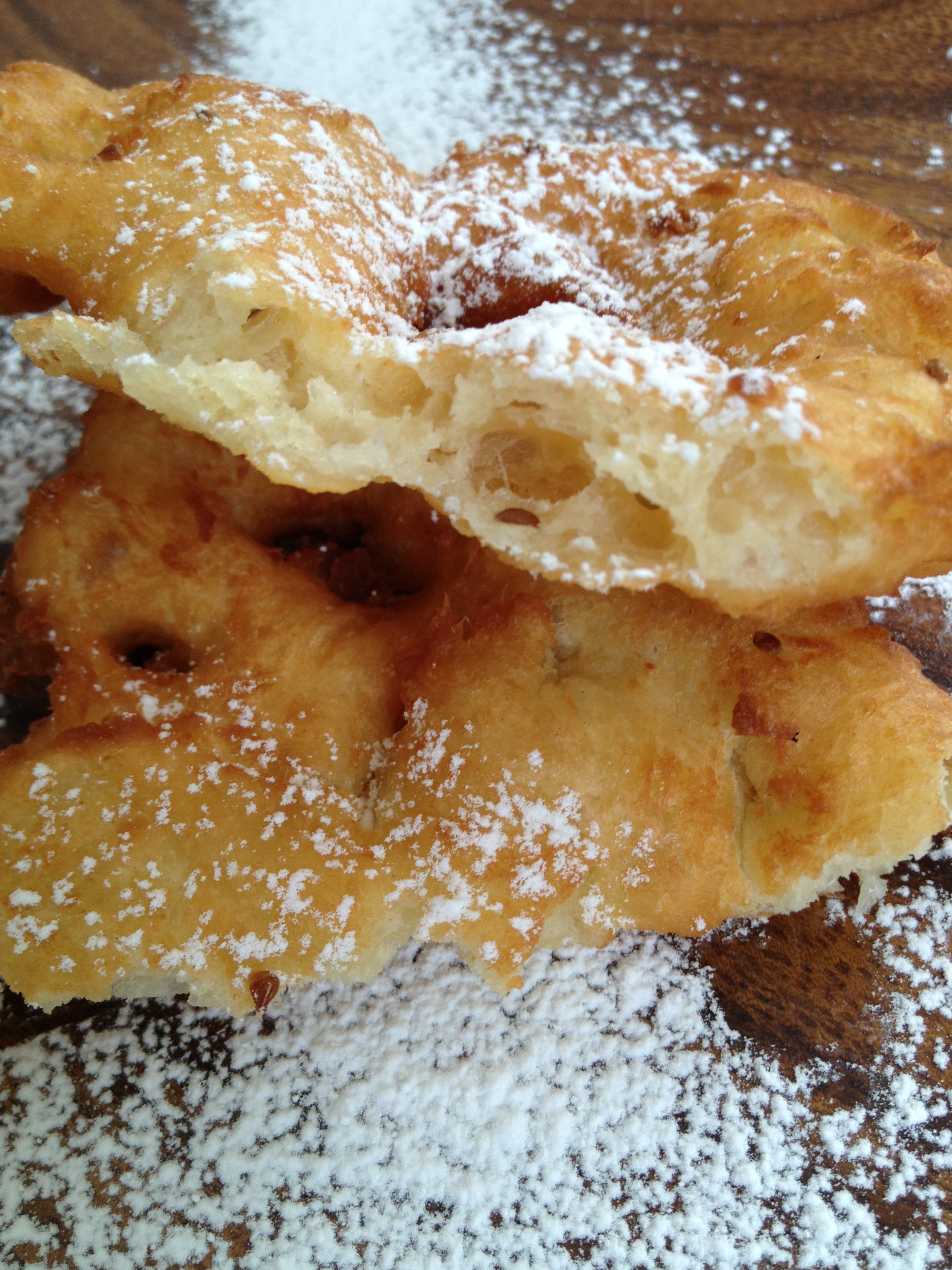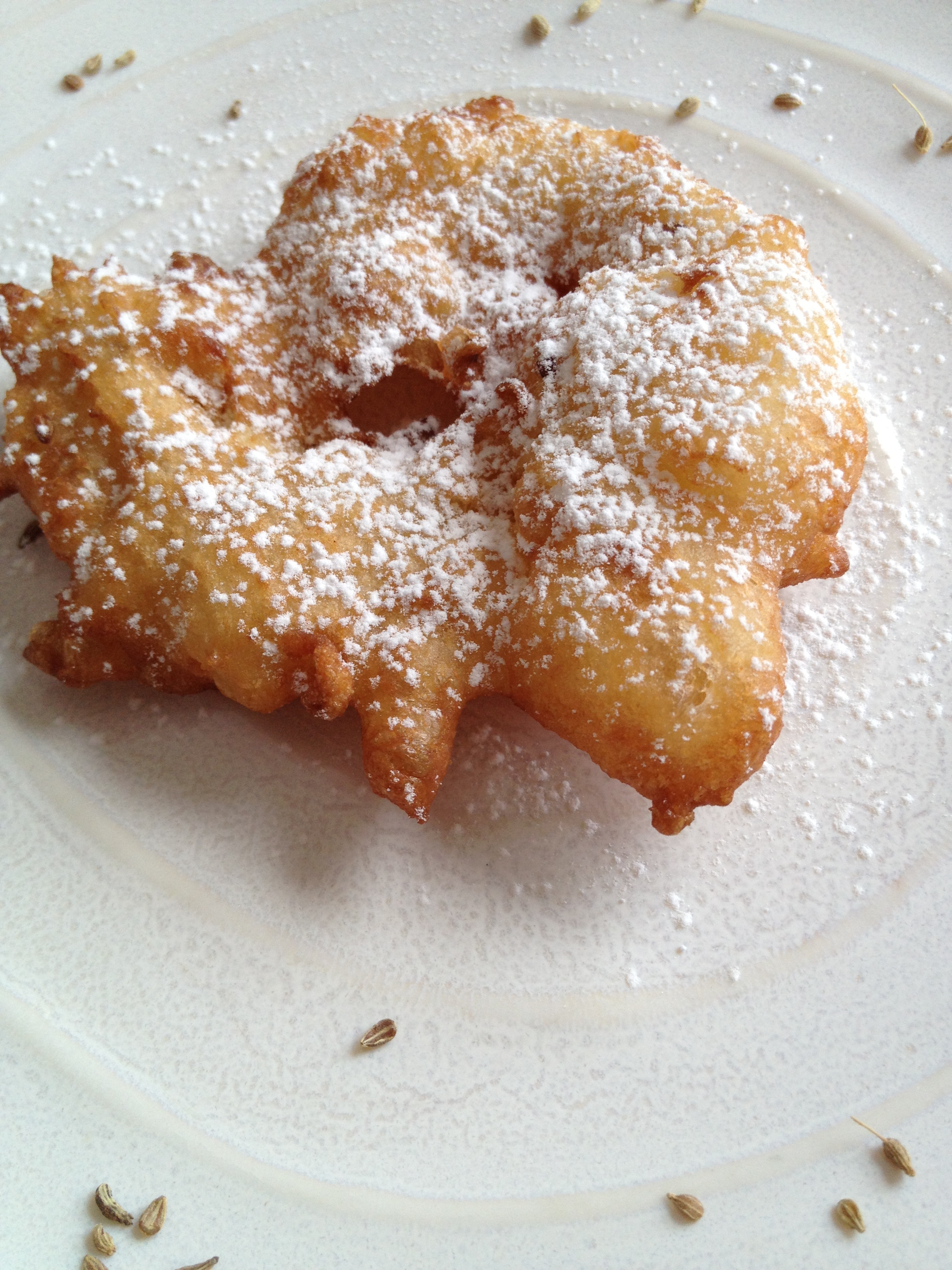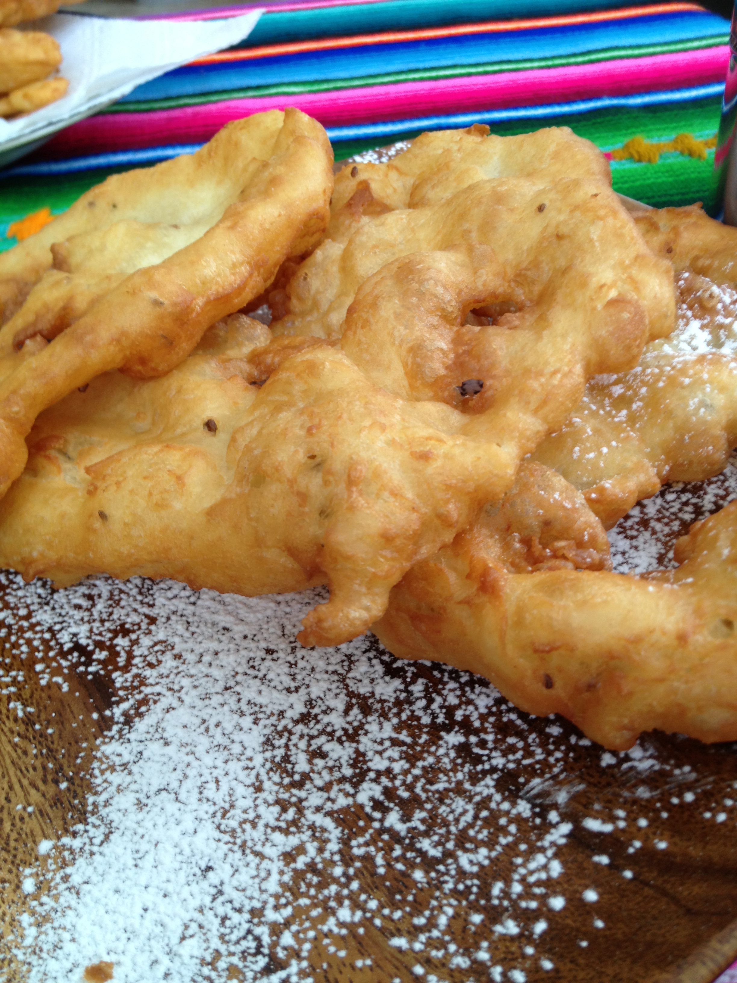 The dough should still be sticky, that is a good sign, but not liquid. To make the buñuelos. pass your fingers through the oil and take a small portion of the dough and shape the dough into round disks and poke holes in the middle. This takes some practice so don’t get to scared. You want them nice and round, very thin in the middle and thick at the edges.