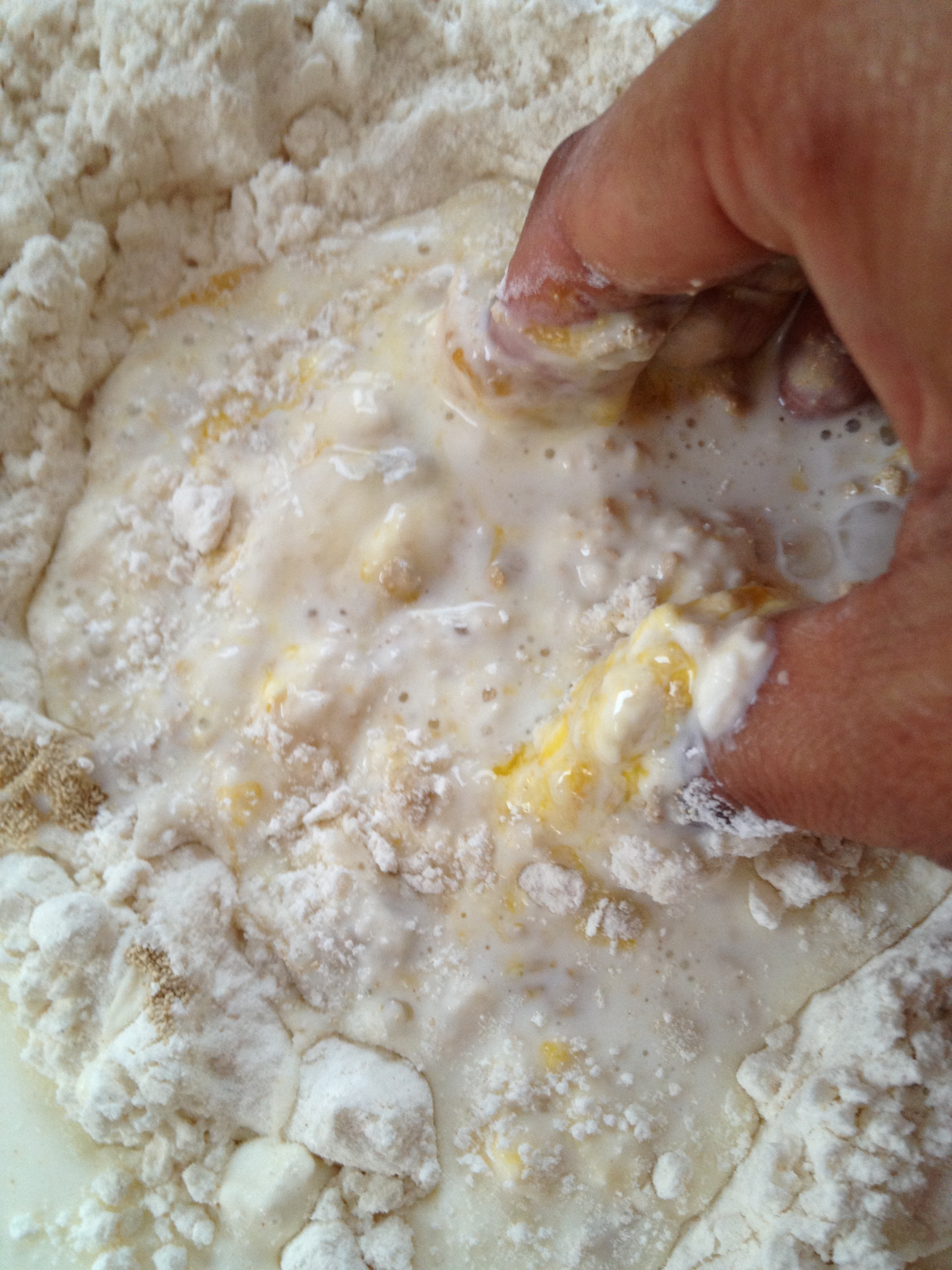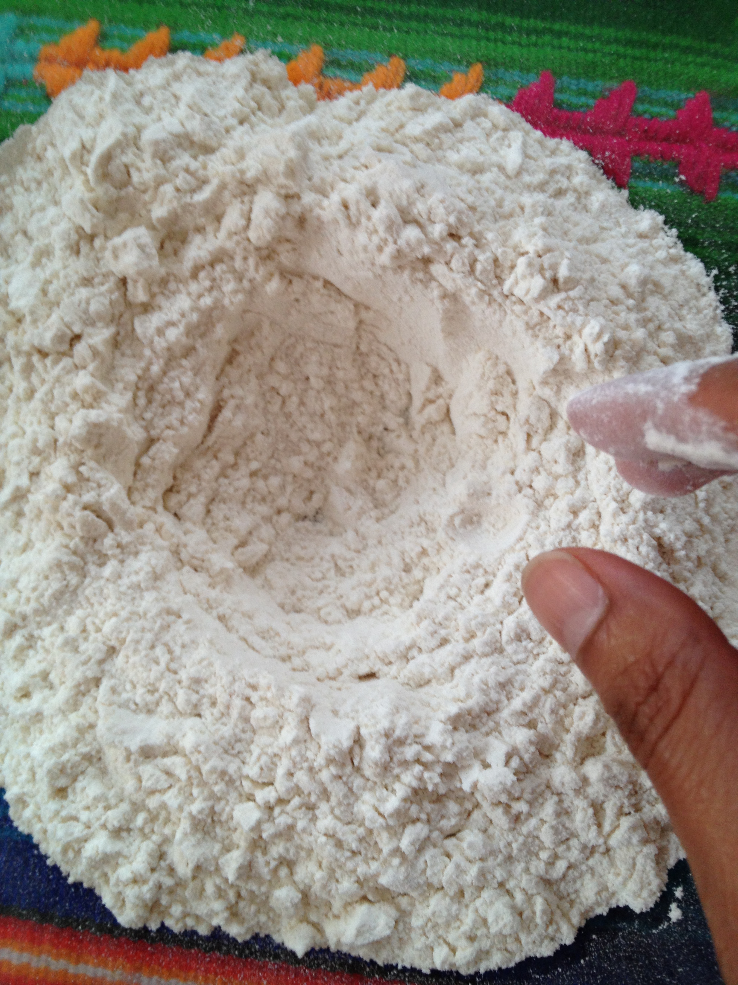 Sift the flour into a large bowl and make a crater shape in the middle.