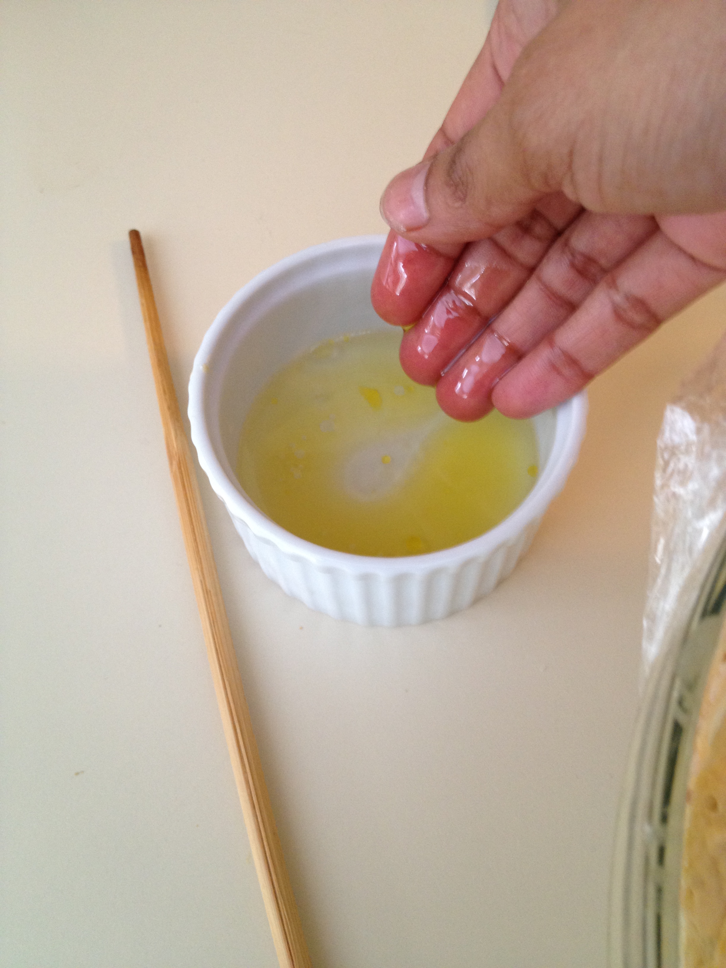 My mom usually mixes oil and water in a bowl to handle the dough. I like just oil because water and hot oil are not a good mix. While you shaping the dough poke some holes in the middle, this helps to cook faster. Do one at a time.