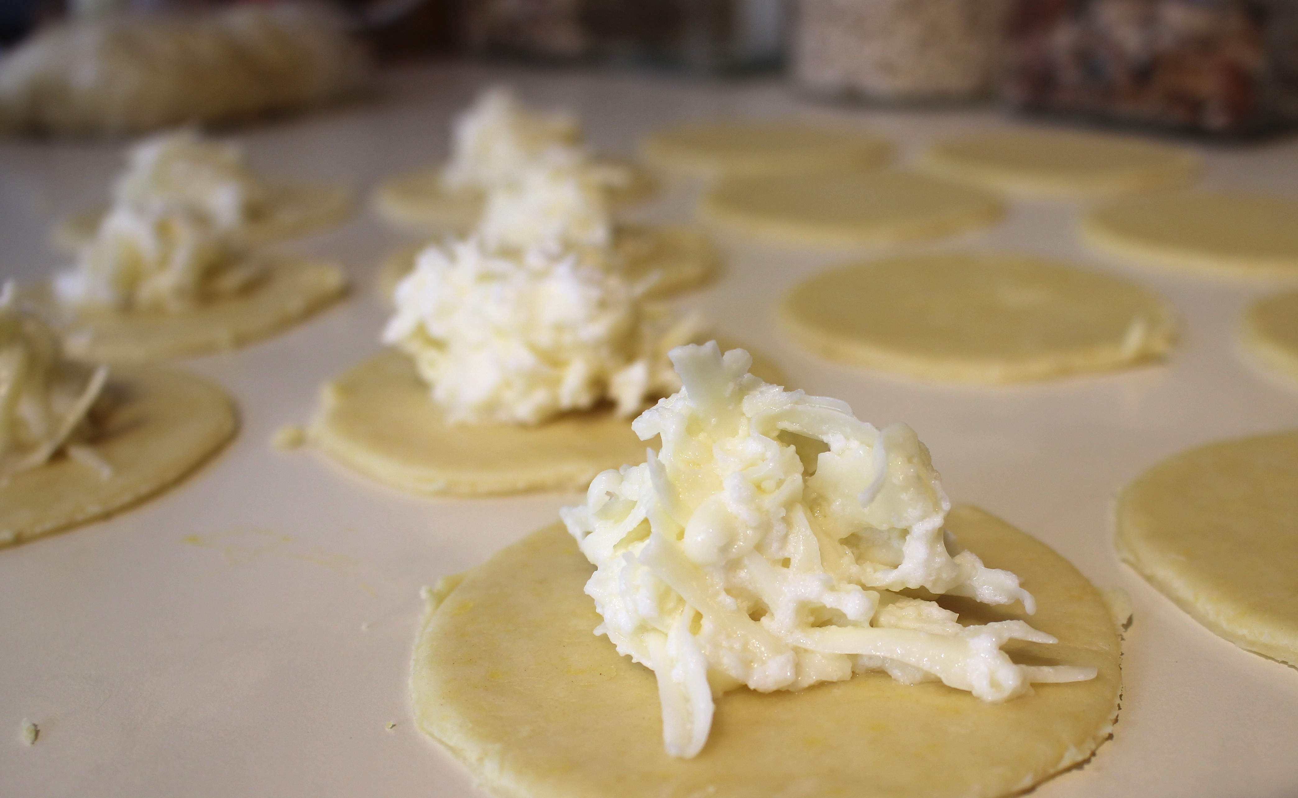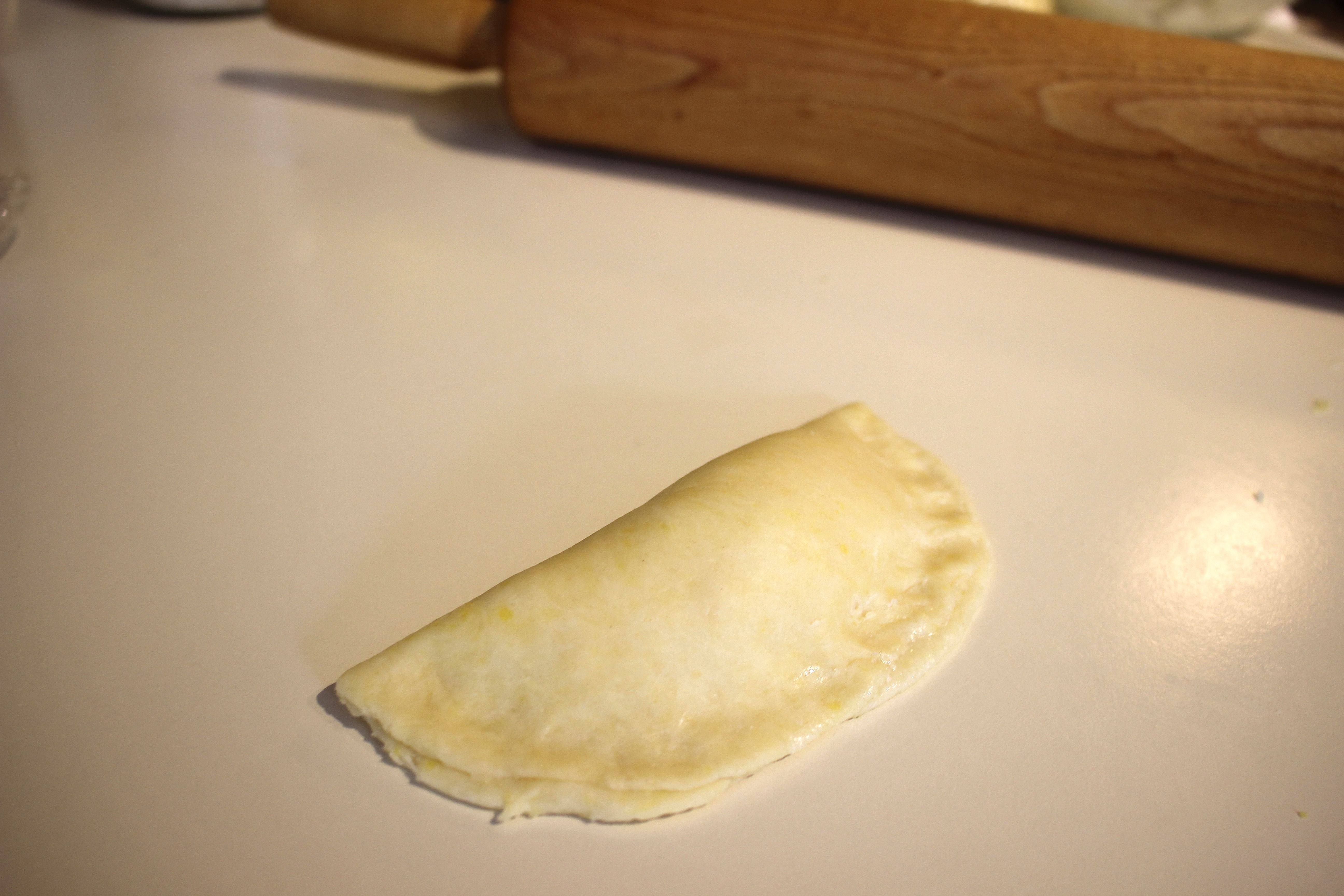 Put the filling on one far side of the rolled dough, around 1 tbsp.