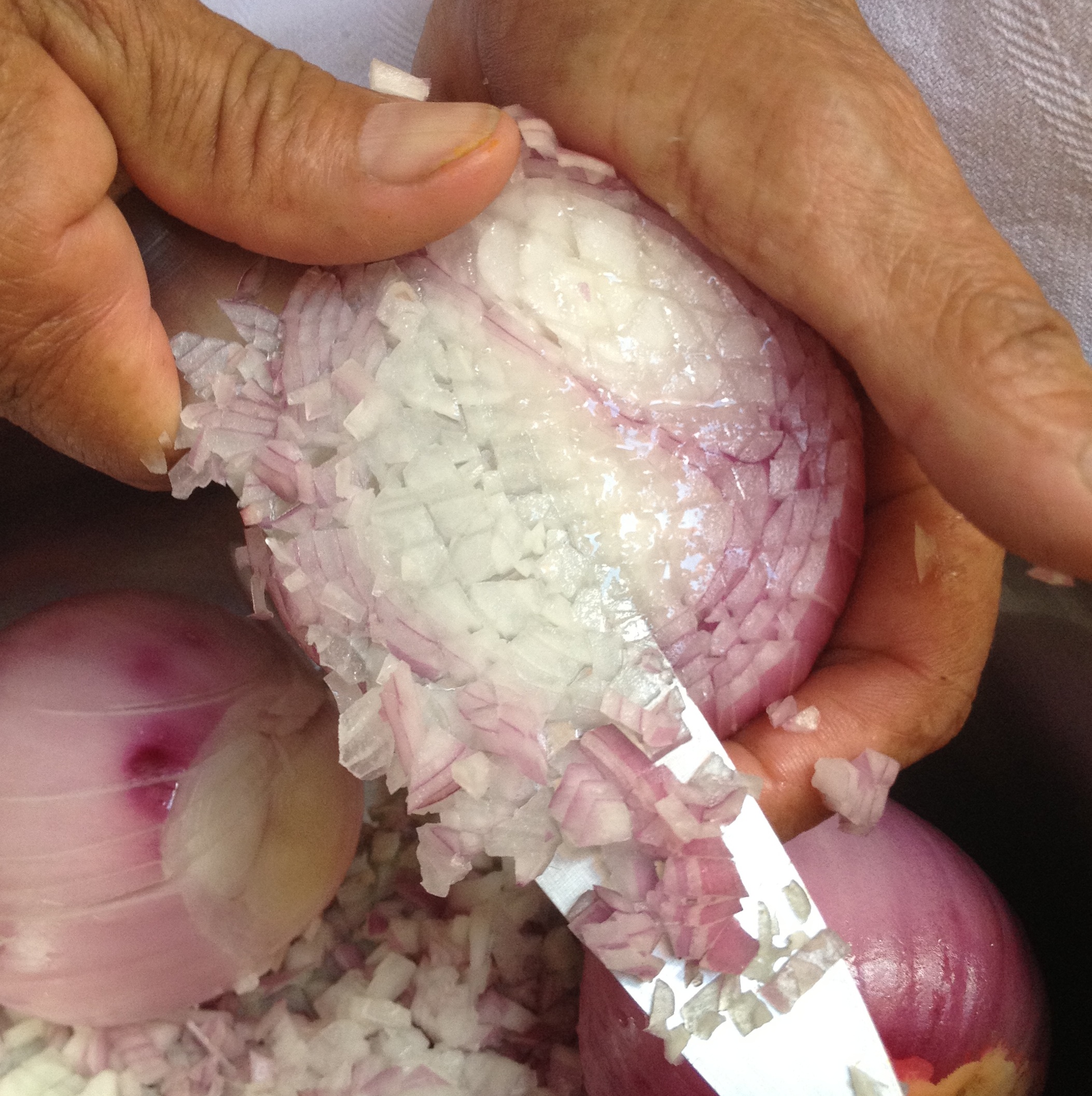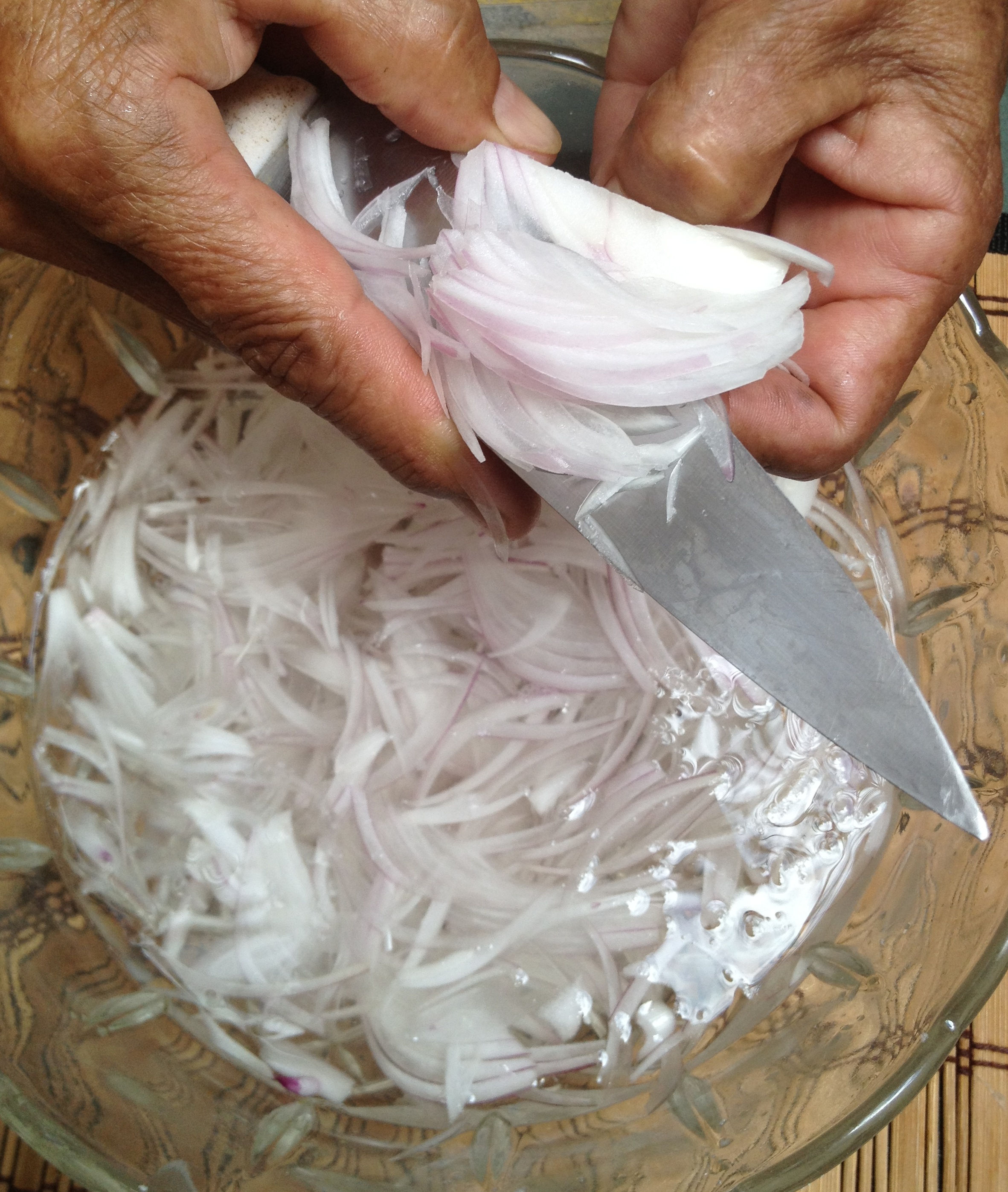 Cut the onion in “Juliana” style. Everyone says we should not wash the onion but since my mom always washes the onion, I do it that way too.