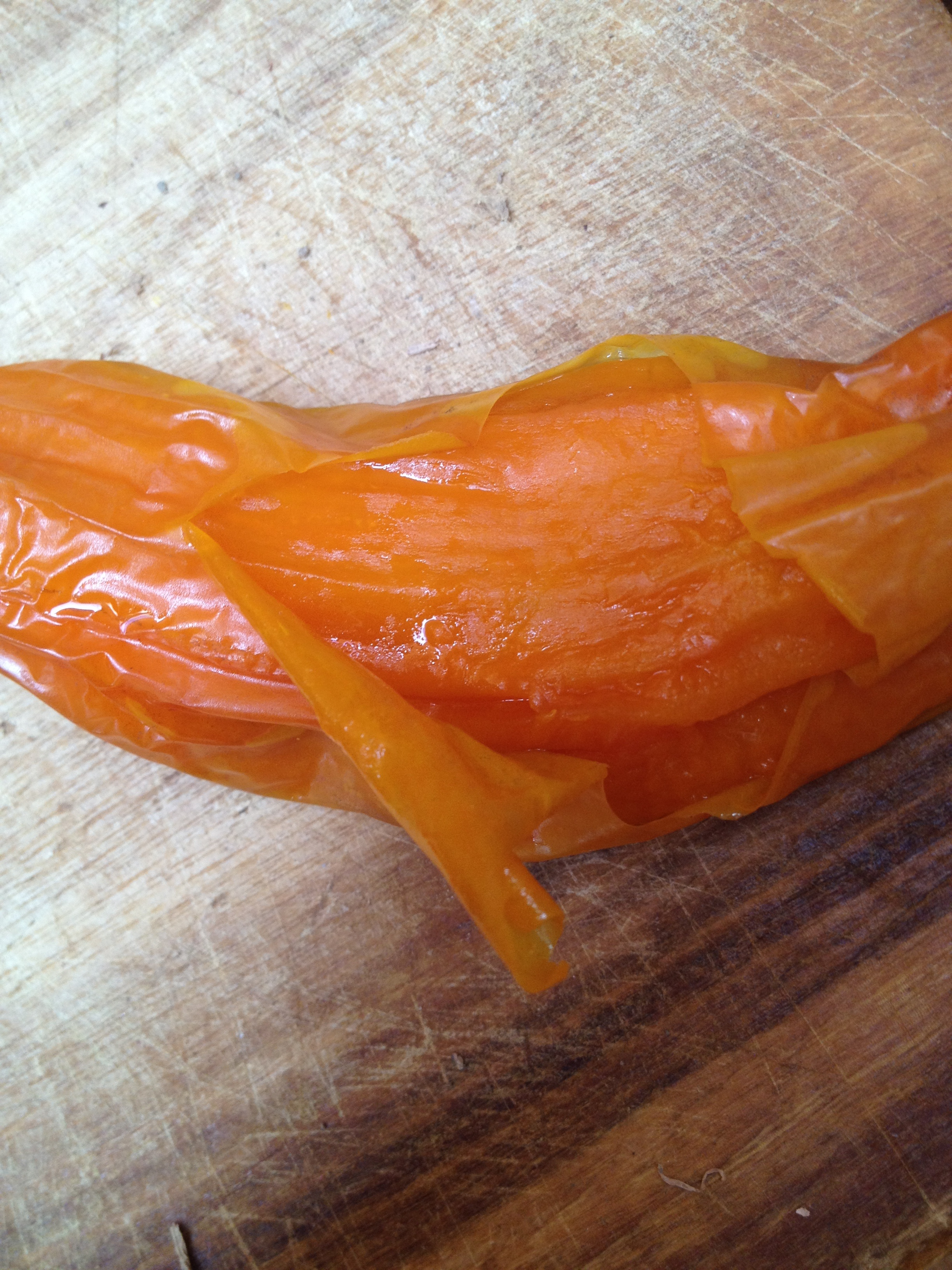 Take the peppers out of the hot water and put them in cold water. Take the skins off and the seeds (we recommend doing this with gloves).