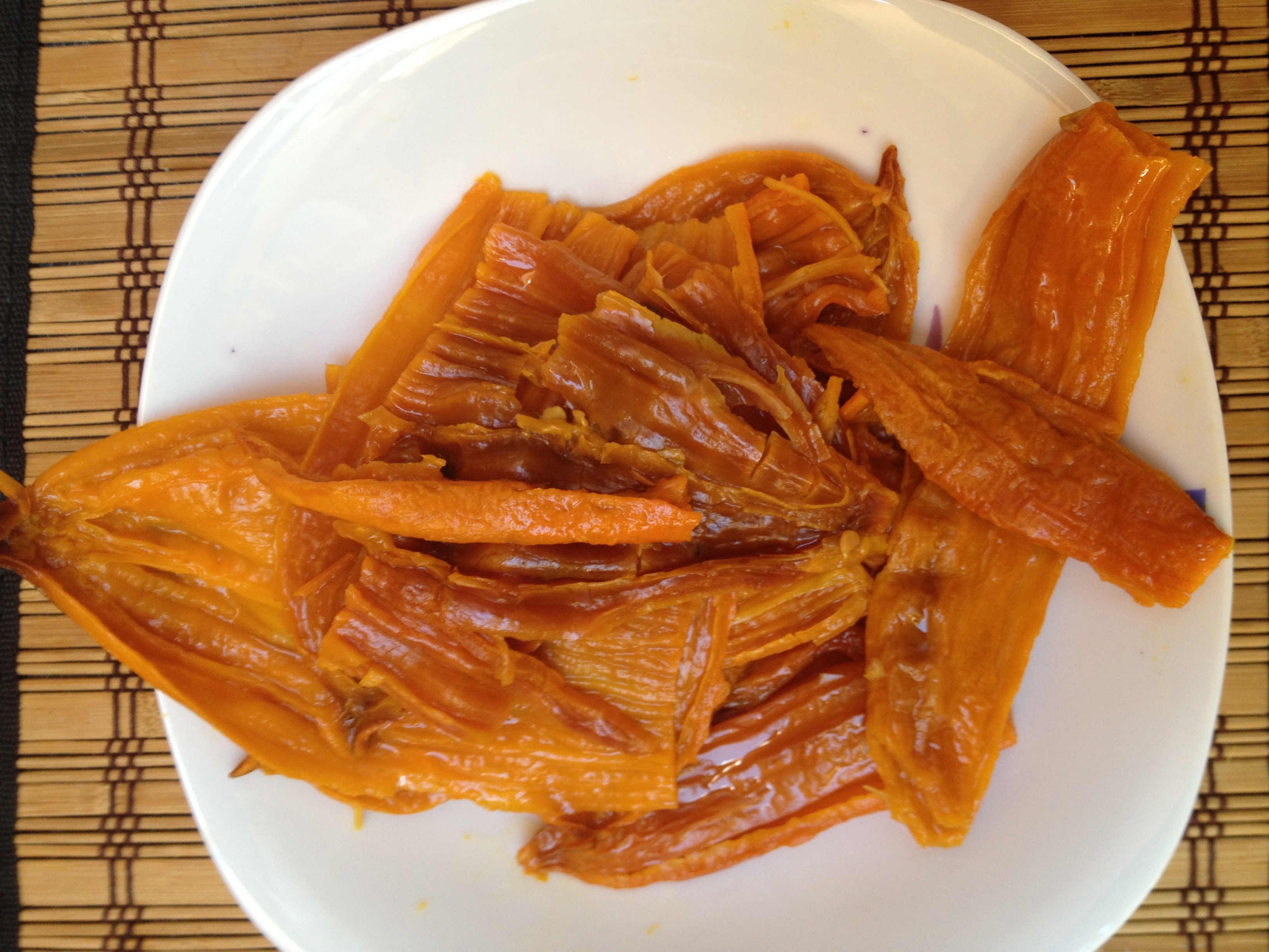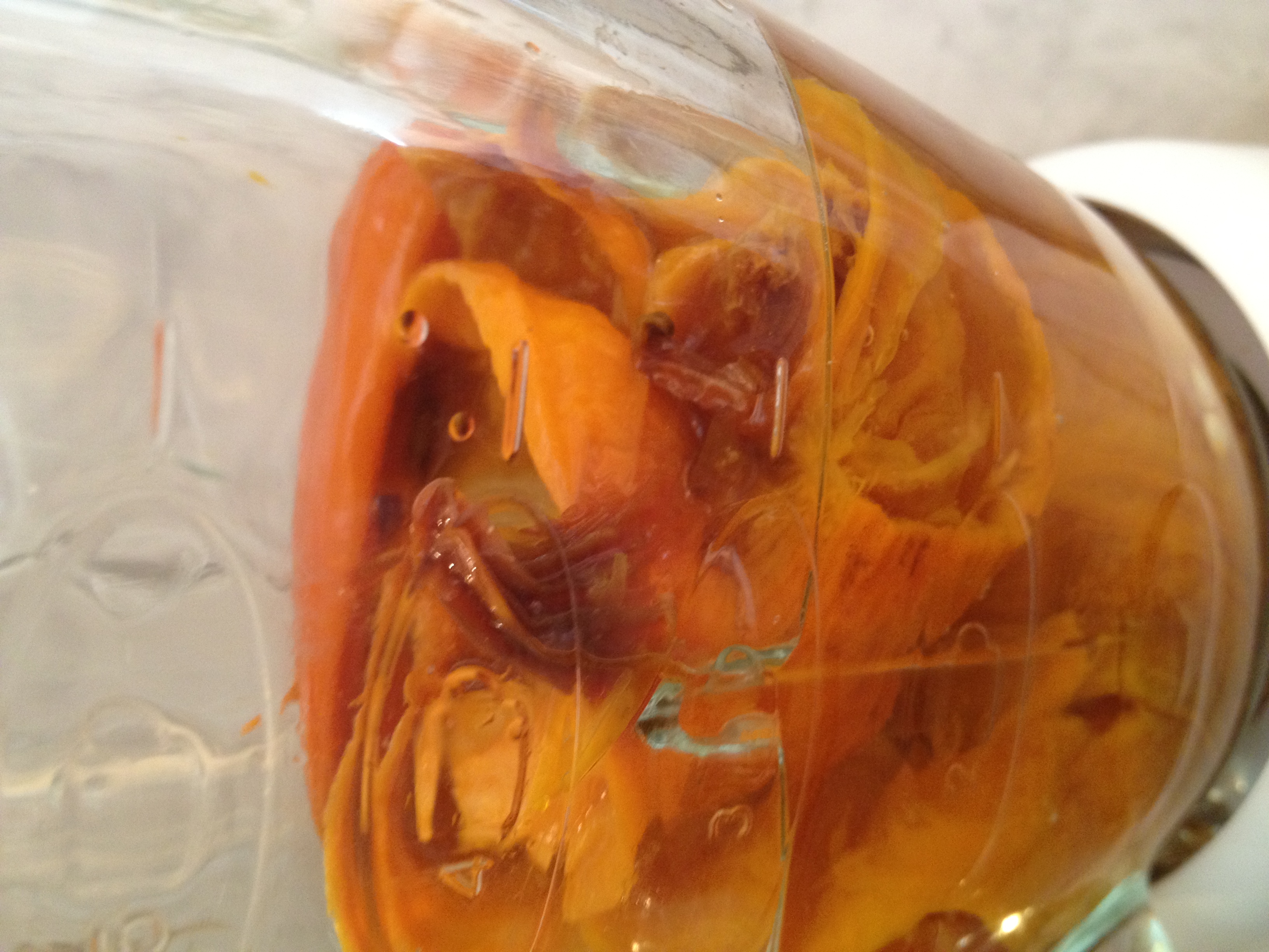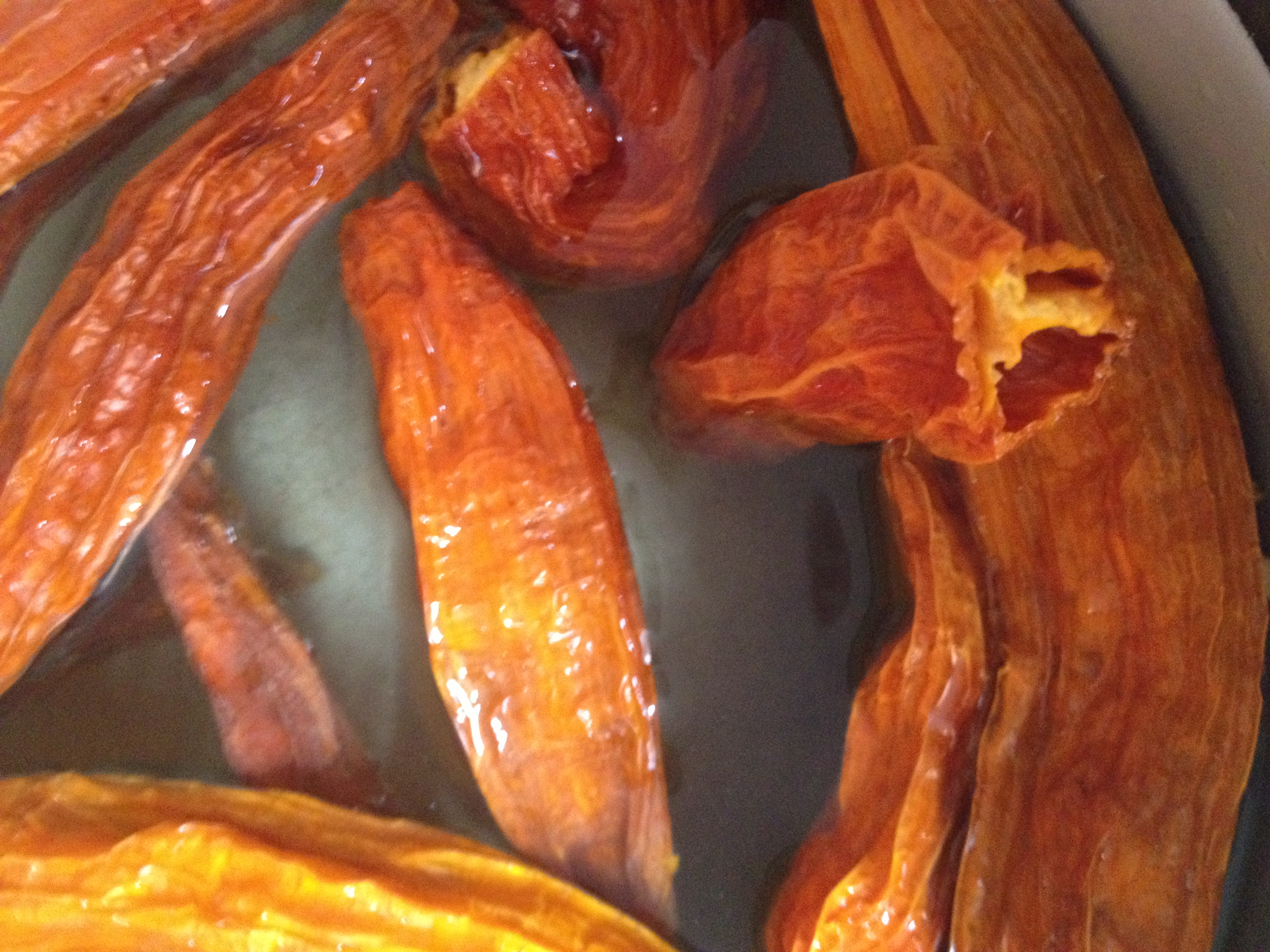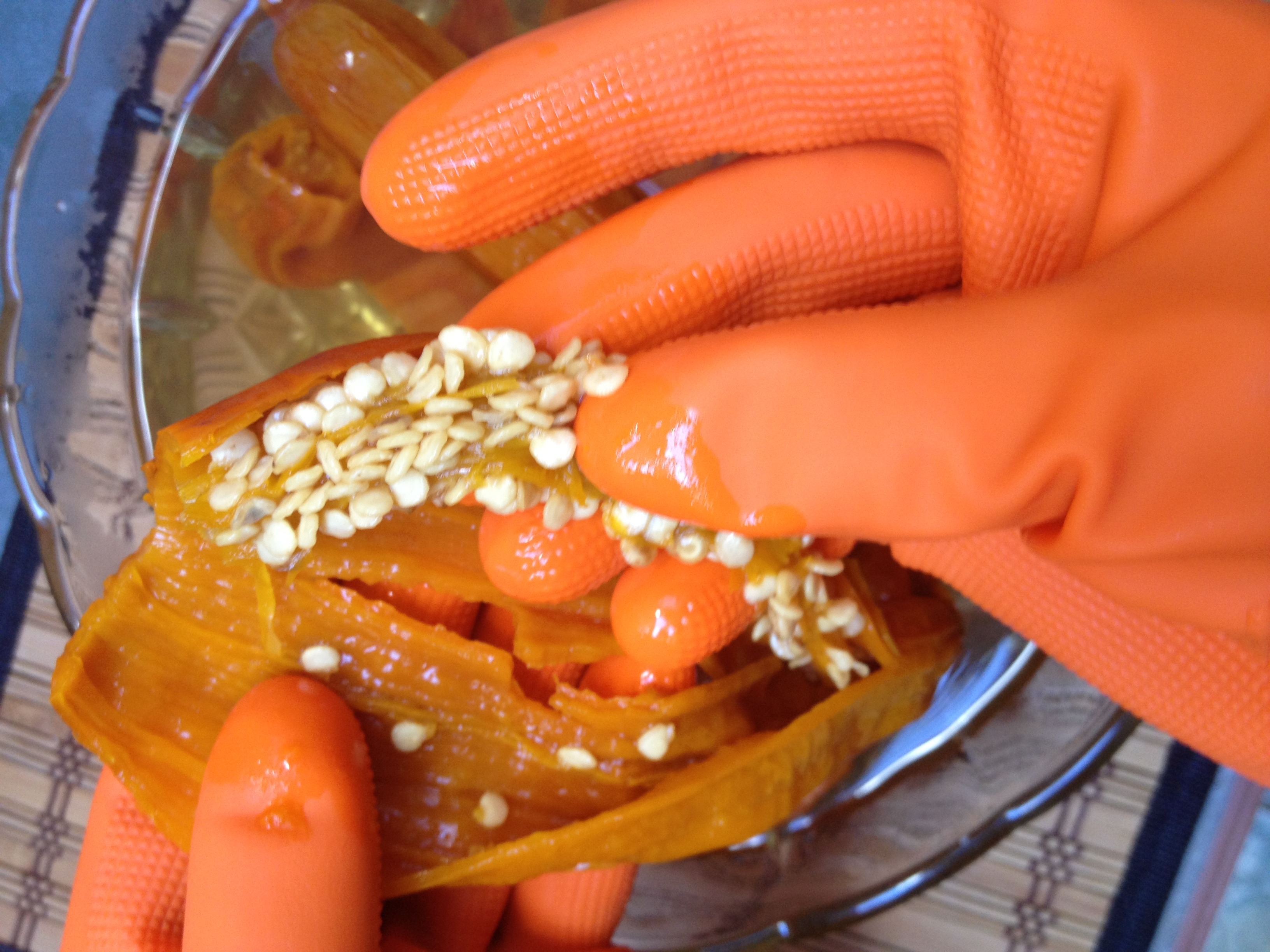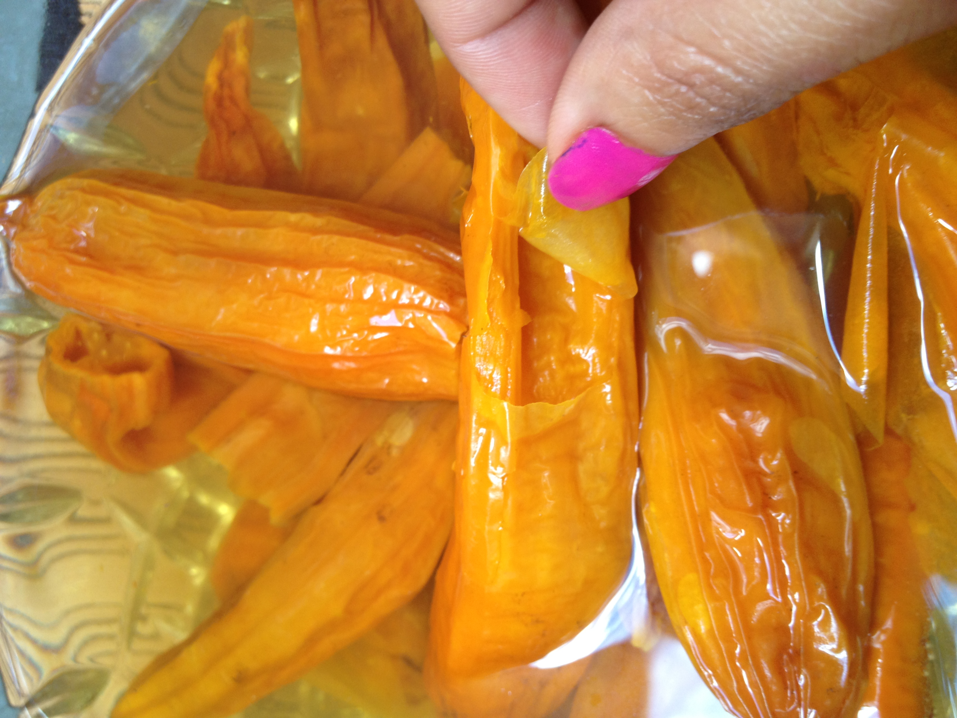 Cut the heads of the dry yellow peppers, remove the stems. Put them in water and let them boil for about 30 minutes. You will see the skins of the peppers start getting loose. That is when you know that they are ready.