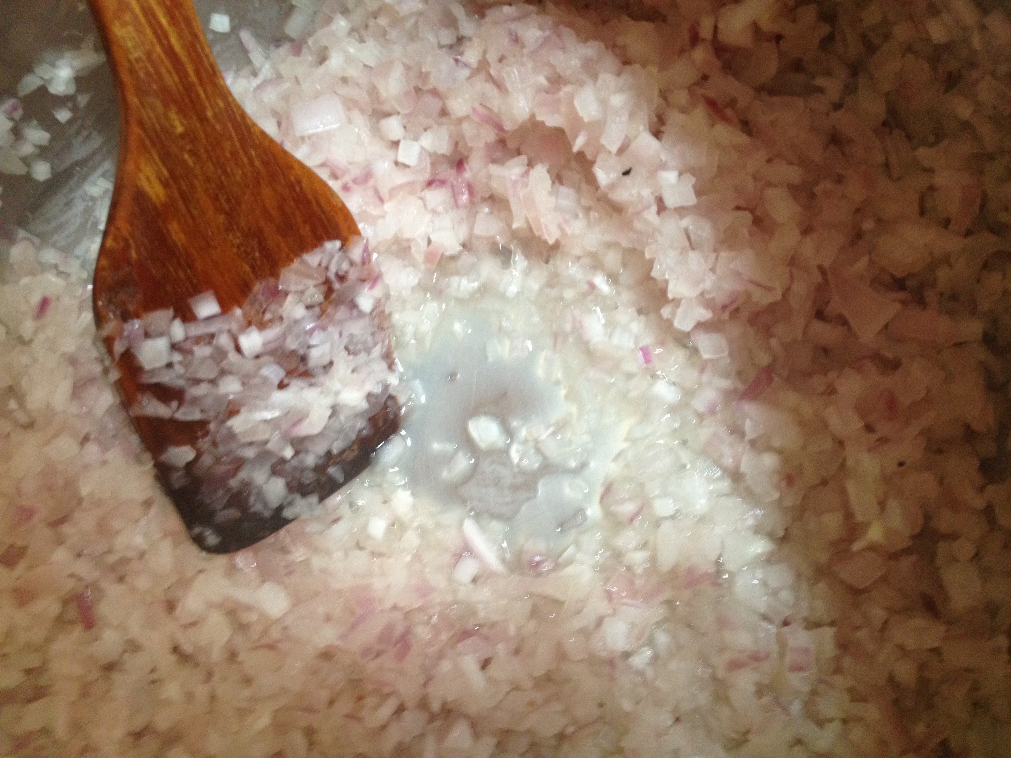 Meanwhile, chop the onions really small put them in in a large pot and cook for about 5 min. Add 2 tbsp of salt and cook until it dries. Add the oil and cook until it is dry again.