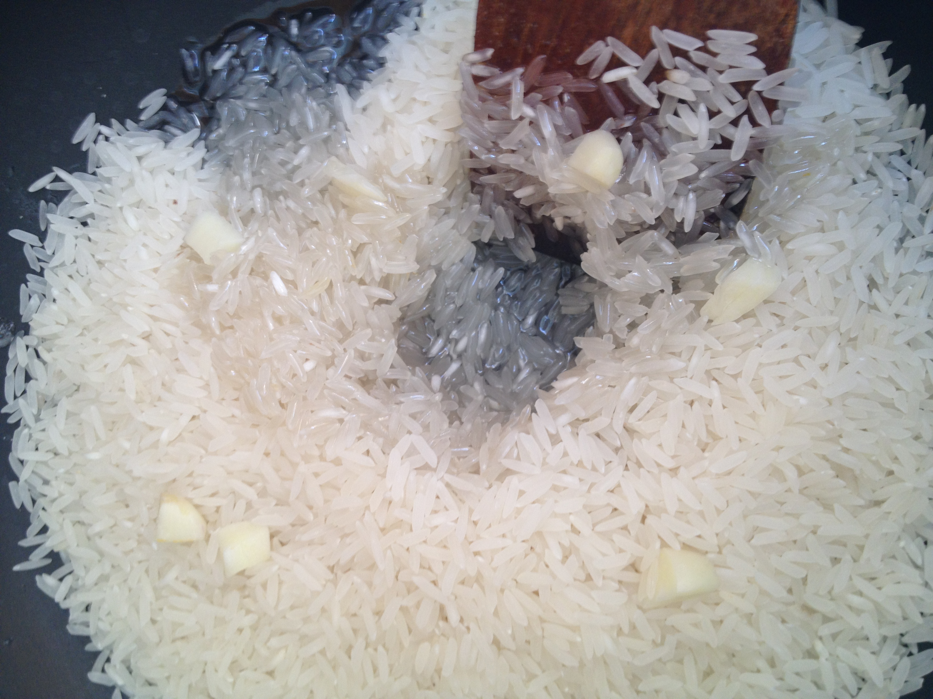 Heat a frying pan and add the rice and peeled, diced garlic and the oil.