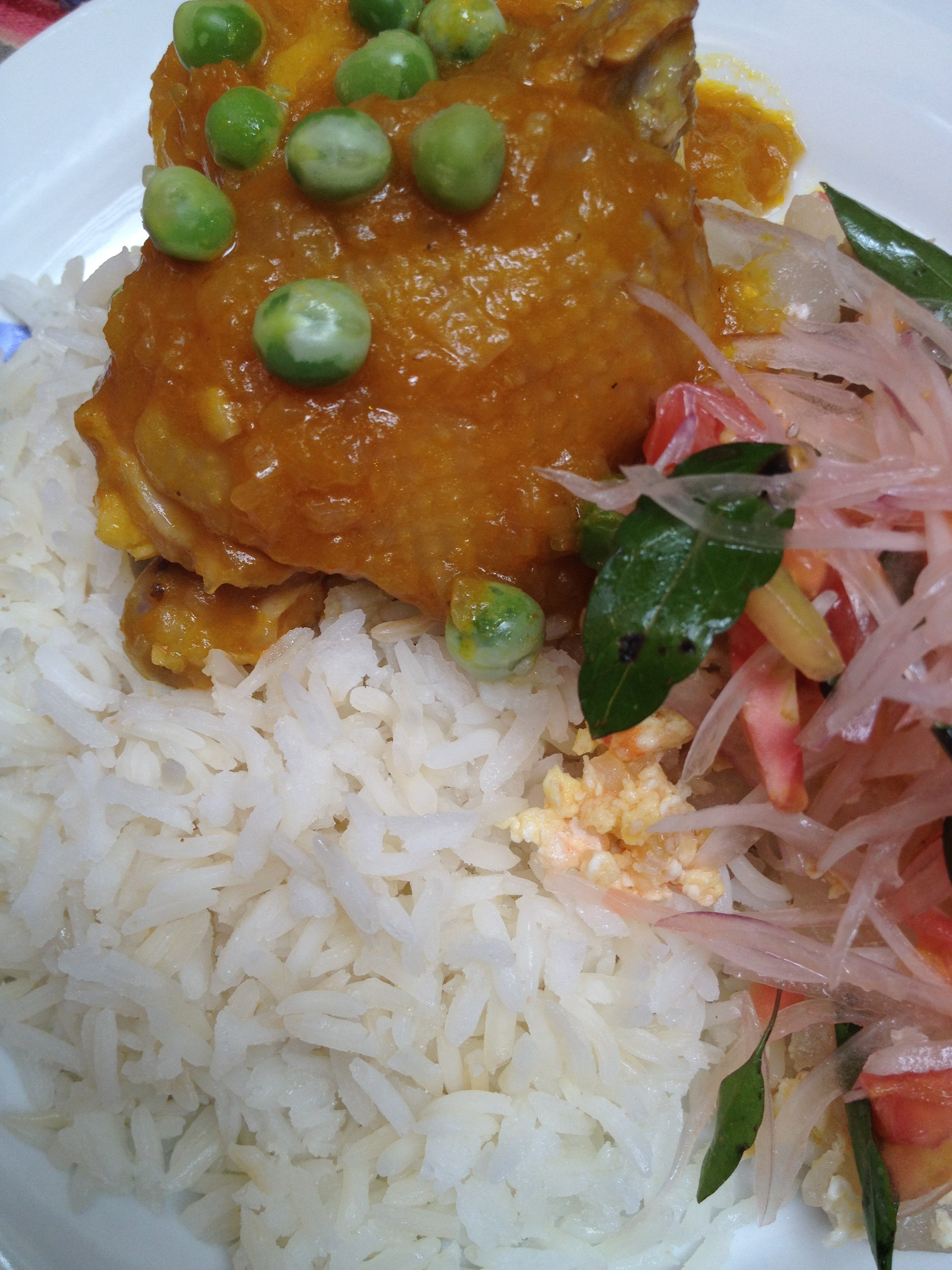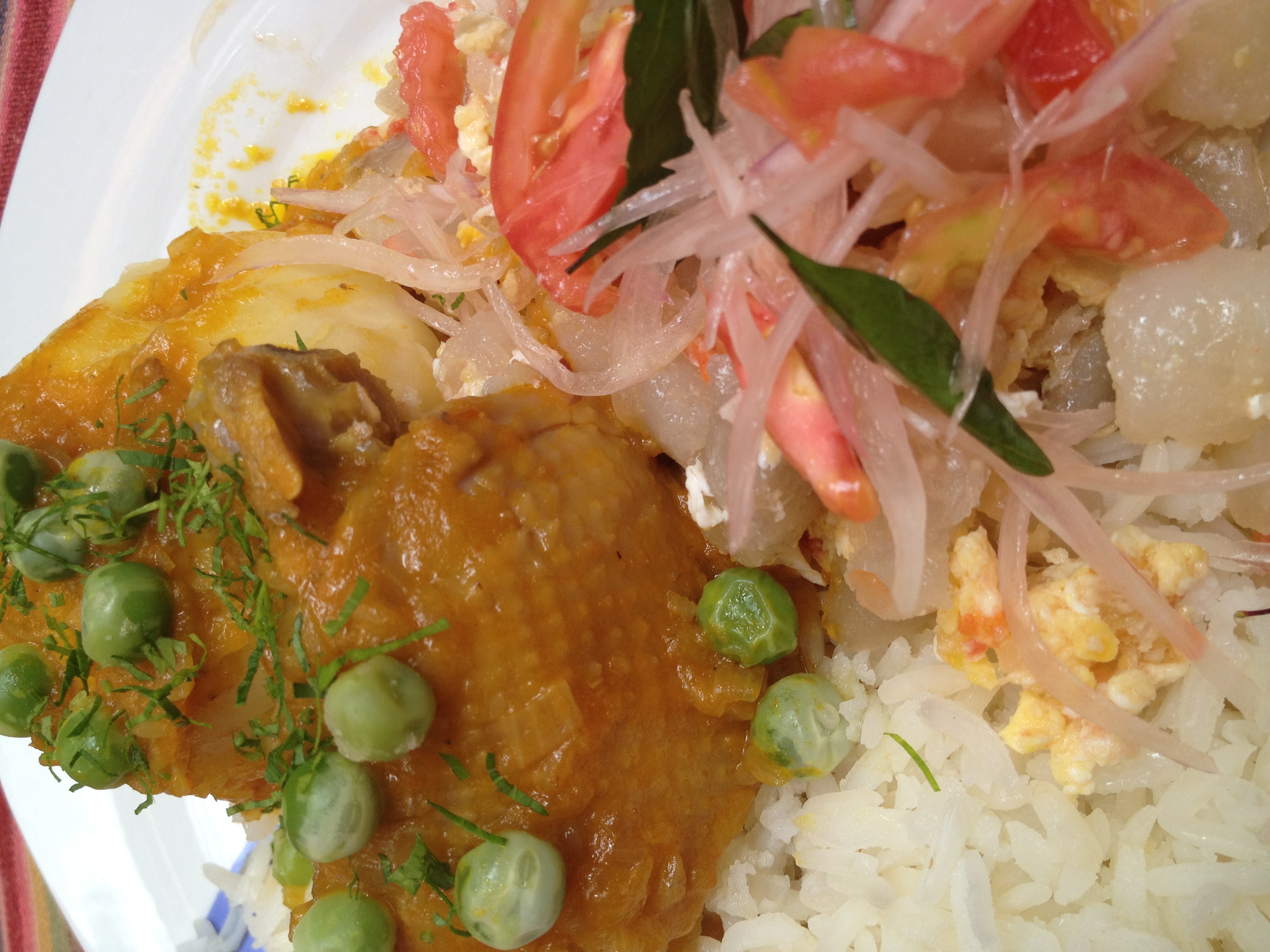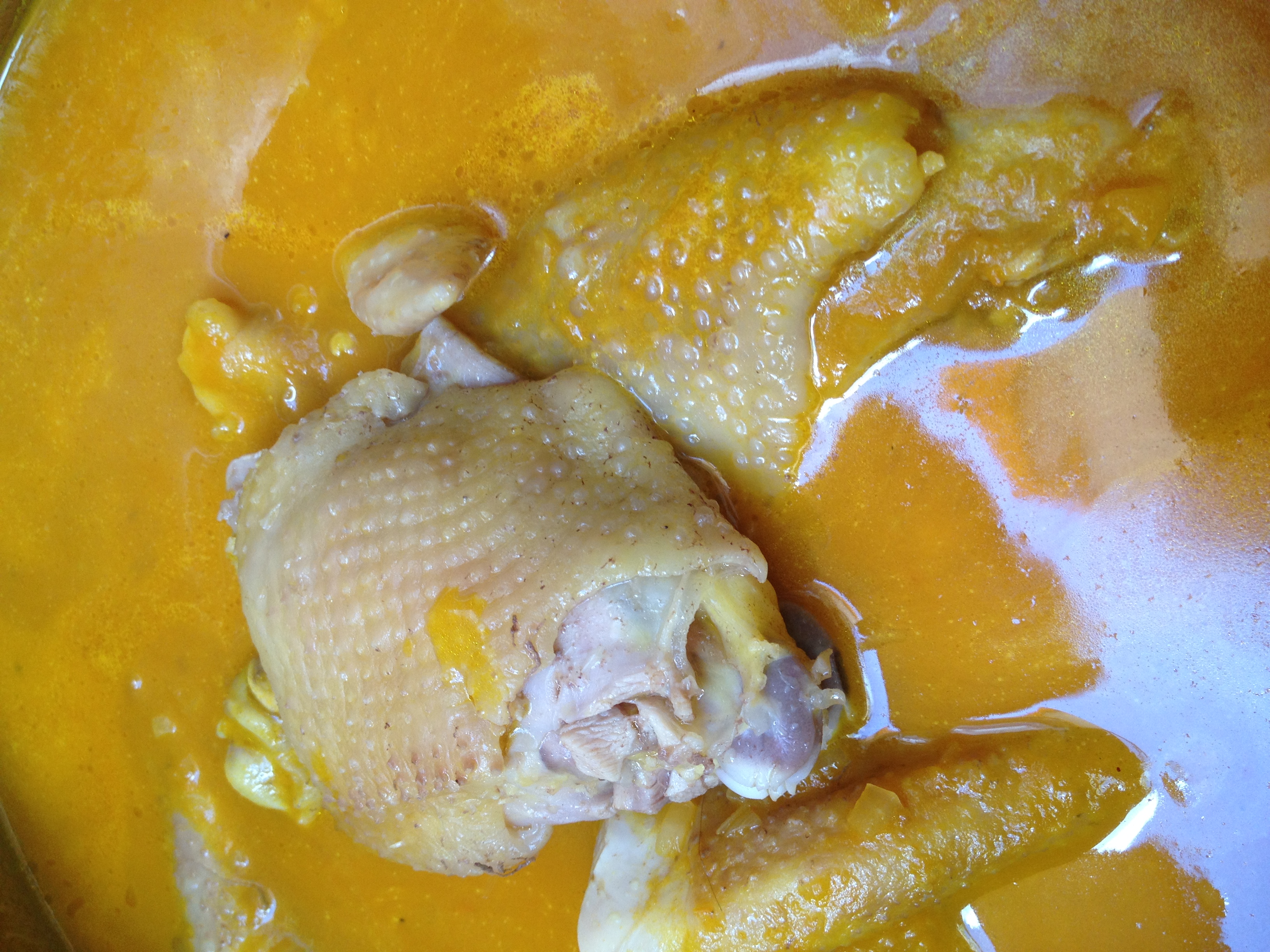Meanwhile, grind the garlic with the cumin in a morter until it is very smooth. Add this preparation to the onion and yellow pepper sauce. Let it cook for about 15 min until the onion is well cooked and soft. My mon says the best way to know is when the onion starts sticking slightly in the bottom. Add the chicken at this moment, and reduce the heat to low. Let it cook for around 20 min until the chicken is tender, stirring from time to time so it doens’t burn on the bottom.