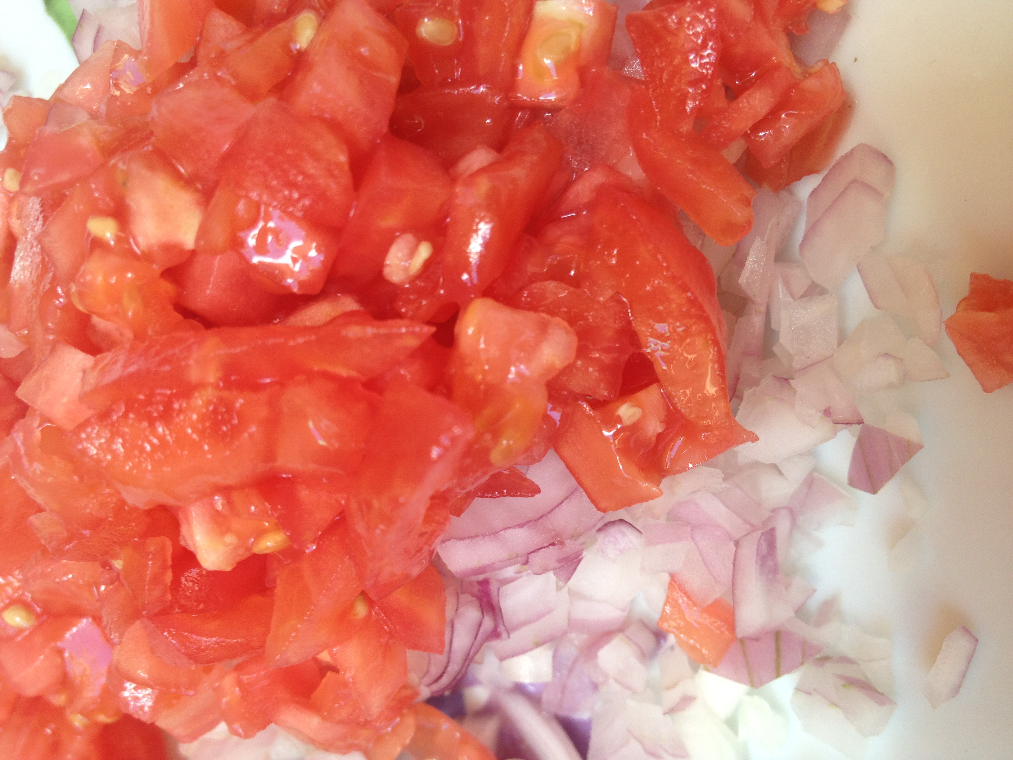 Rinse and peel the tomatoes. Cut them same way as the onion.