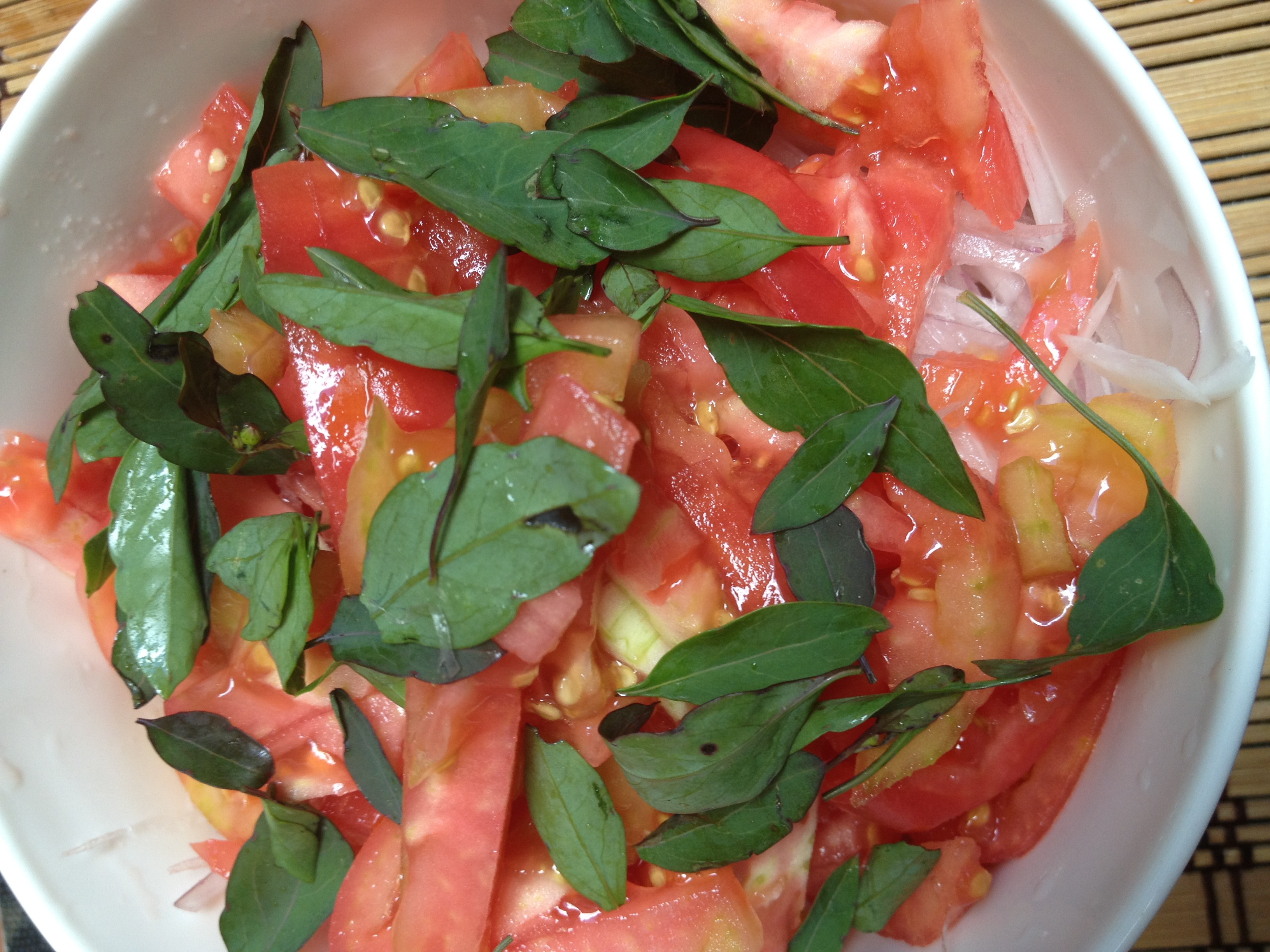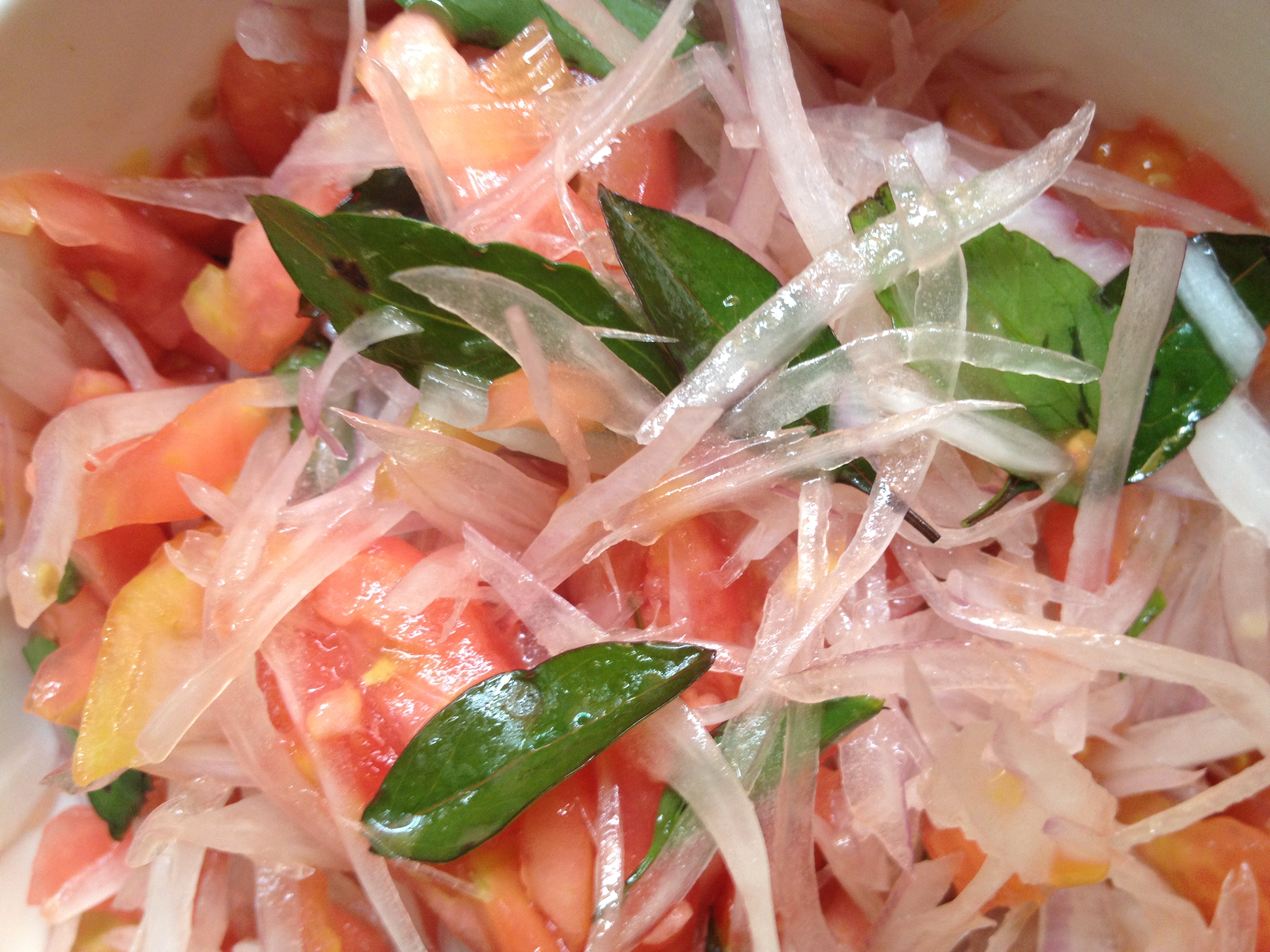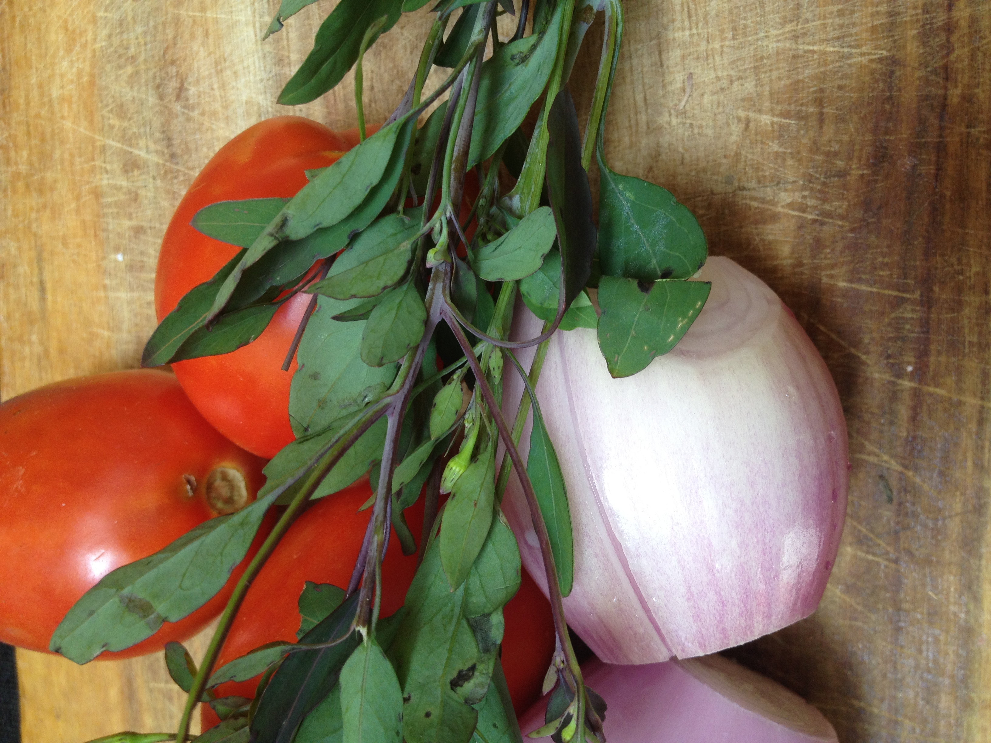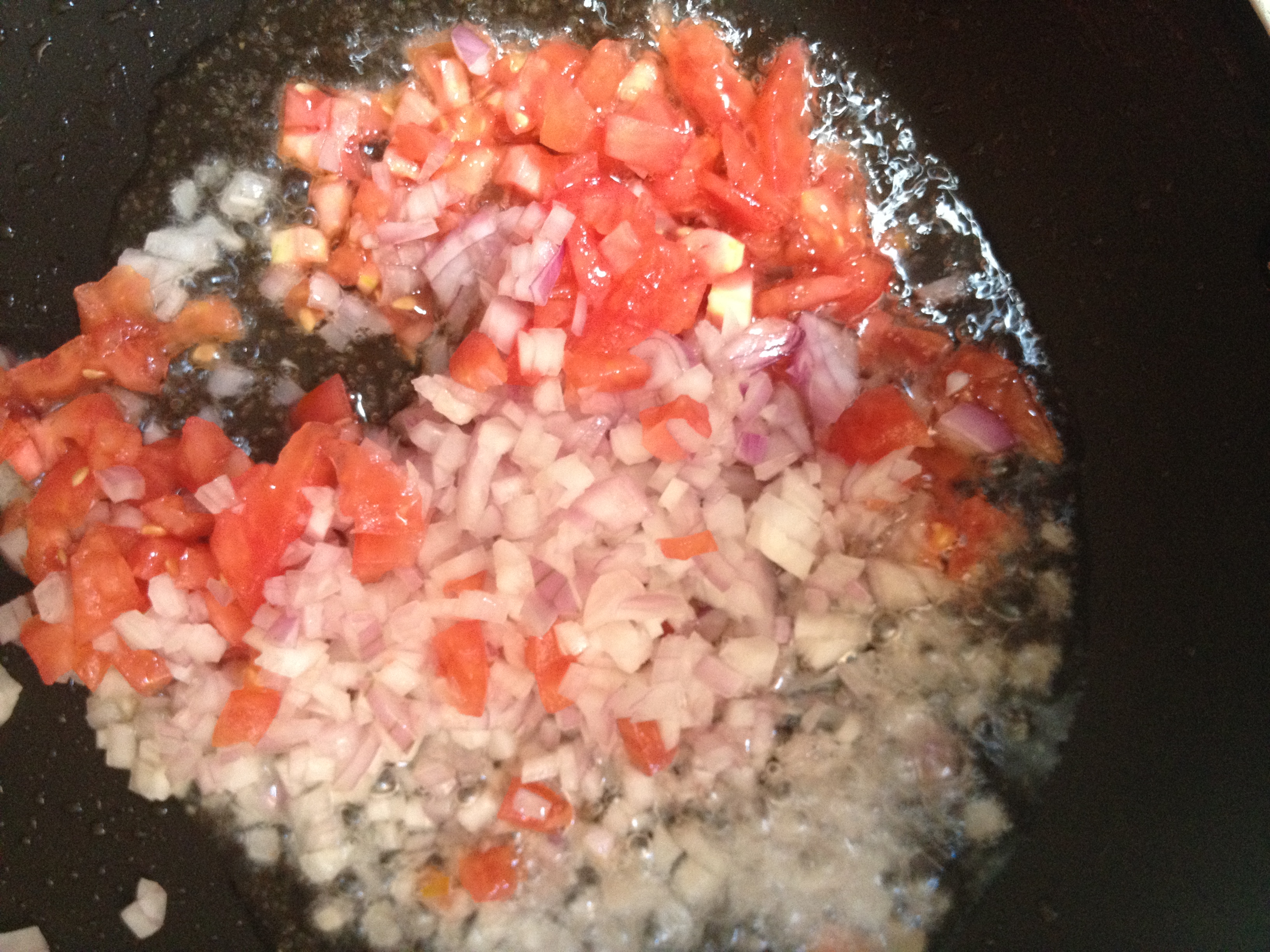Cook the onion and tomato with the oil and salt. Cook until onion looks wrinkly.