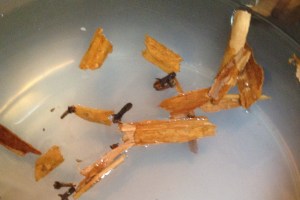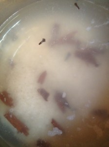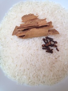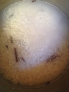 Put the water in a large pot and add the cloves and cinnamon. Let it boil for 5 min and add the rice. Stir to make sure that it doesn’t stick in the bottom. It needs to be cooked in water first for about 10 min.