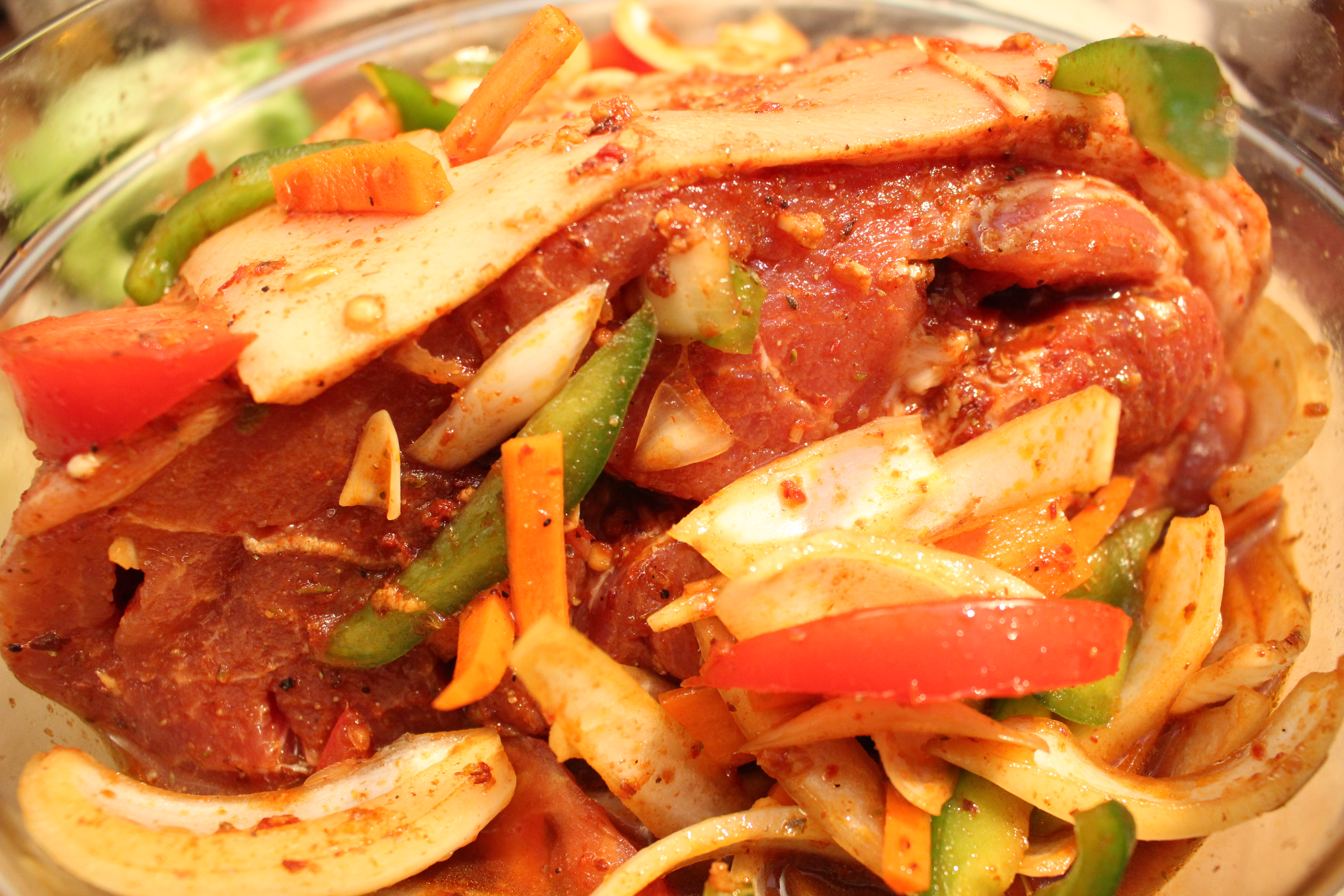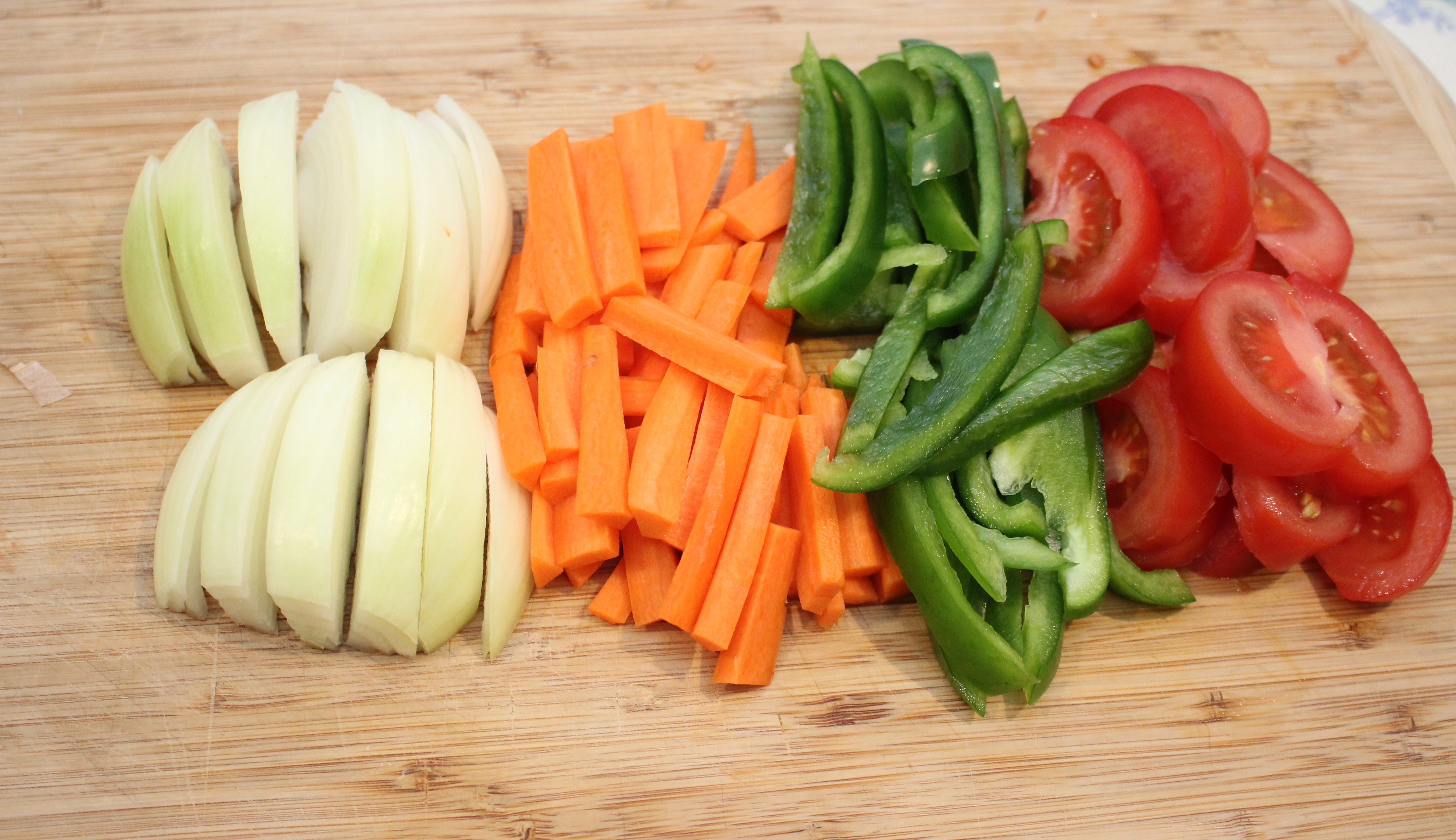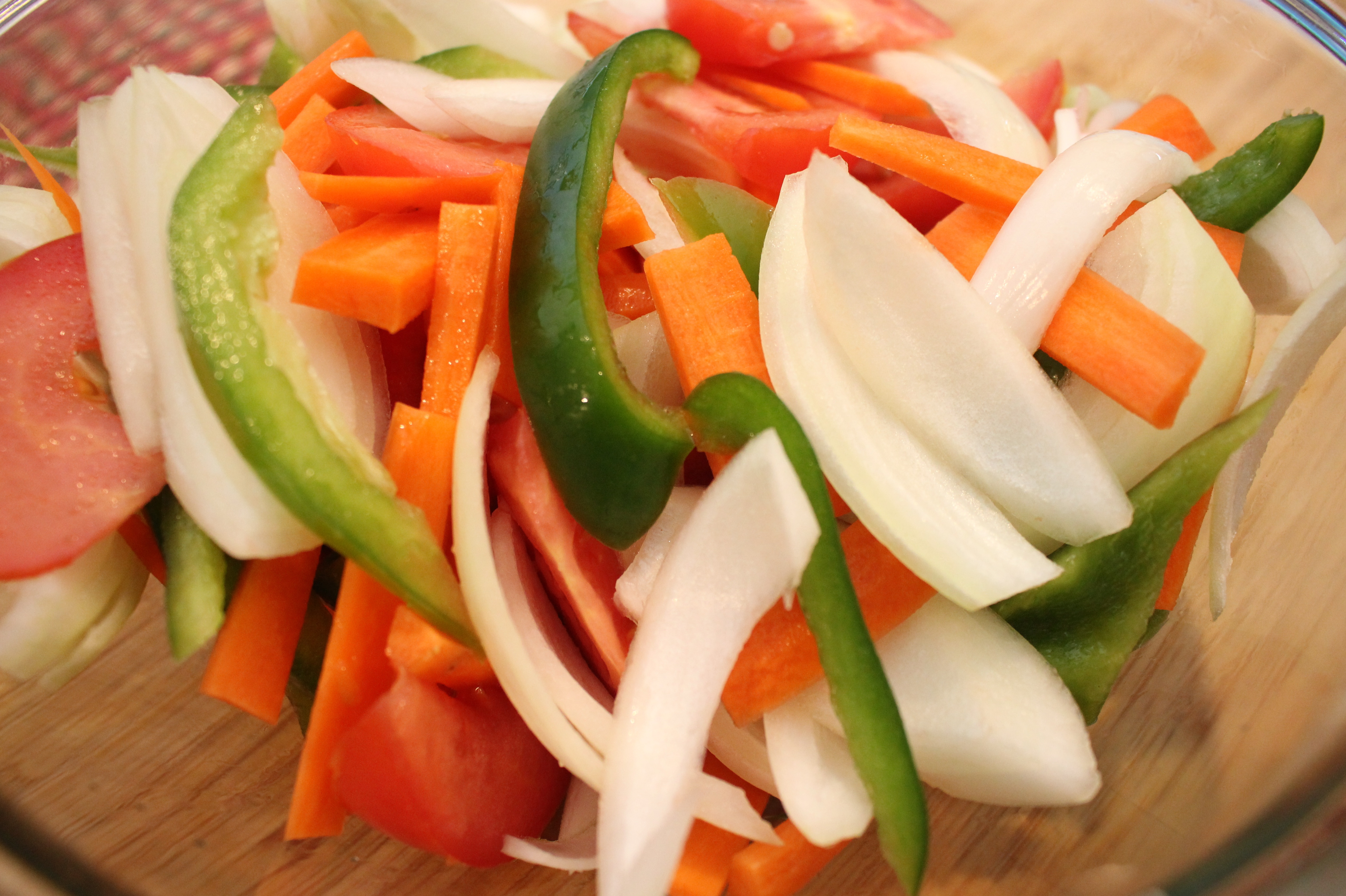 Cut the carrots, tomato, and pepper in a large thick size, about 1/2 inch thick. Put them in a large bowl and mix. Set aside.