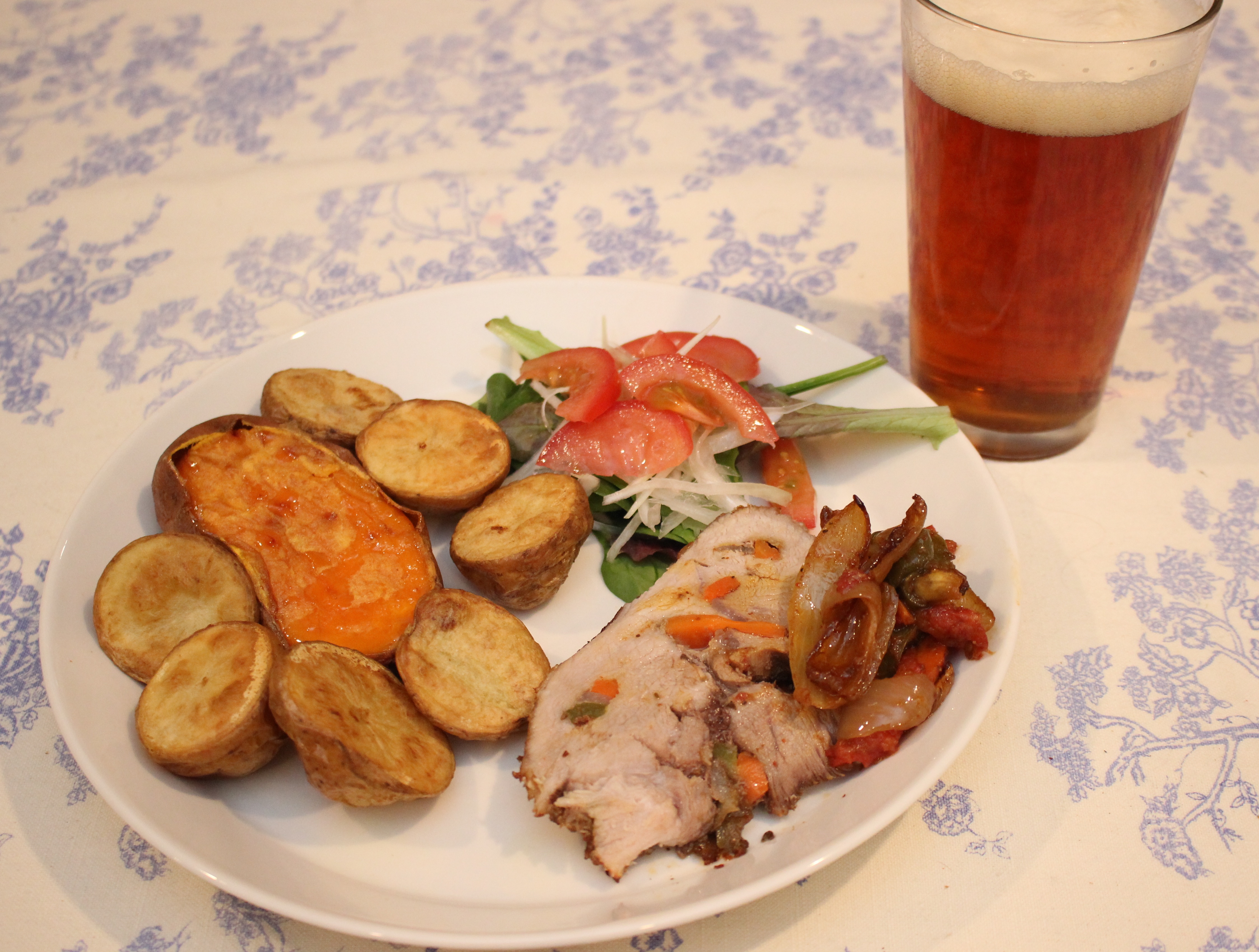 One hour before the ham is ready, roast the potatoes with their skin on and cut them in half at 375F. Prepare the salad.