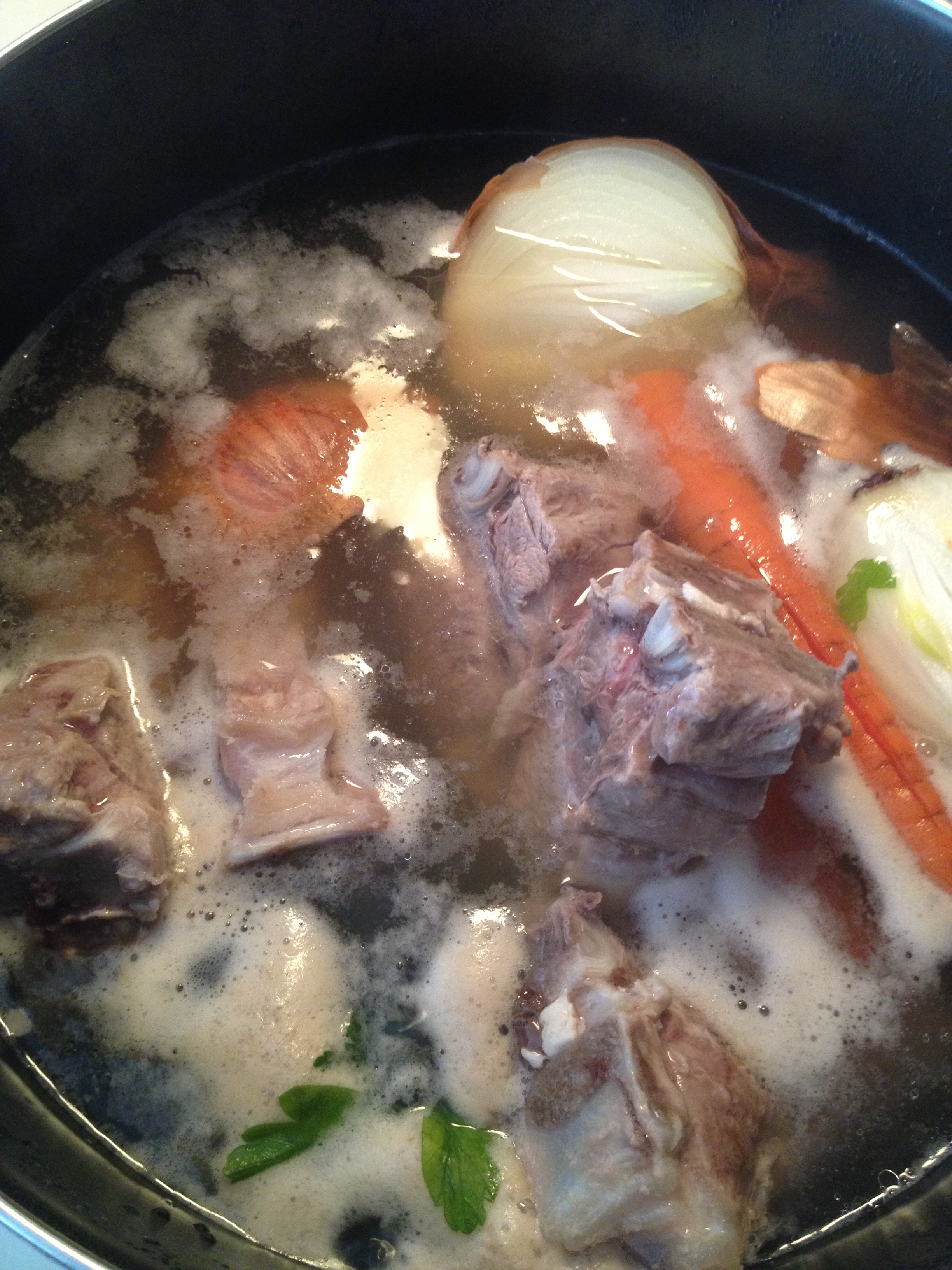 Put together the ingredients and clean the lamb of extra fat or nerves. Put the six cups of water in a large pot and let it get warm. Before it starts boiling add the pieces of lamb, onion, carrot and parsley. Let it simmer for an hour.