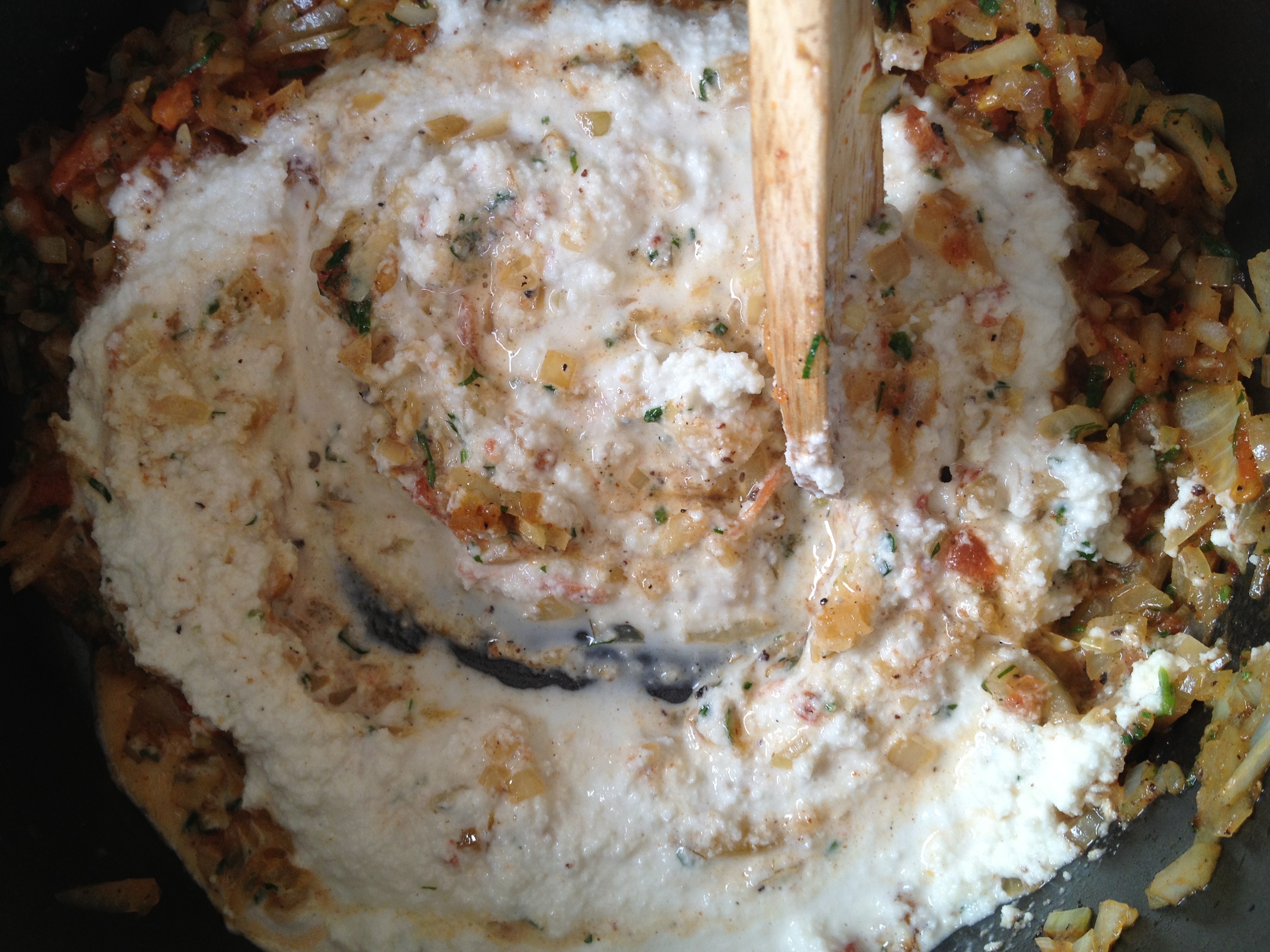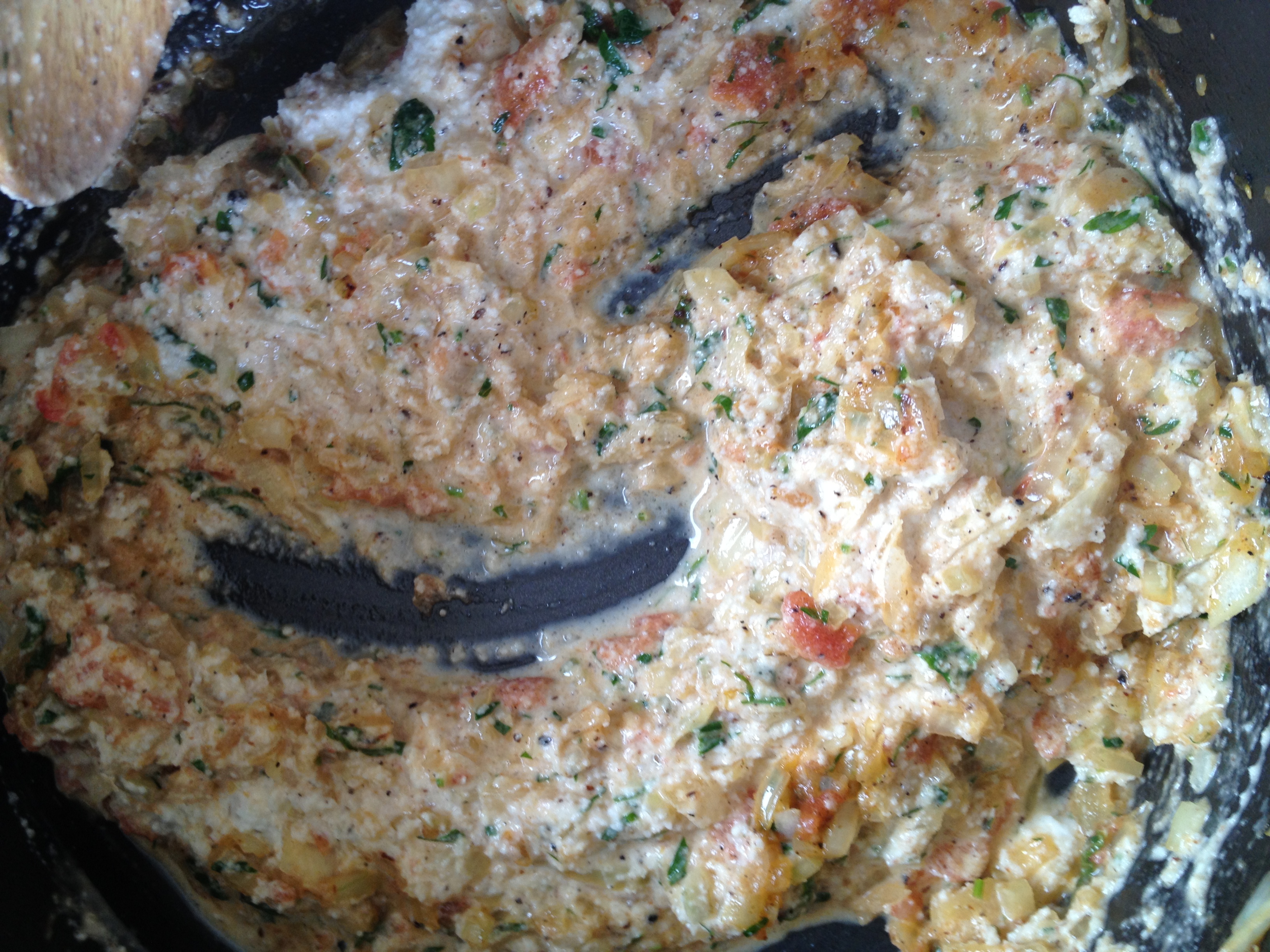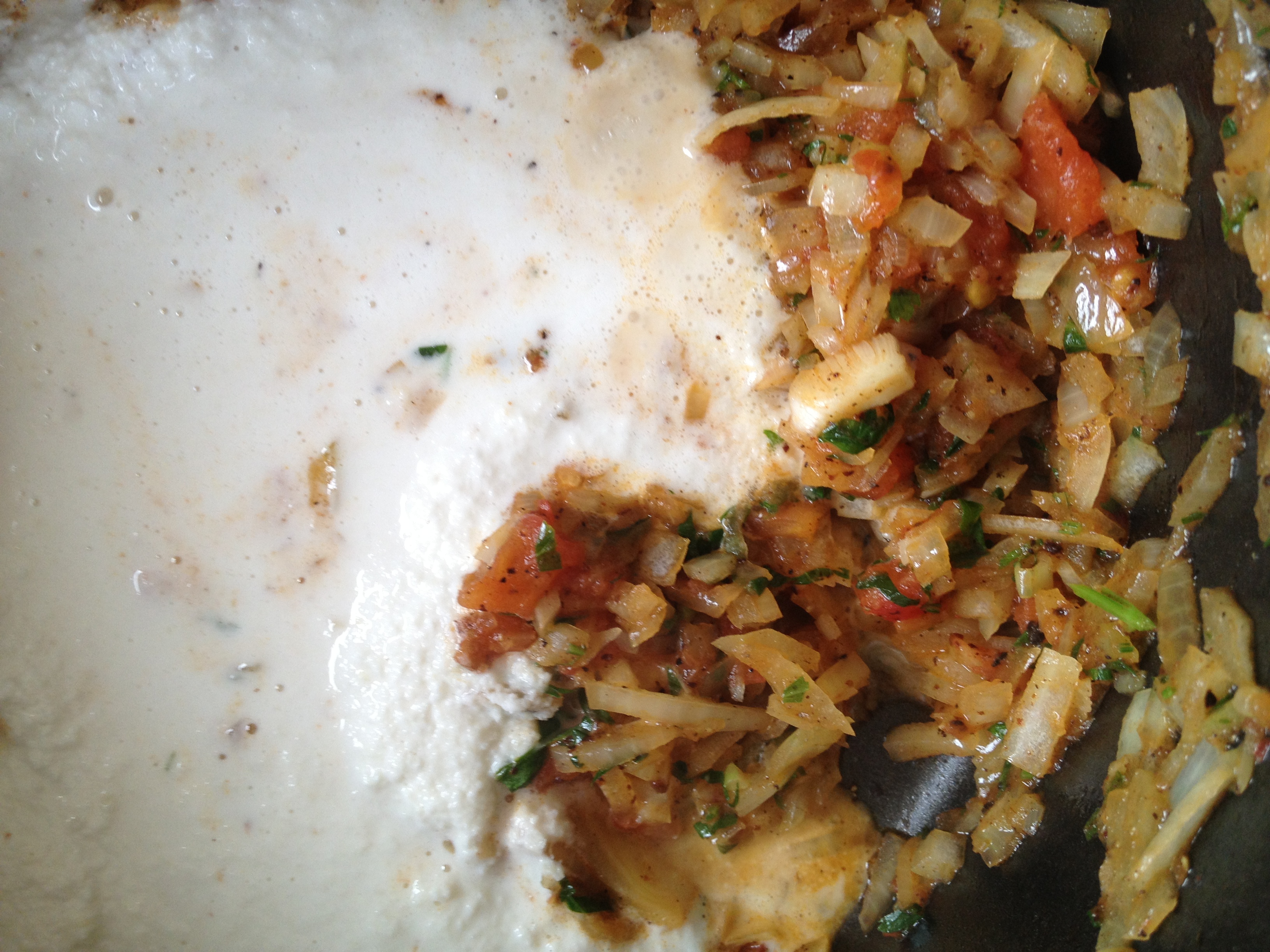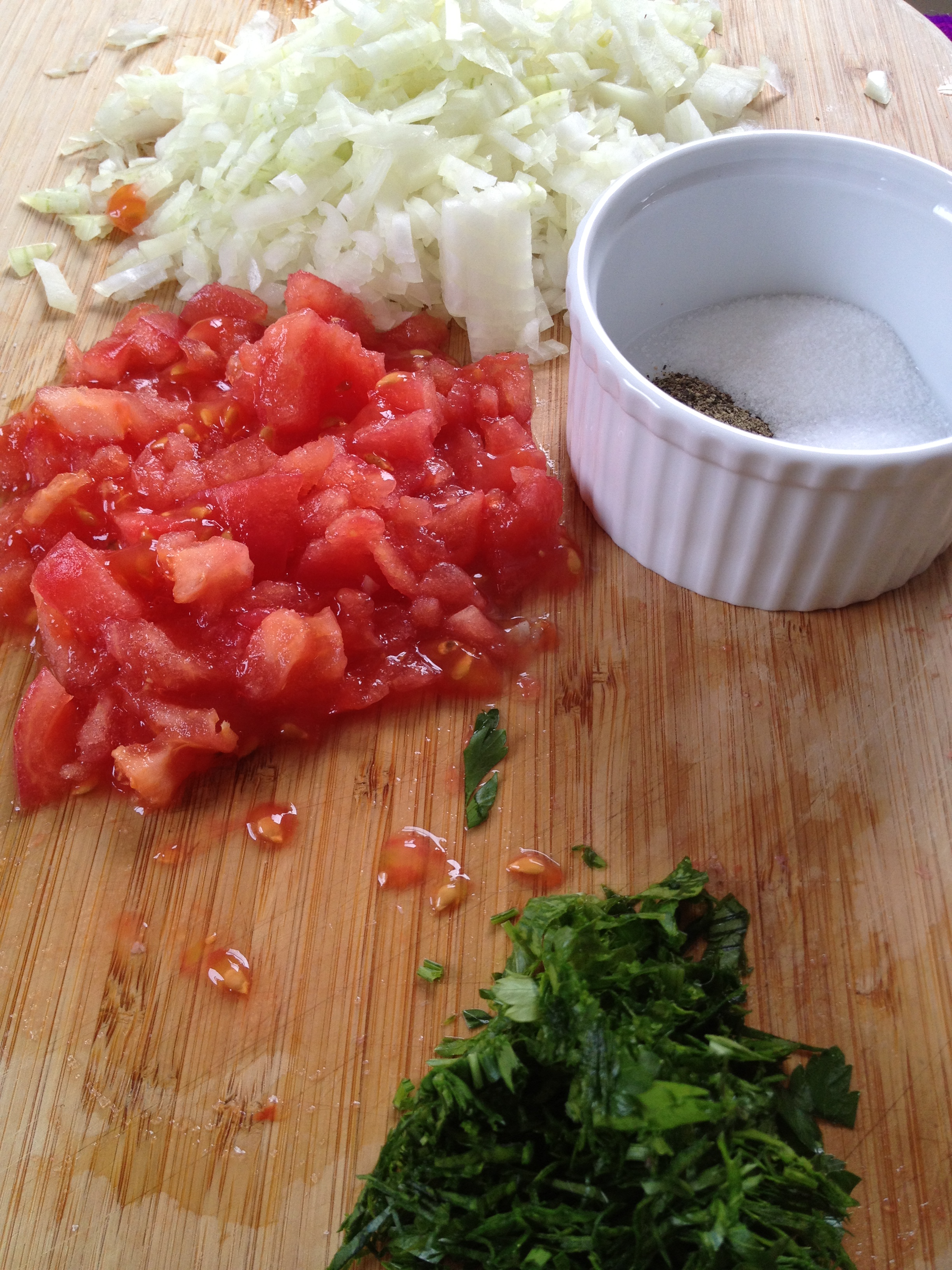 Dice the onion, peel the tomatoes and leave out the seeds if you can. Chop the parsley. Set aside