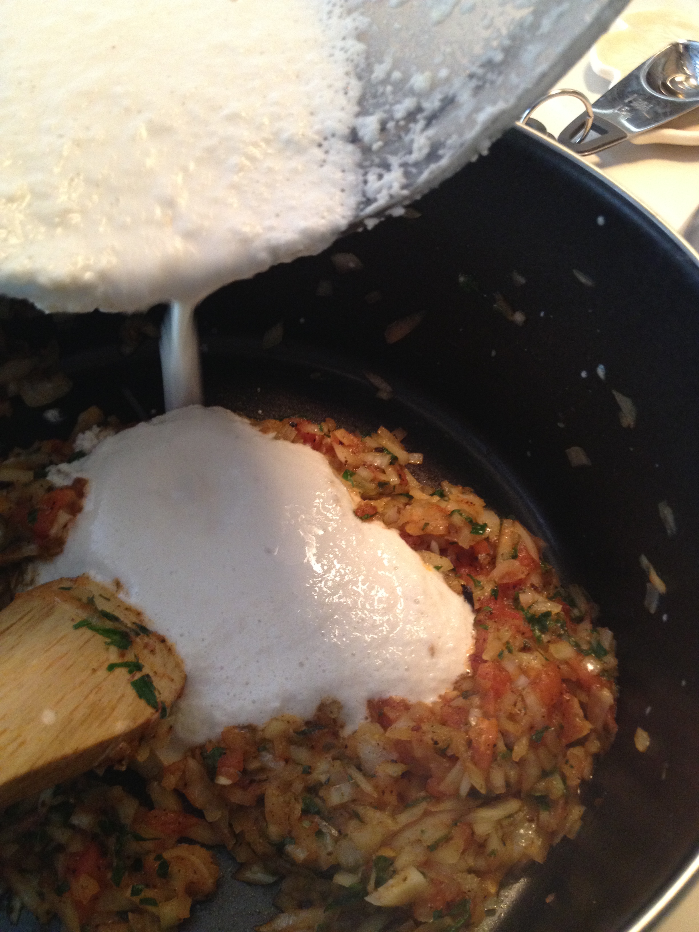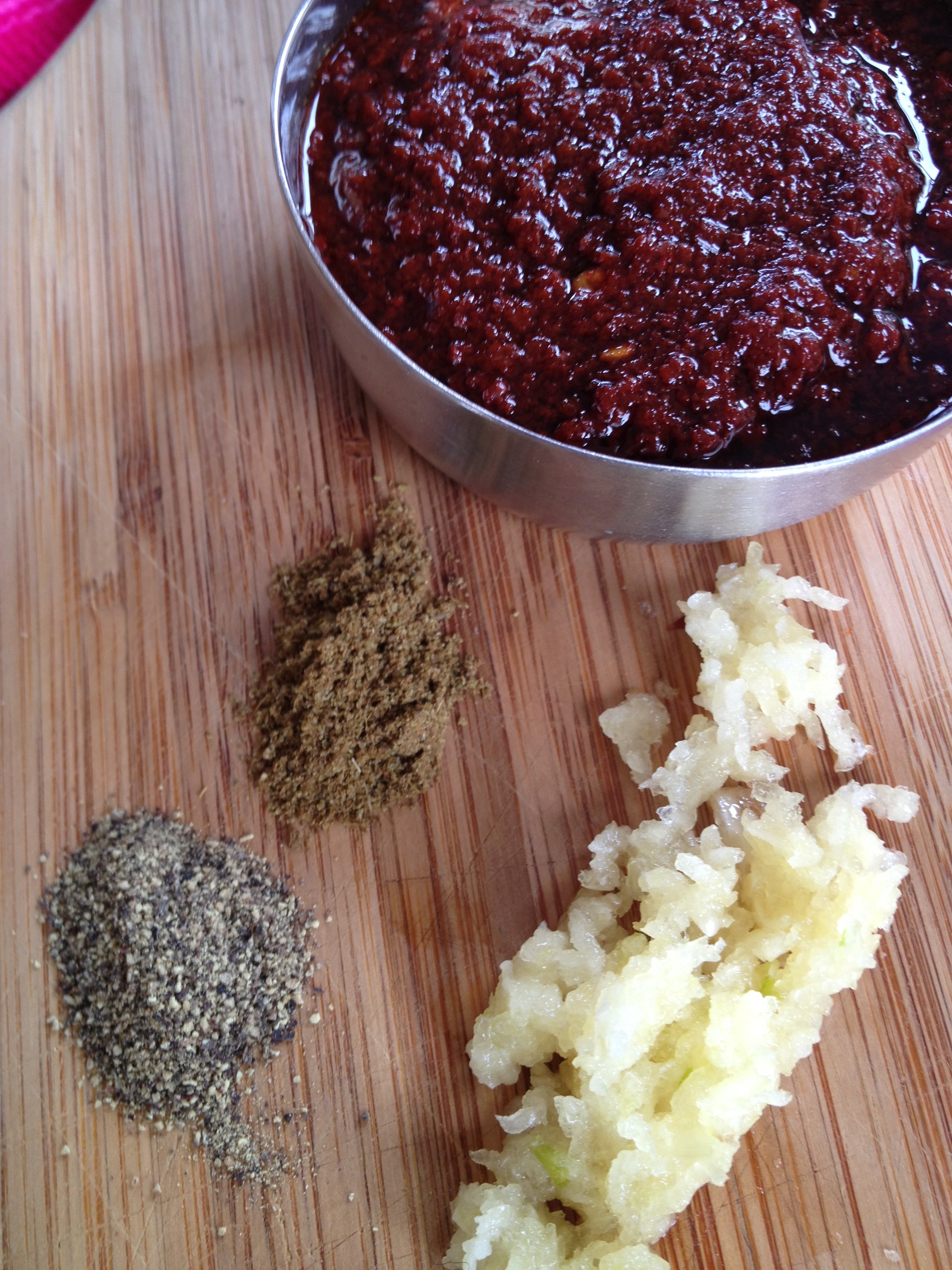 Heat oil in a saucepan and add the minced garlic, cumin, and pepper. Cook for a minute and add the red pepper sauce. Cook for 5 min and reserve. We are going to use this sauce to rub onto the pieces of lamb and then sear them in the frying pan with oil.