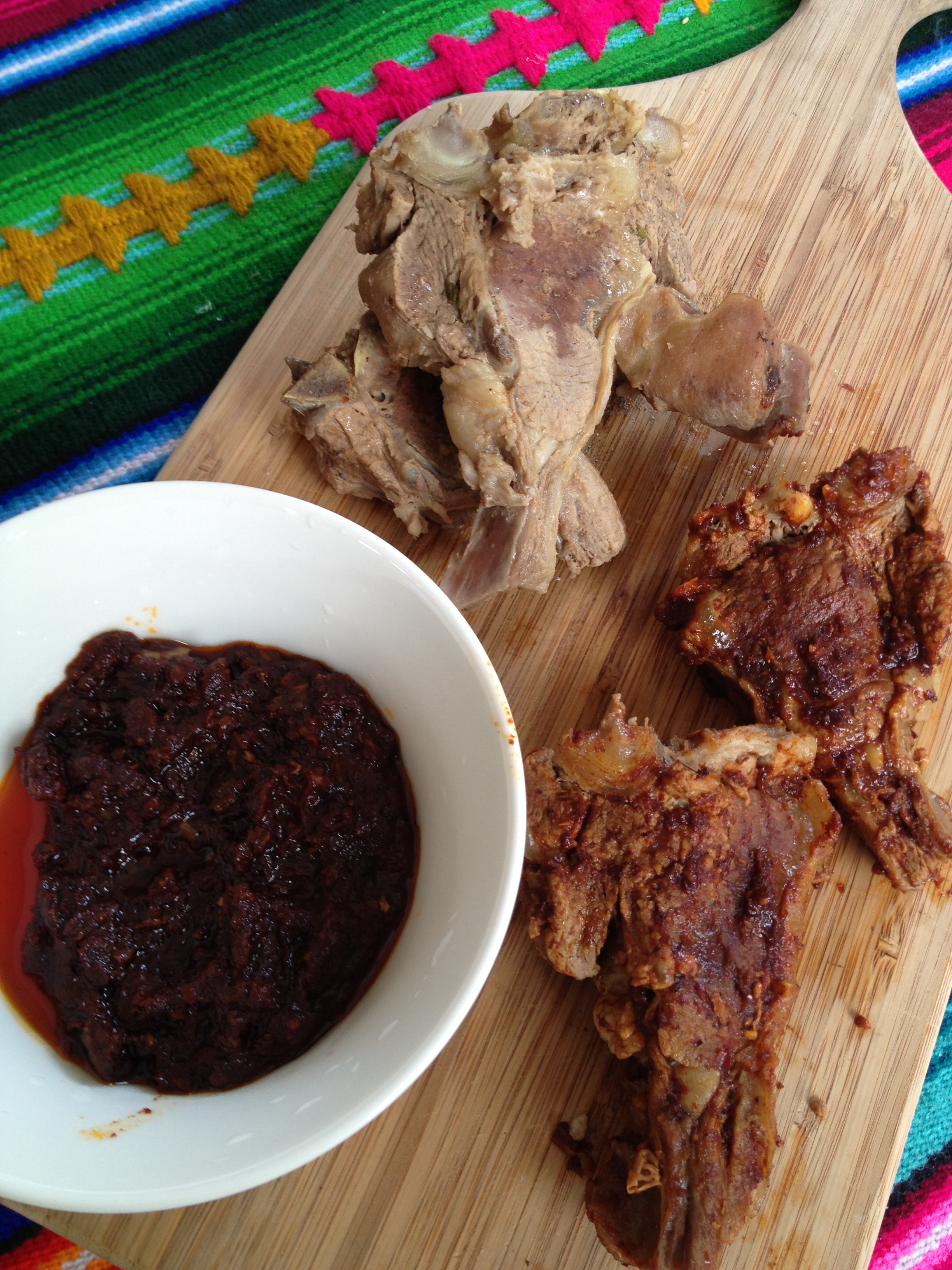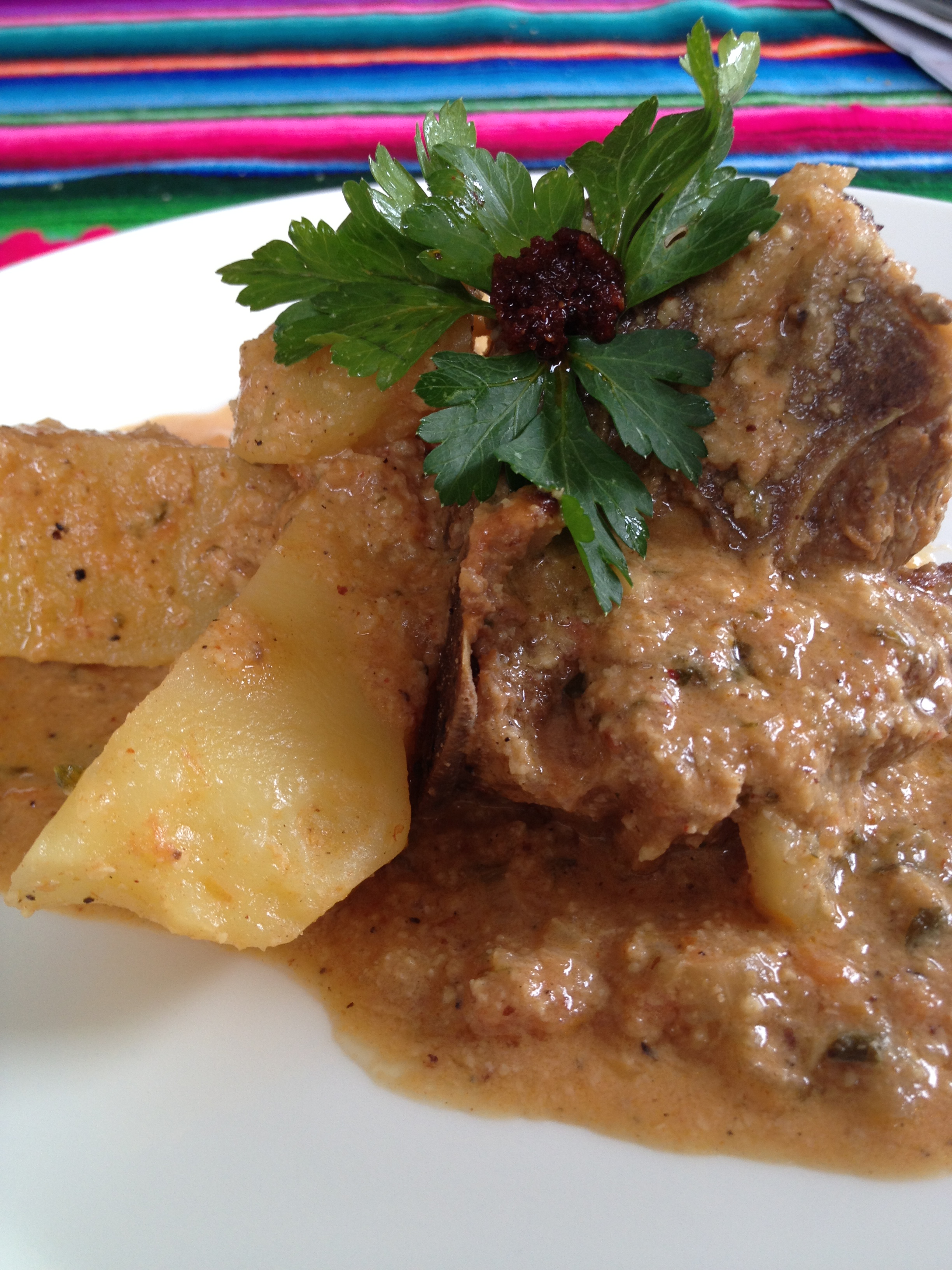 I love peanuts and this dish calls for raw peanuts that, combined with the other ingredients, make a delicious sauce. This is my mom’s version that she used to cook occasionally and probably is the Cochabamba style. The original dish came from another city, Sucre, and they use walnuts instead of peanuts and add some raisins. The traditional dish calls for lamb, but you must be prepared because lamb has a strong earthy aroma when cooked. So if you want to try this delicious peanut sauce you can substitute the lamb for chicken if you are not a lamb fan. Enjoy, you will be surprised with the flavors and how a 1/4 tsp of sugar enhances the flavor!