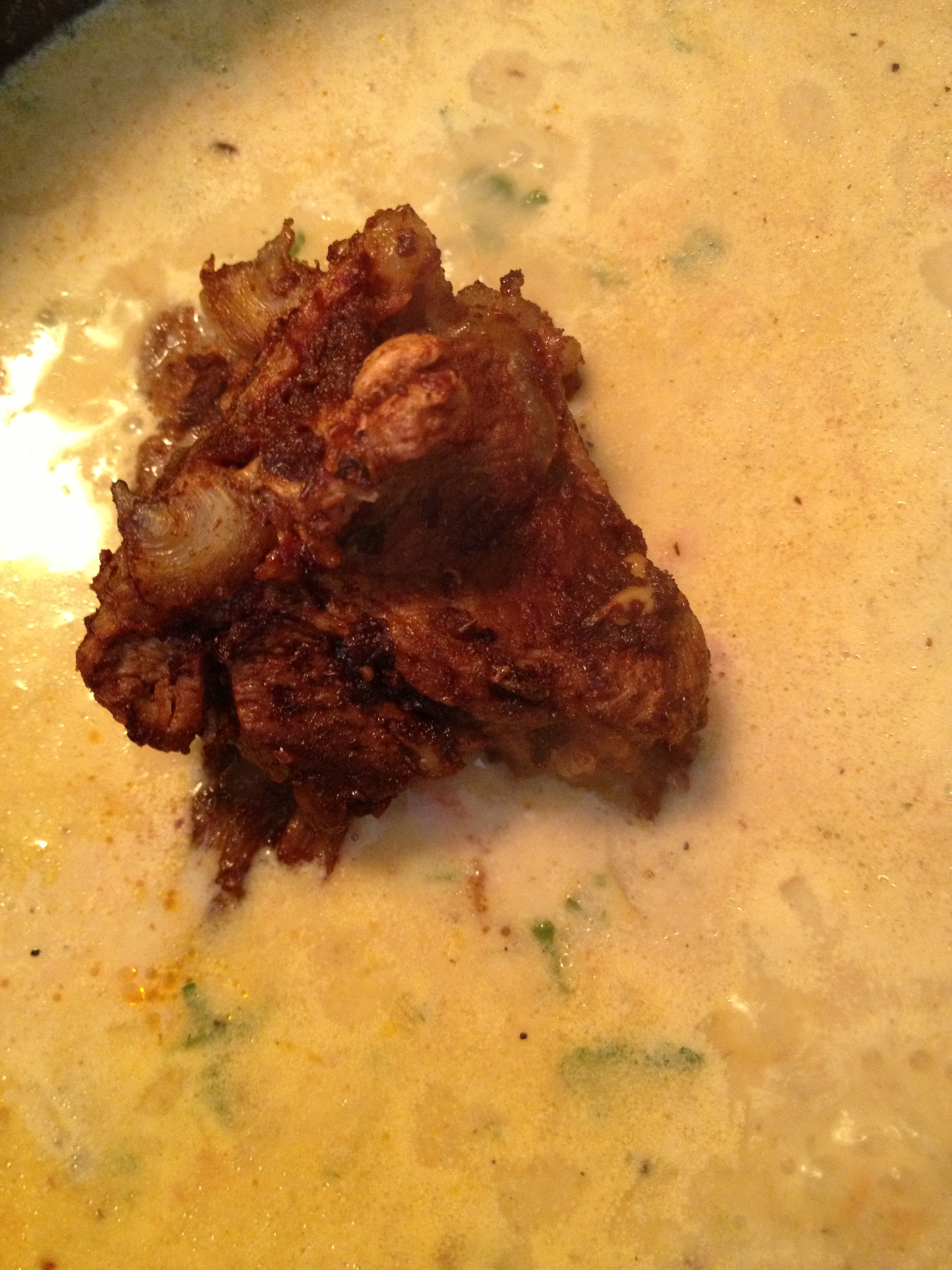 After the lamb is cooked remove from the broth, save the broth. Cover each piece of lamb with the rubbing sauce. Heat the vegetable oil in a large sauce pan and fry the lamb slightly and set aside.