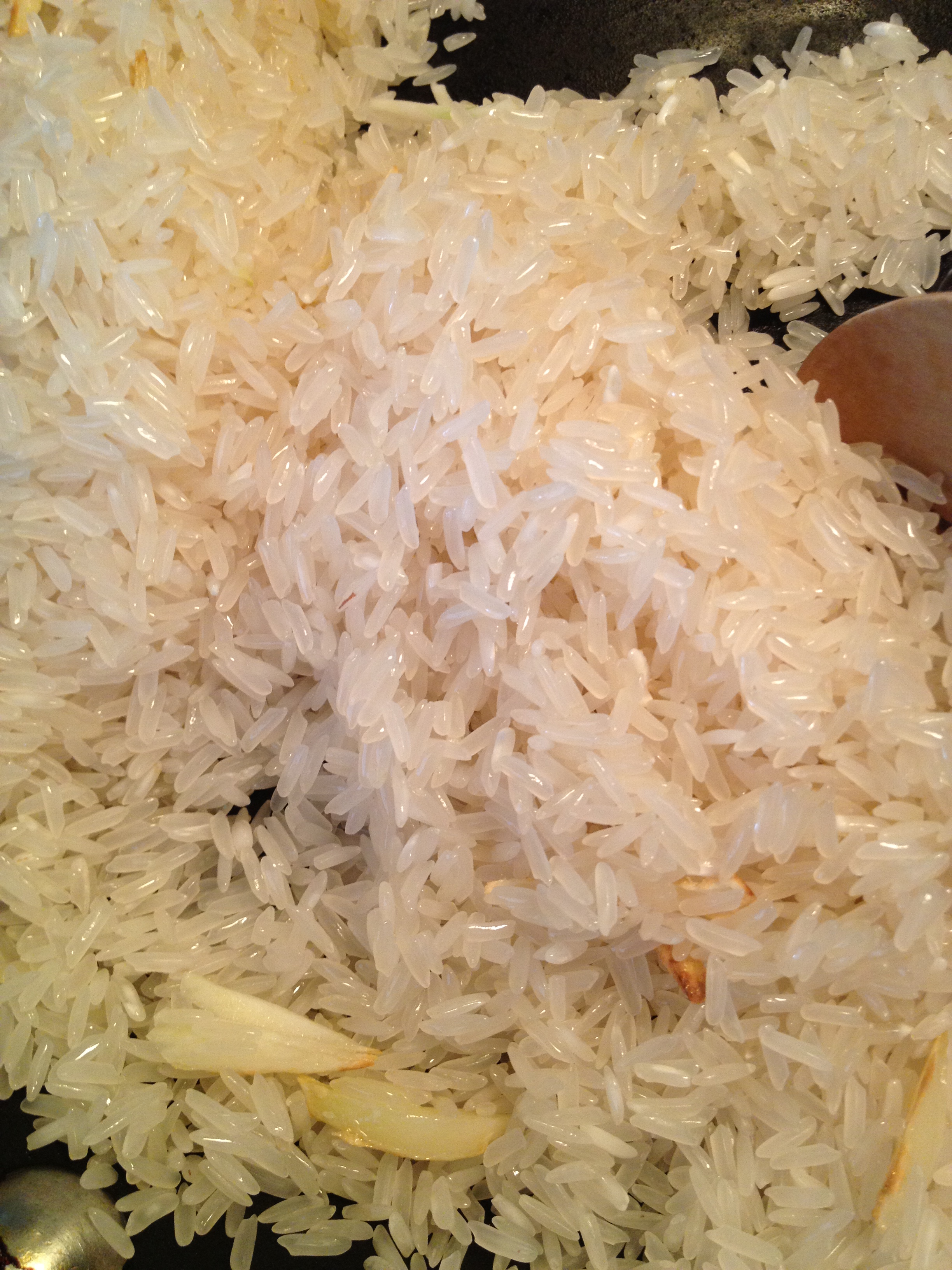 Heat the oil in a frying pan. Add the sliced garlic, cook the garlic for 30 sec, add the rice and fry until the rice changes color from clear white to dark opaque white.