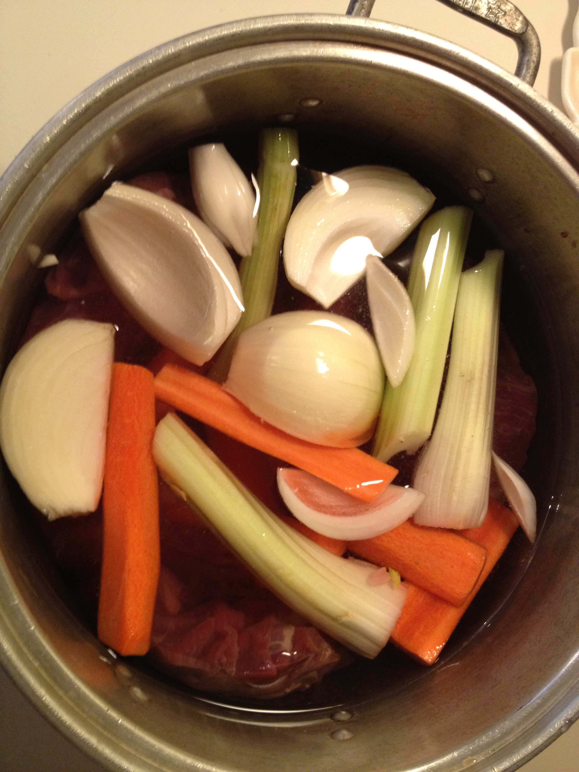 Peel and cut onion, carrots and celery. Put them all together in a large pot with salt and water and let it cook for about an hour.