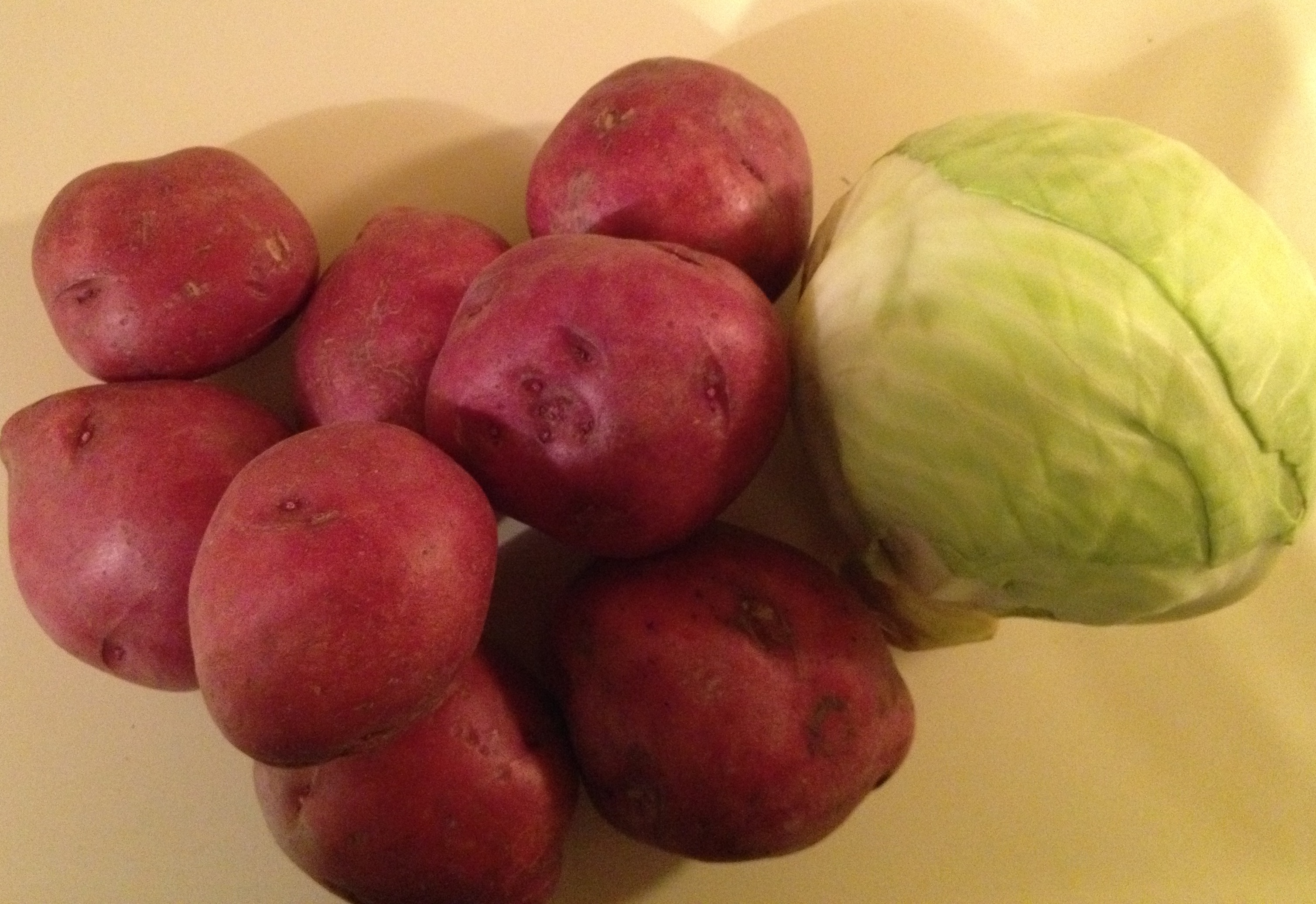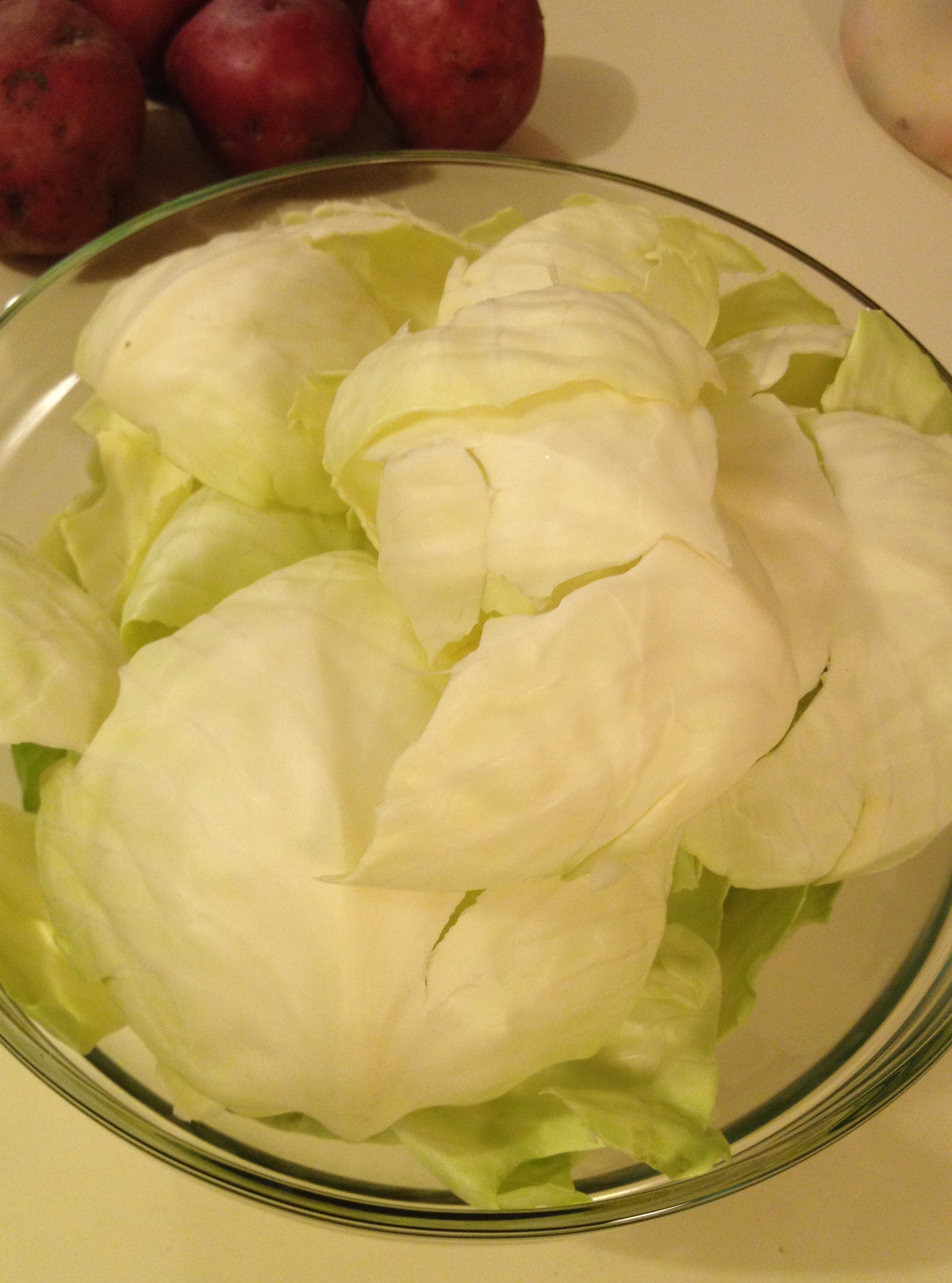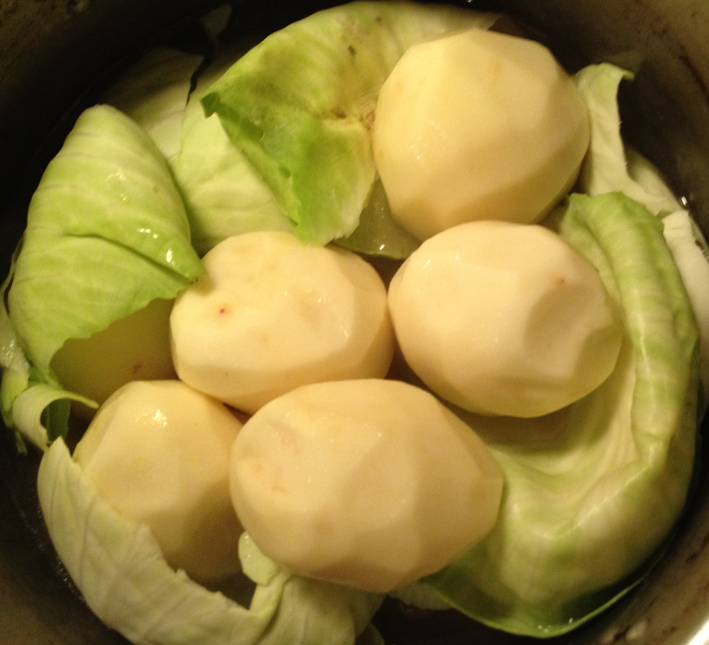 Meanwhile, peel the potatoes and peel the leaves off the cabbage and set aside