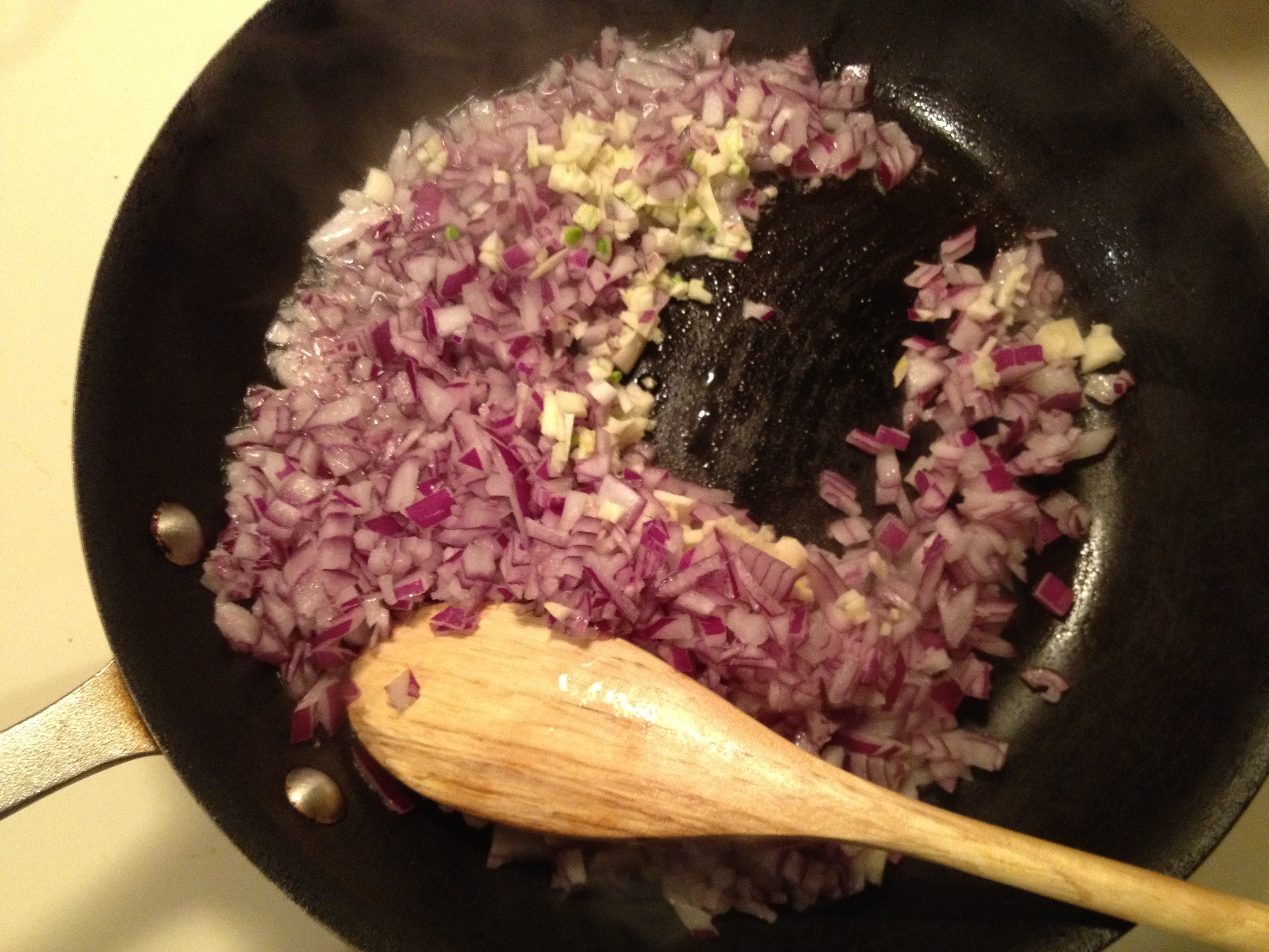 Dice the onion very small, mince the garlic. Cook the onion and garlic with canola oil.
