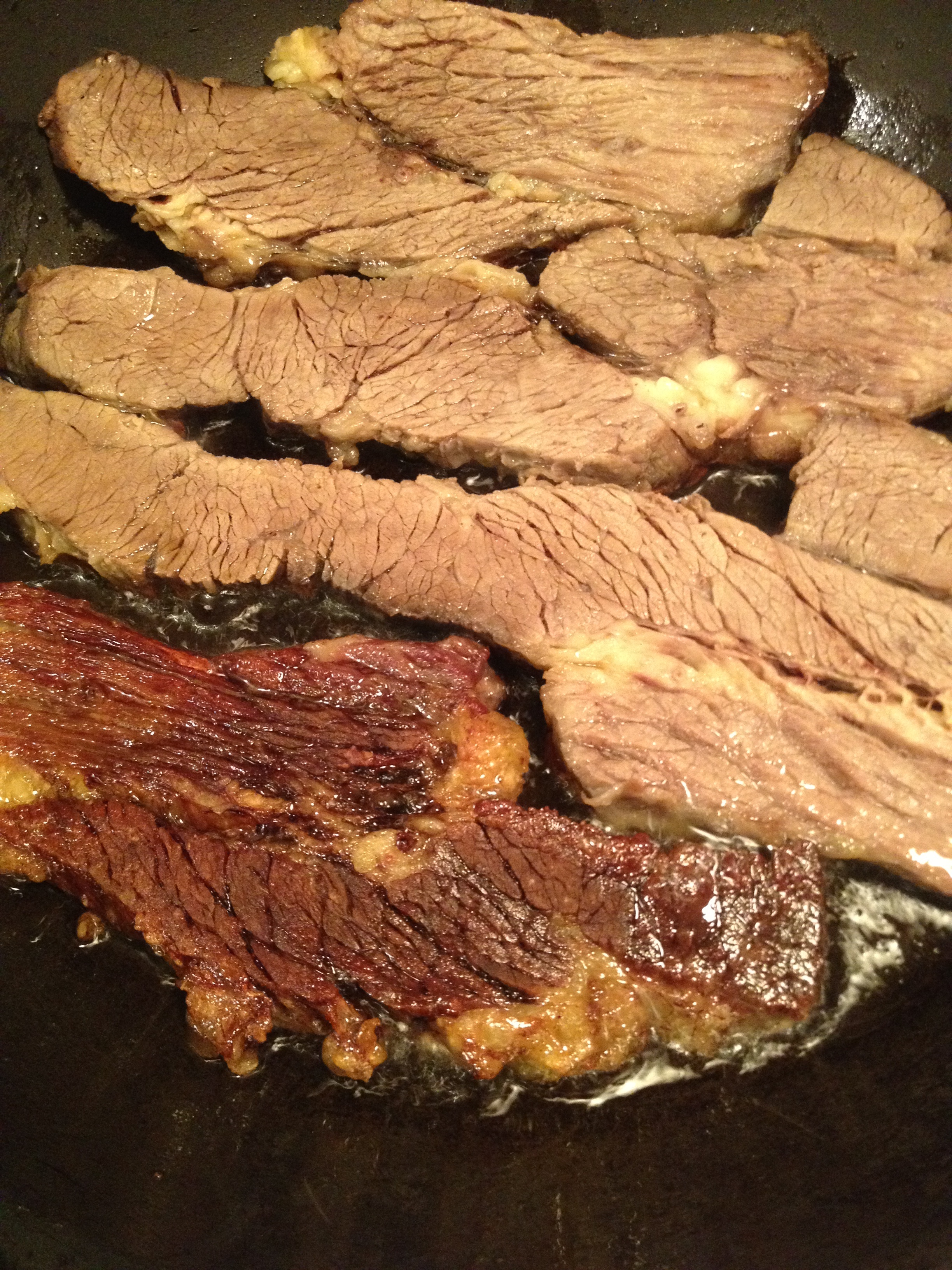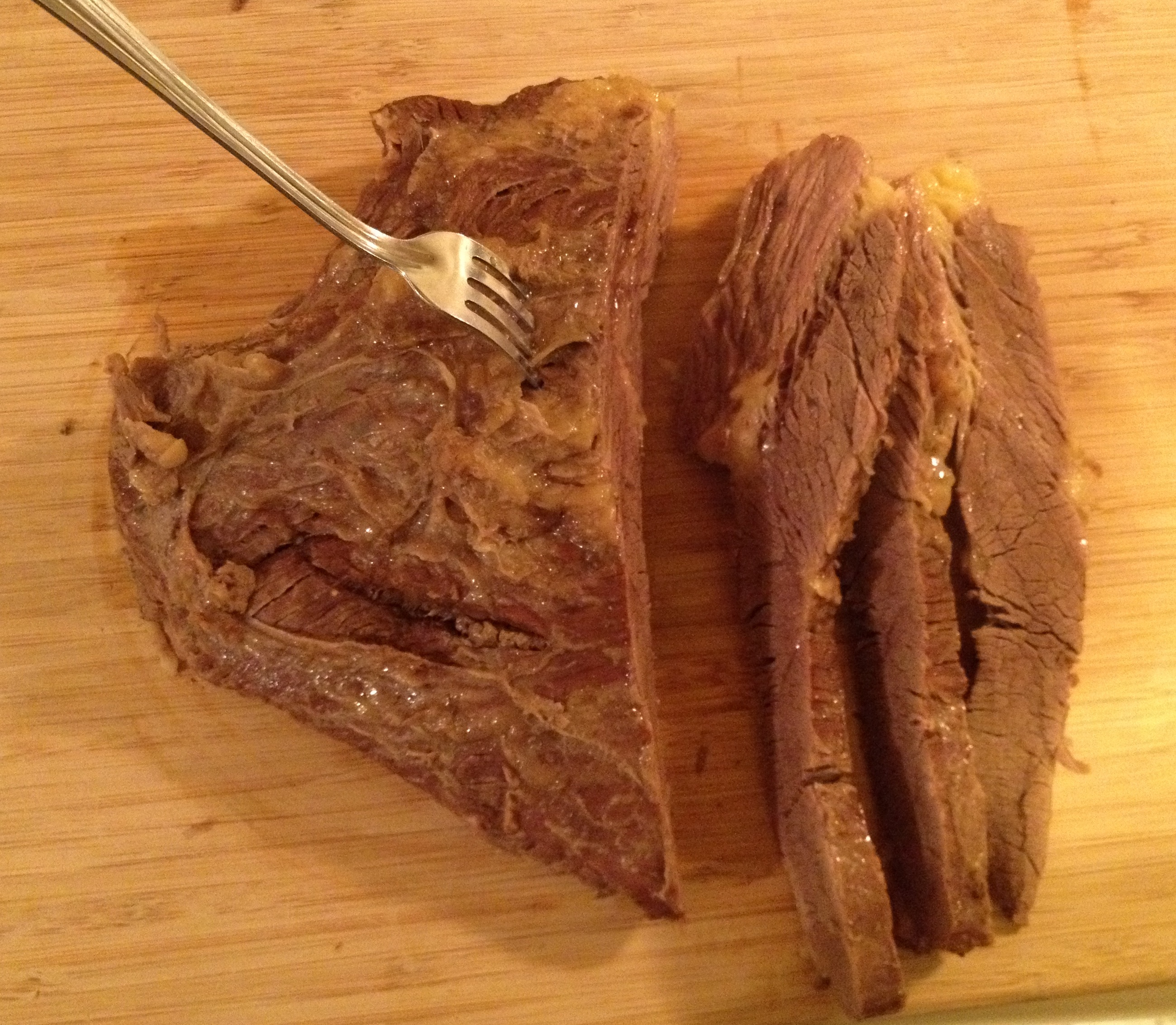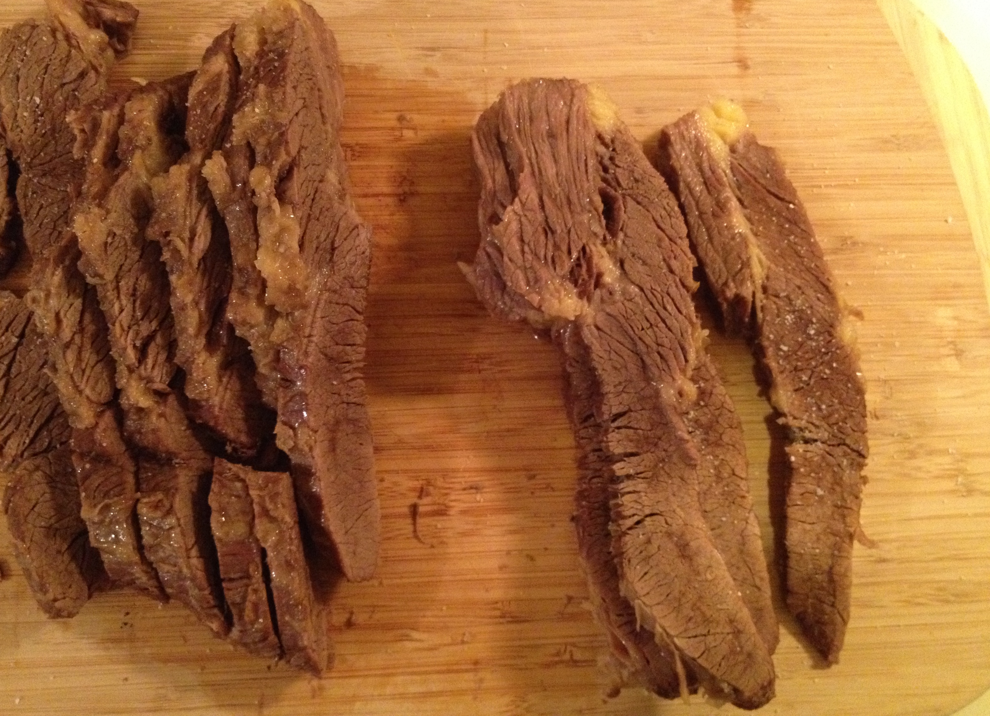 Slice the briscket into 16 thin slices, 2 per person. Slice the against the grain