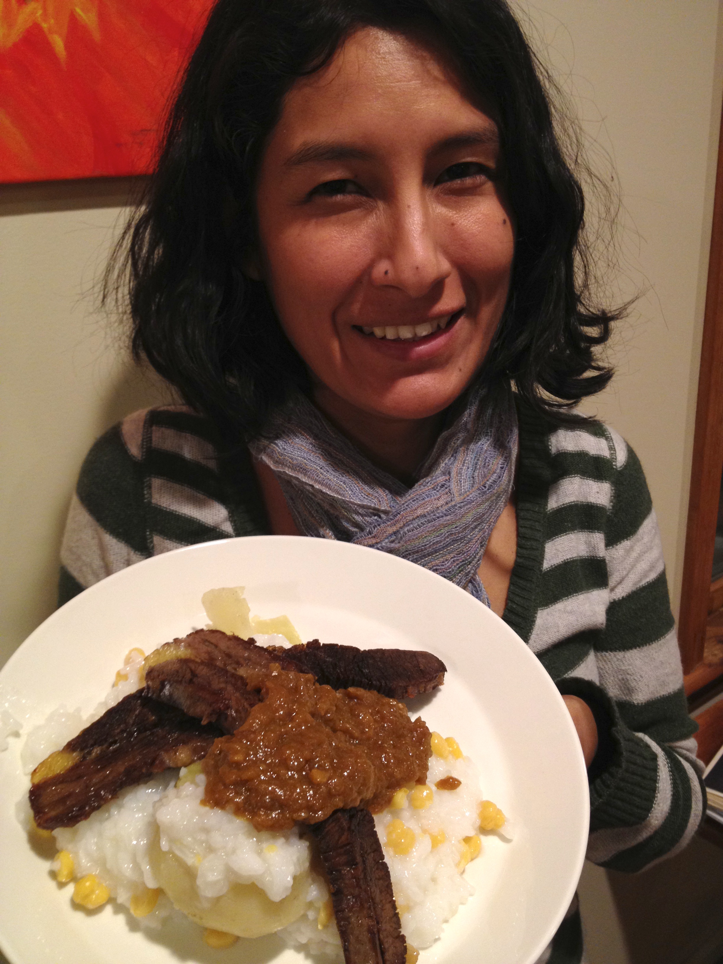 One of my favorite holidays in Bolivia is Carnaval and Martes de Ch’alla. Each part of Bolivia celebrates it differently but we all agree on the part of being thankful for all the good things we have and we are thankful to our mother earth (Pachamama) for them. And what a better way to celebrate than having fun and harken back to our childhood playing with water ballons or buckets of water. This is the only time that I saw my parents being tricky and hiding and making alinces to try to soak as many people in the family as possible. After so much fun and being all so wet and cold a good abundant hot and spicy dish hits the spot (te cae como del cielo!) The nice crispy meat mixed with the warm rice and the crunchiness of the cabbage all topped with a nice hot yellow sauce, warms any belly and body. Some Puchero recipes call for chuño or peramota (pear) even peach, you can be very creative with it. I miss the Carnaval season but at least with this recipe I can warm my belly and bring memories back with each bite of Puchero!
