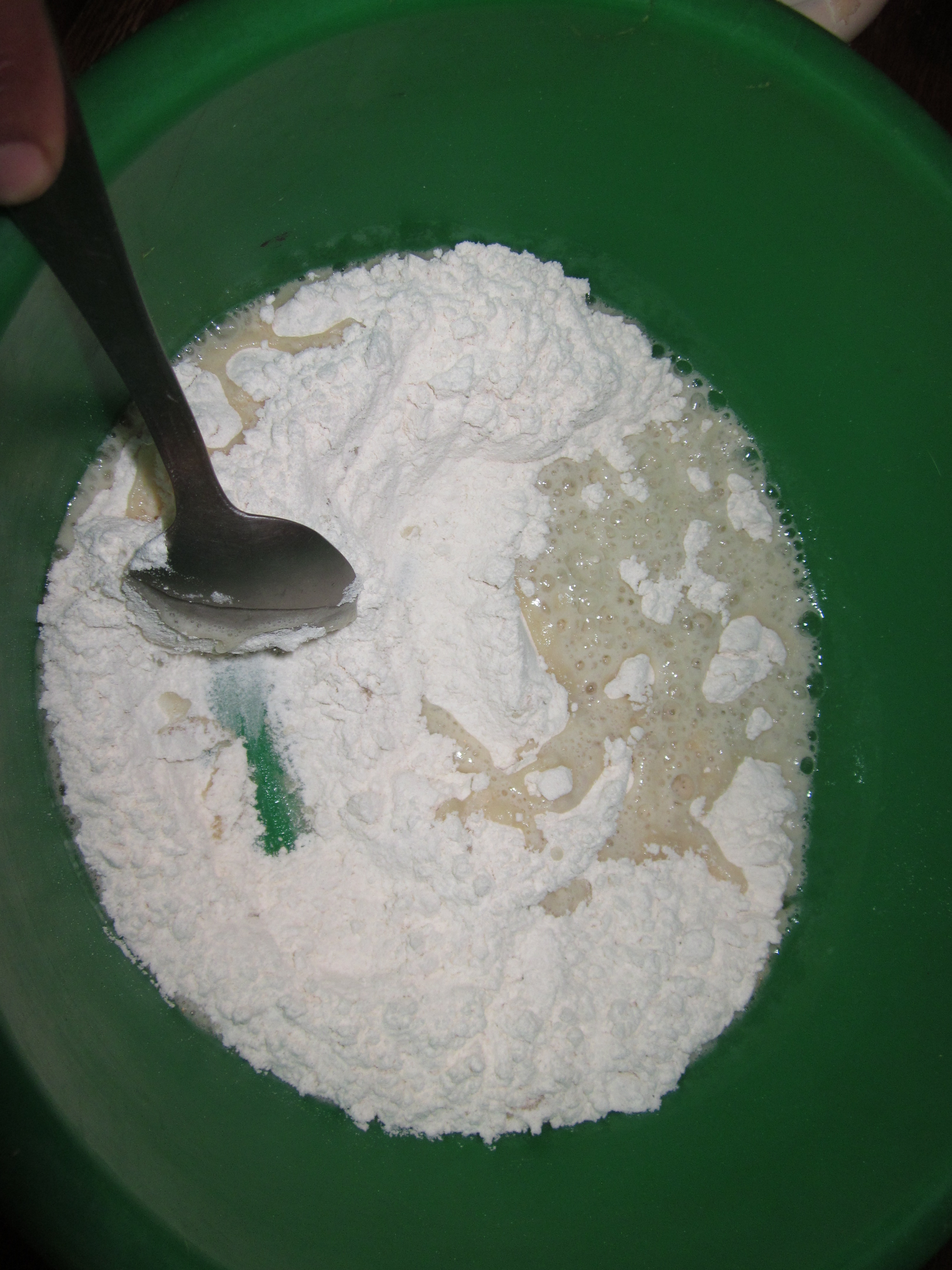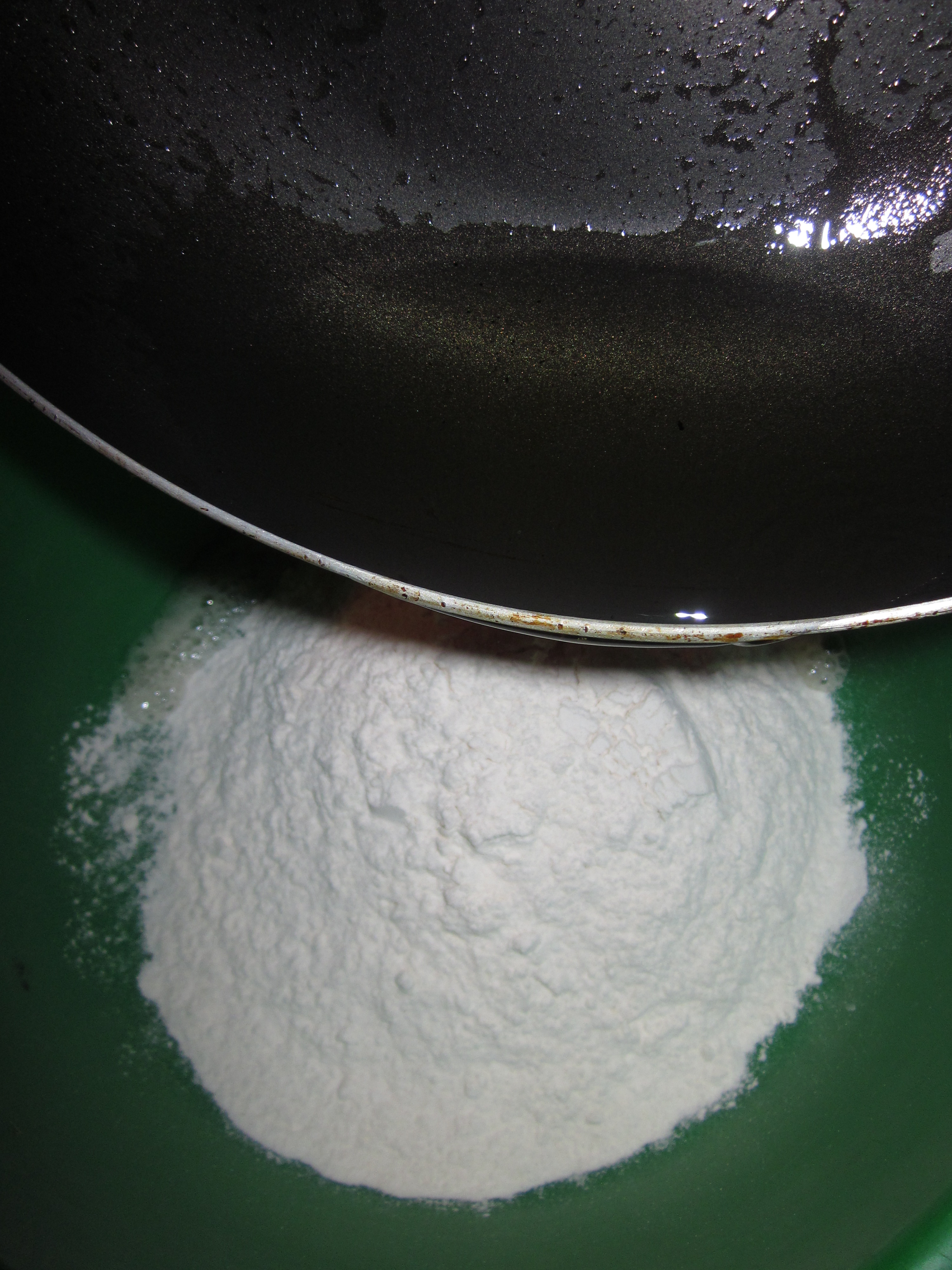 Sift the flower in a mixing bowl. Shape the flower in volcano shape. Heat the crisco close to boil. Add this hot oil to the flour, you will see how the flower effervesces. Mix with a wooden spoon.