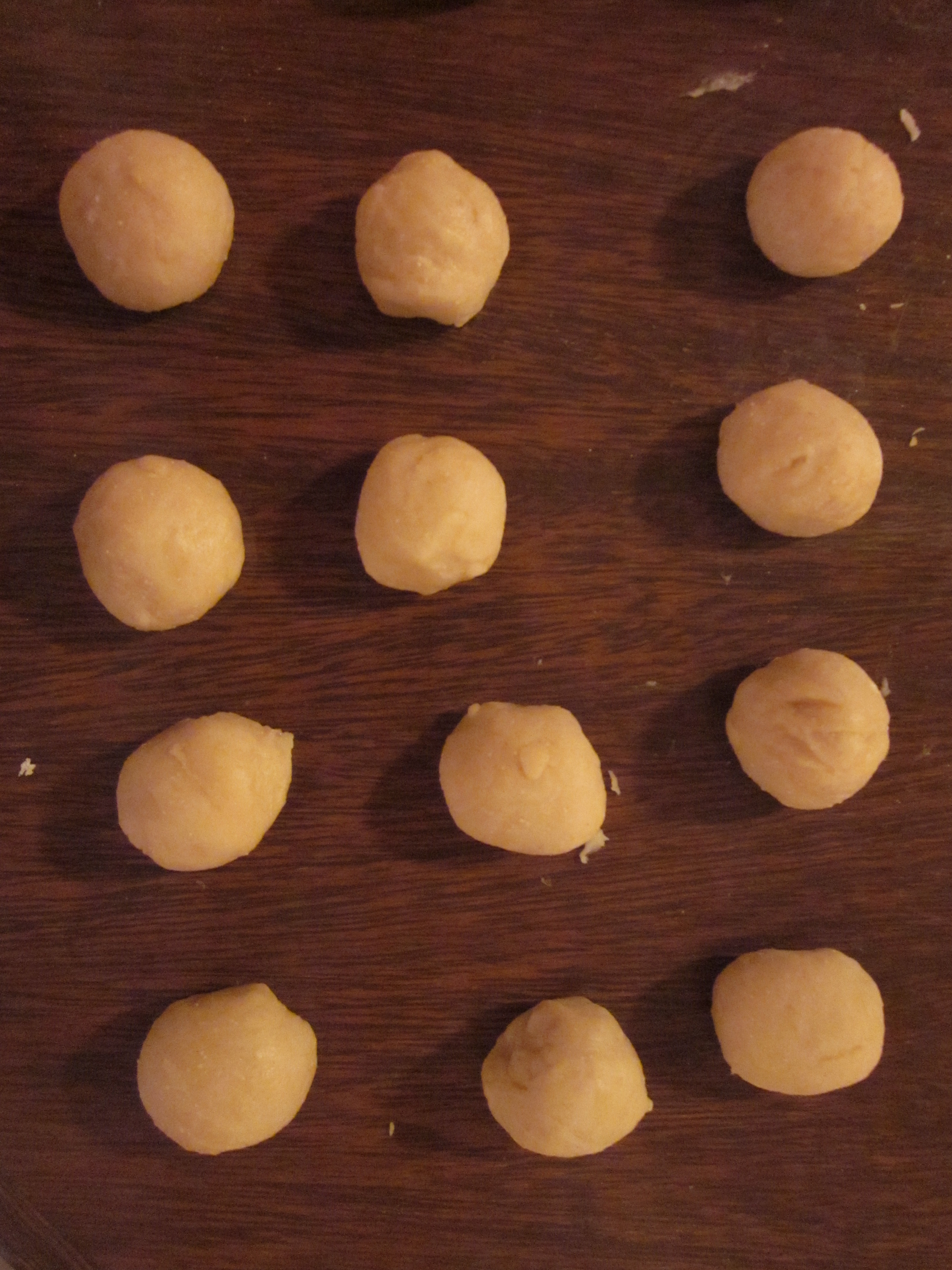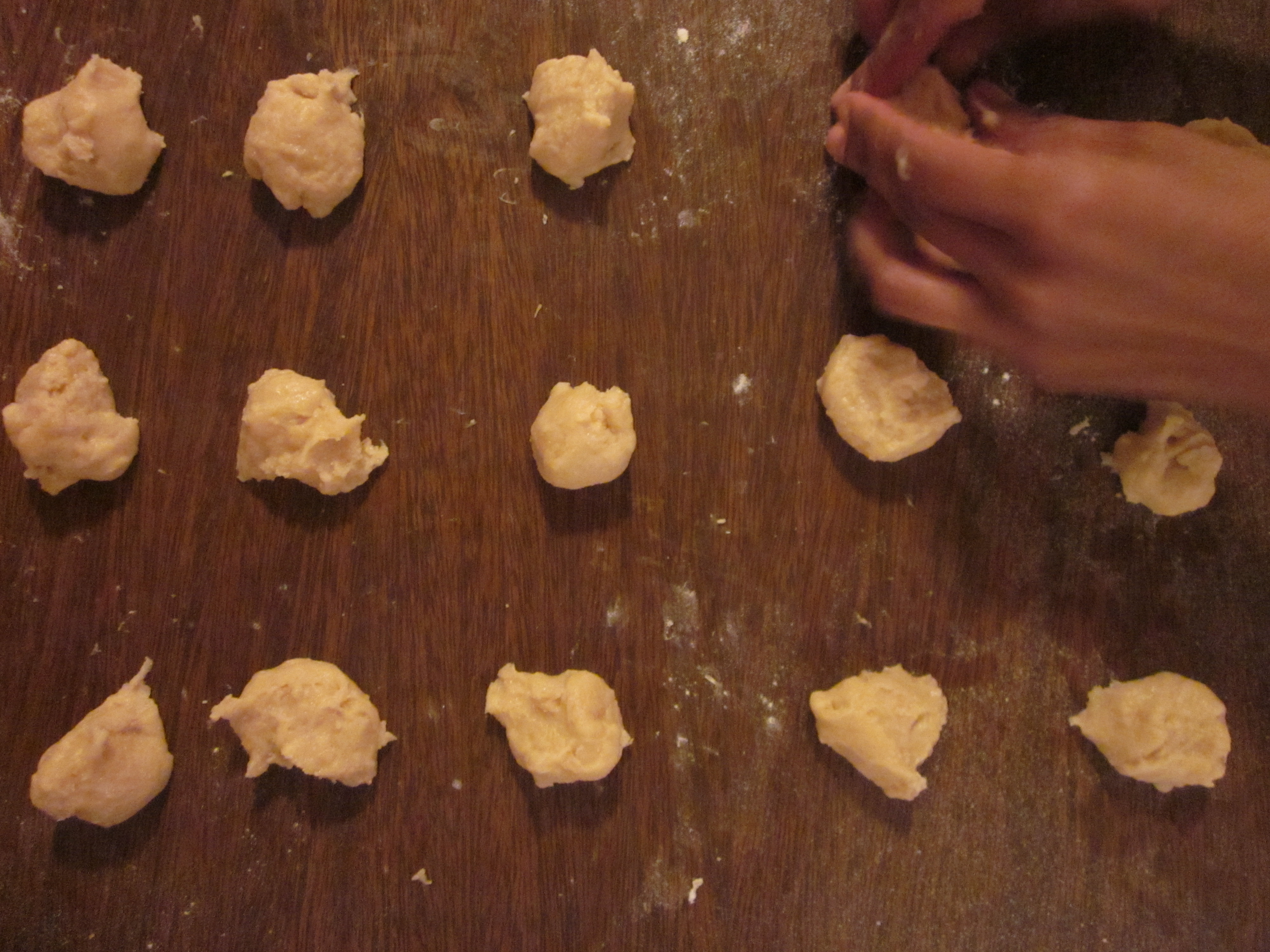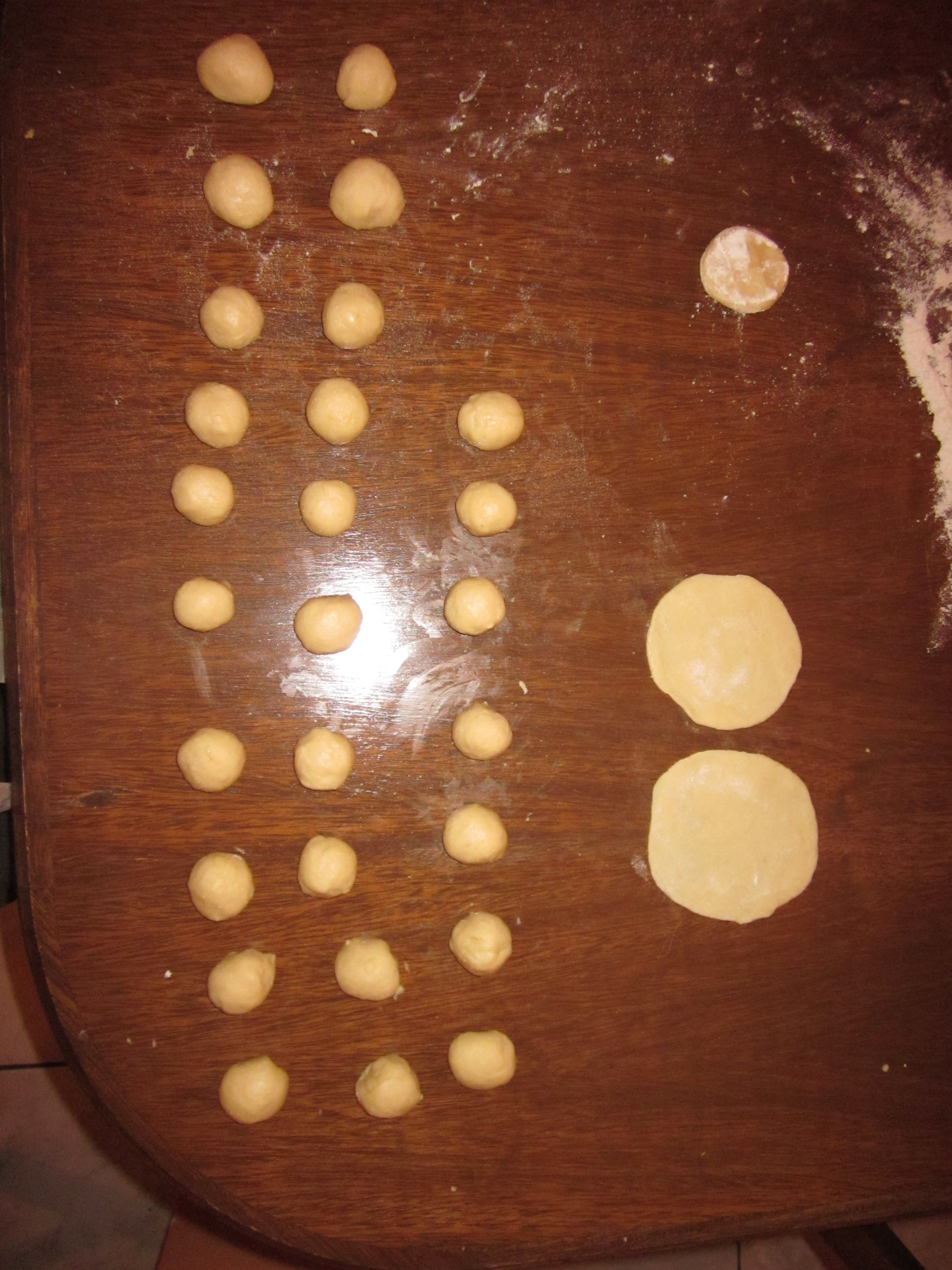 Add this mix to the flour along with the eggs yolks , salt and sugar. Mix until all the ingredients are well mixed in the dough. It’s very important to knead the dough forcefully on the table the dough for at least 5 min. (My Mom slams the dough down on the table, throwing it from up high for about 3 minutes). Make a nice ball and divide in 30 pieces.