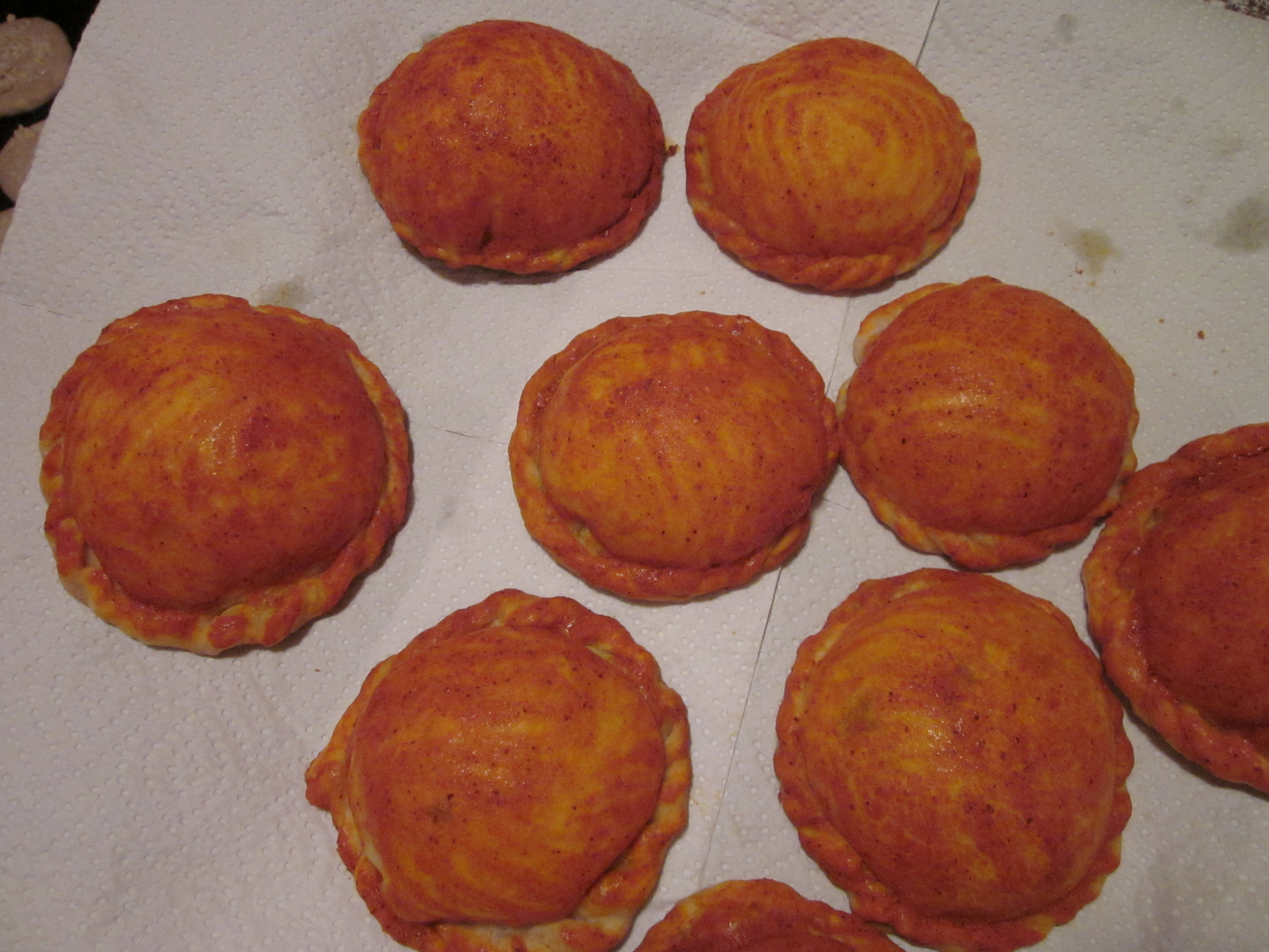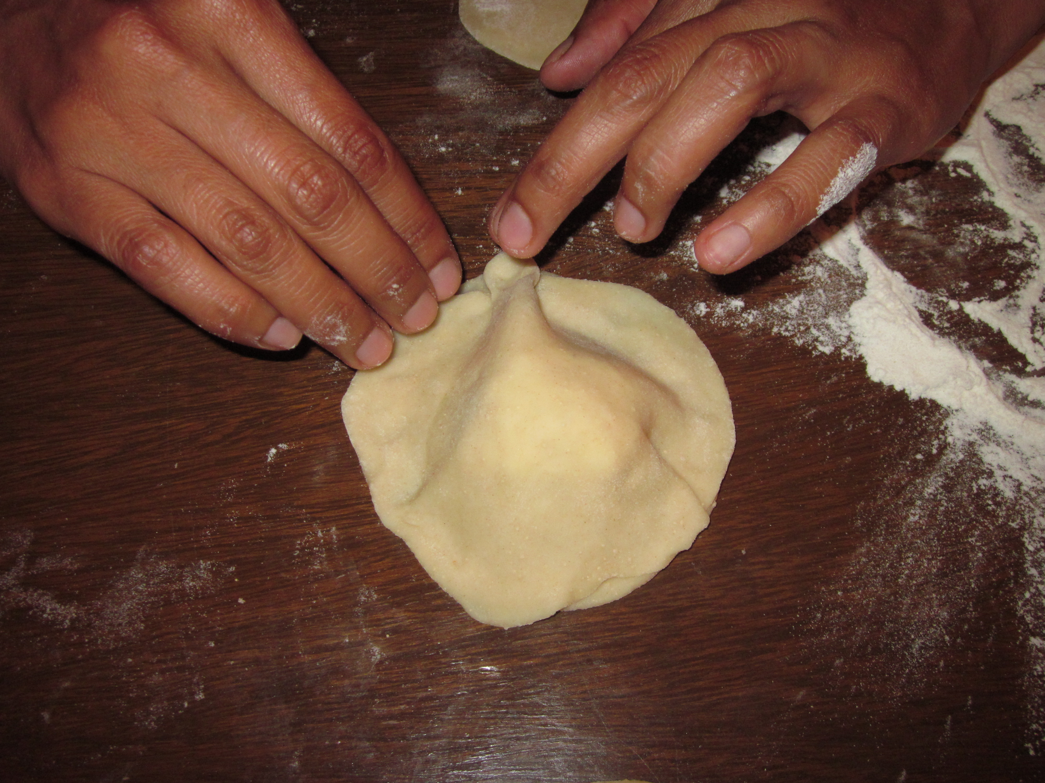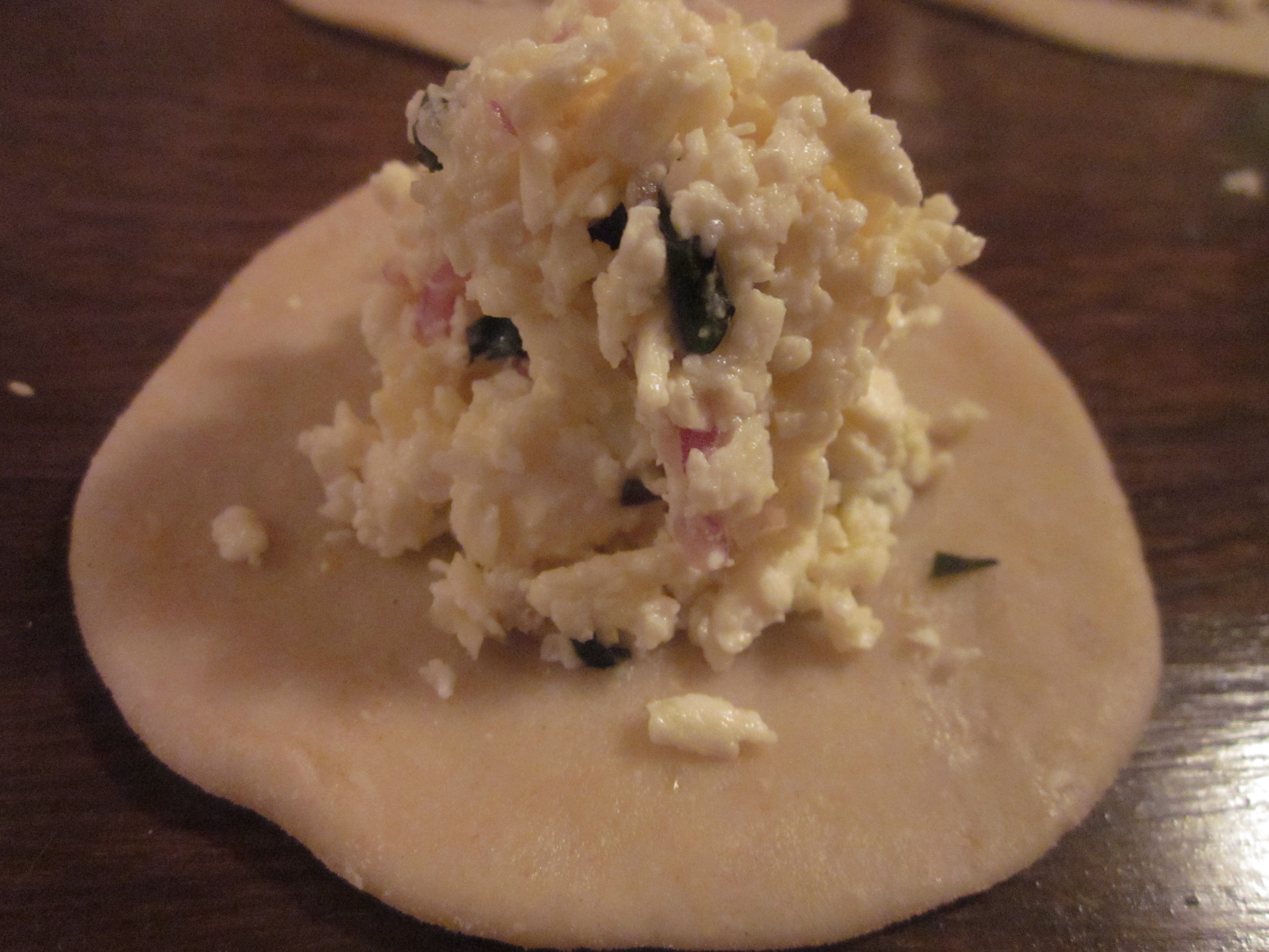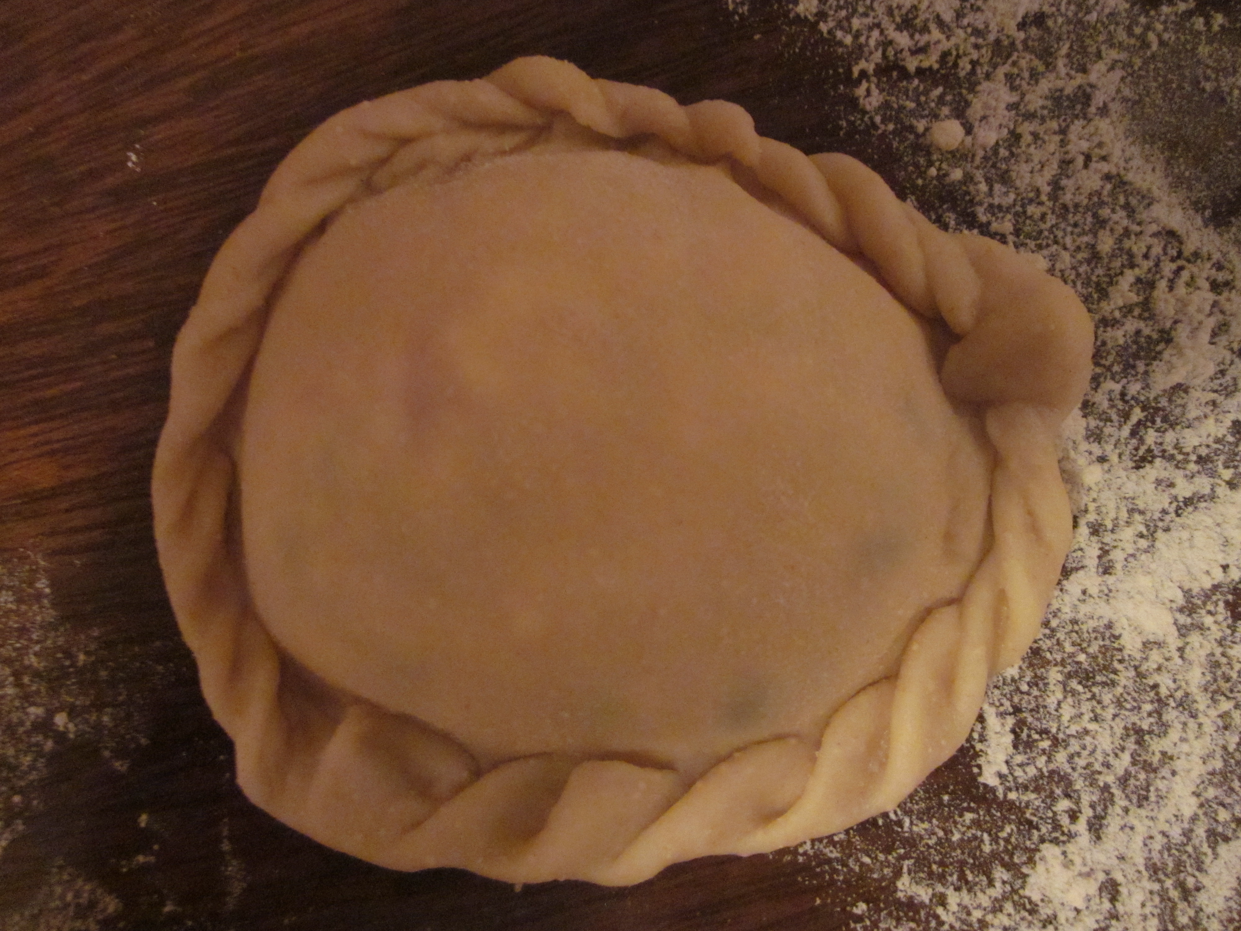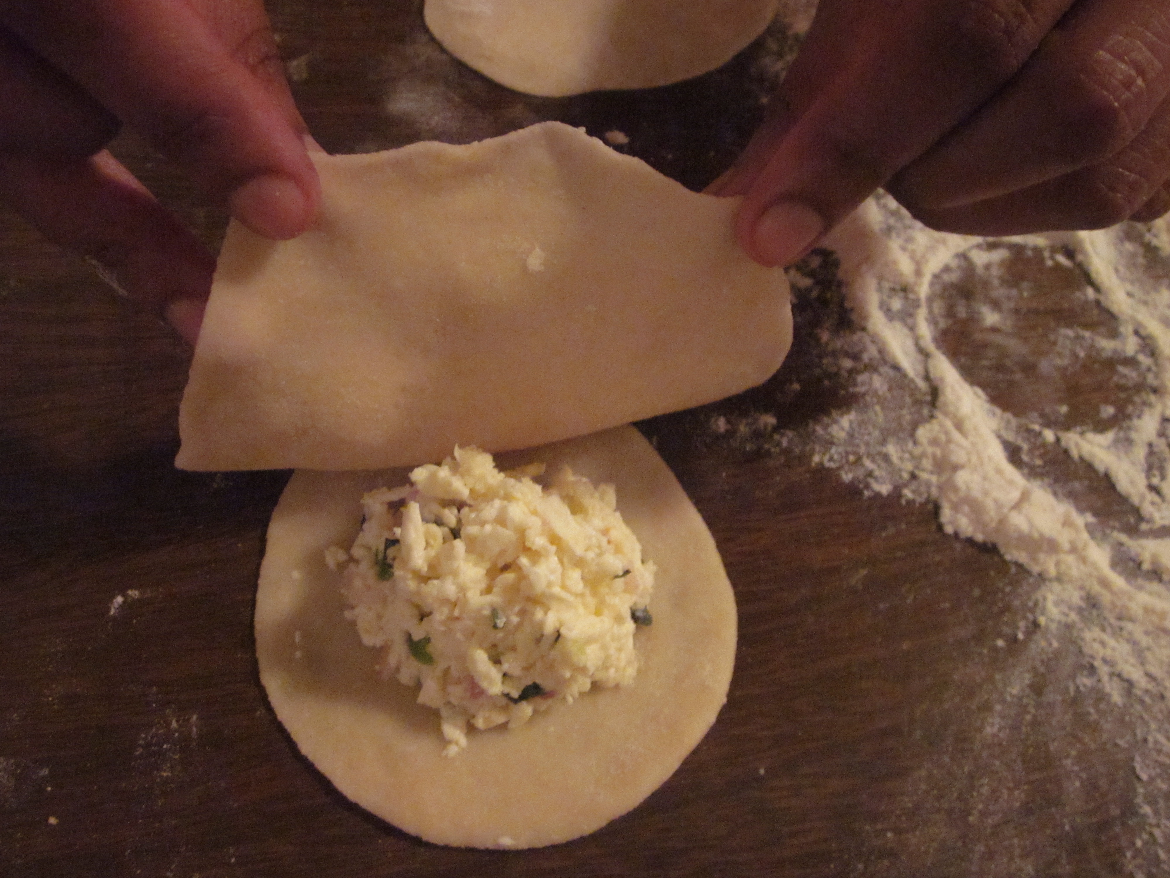 After all of them are flat, add 1 tbs of the filling mix in the center of the 15 discs, making sure ther is a nice pile with no filling on the edges of the disc. Use another disc to cover and press well to seal the edges. After sealed, do a nice braid twist around the edges of the dough. If you don’t know out to braid the dough, you can use a fork to press the edges down.