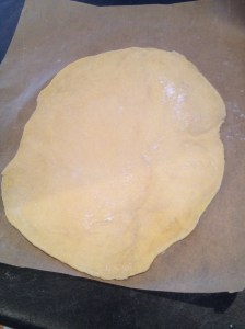 Roll the dough on top of parchment paper, until it’s thin