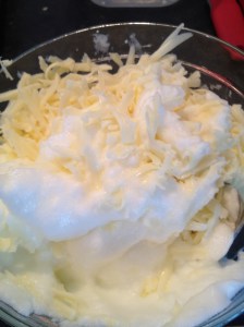 Meanwhile beat egg whites until hard (punto nieve). Add the cheese, mix, and set aside.