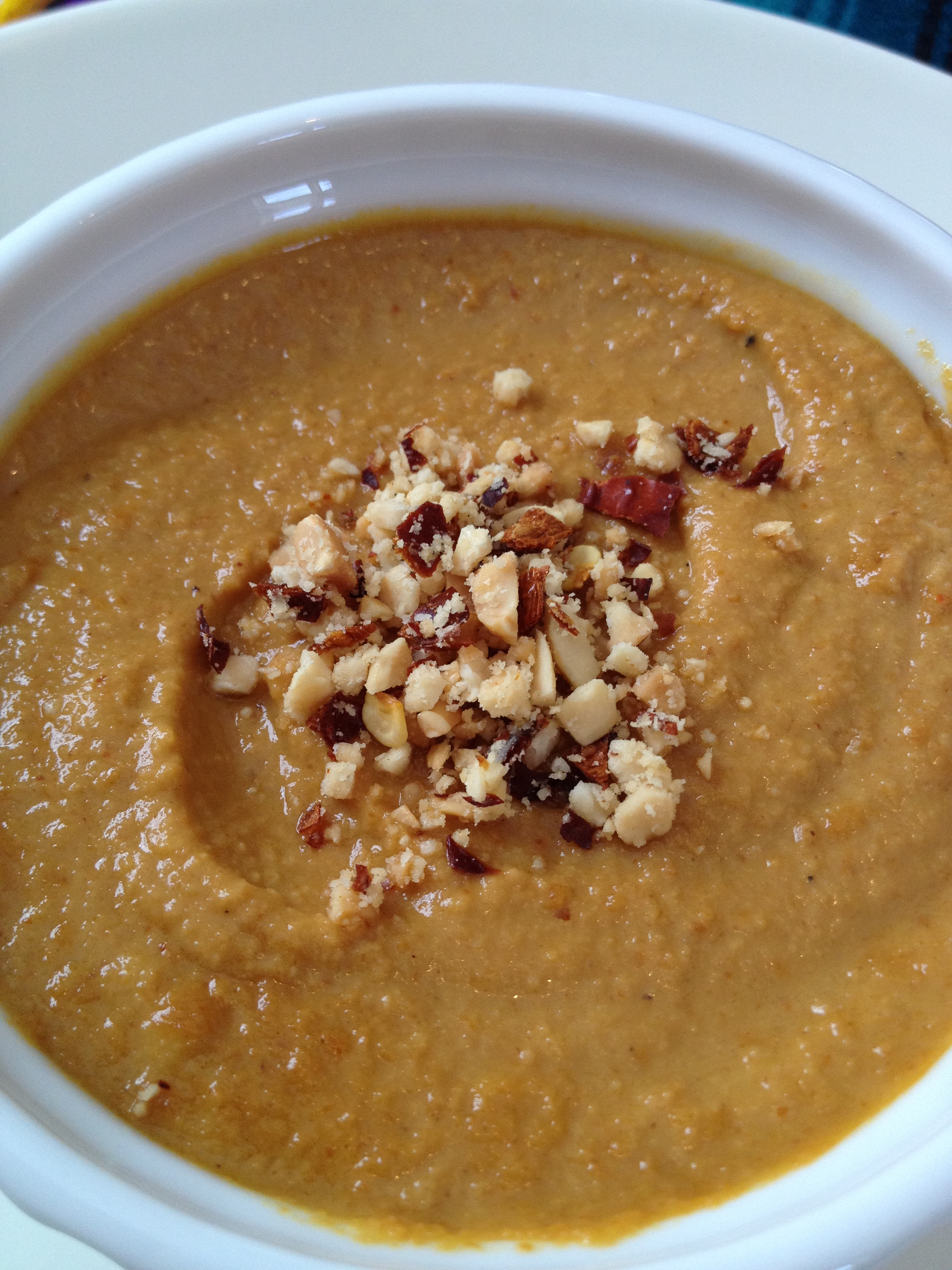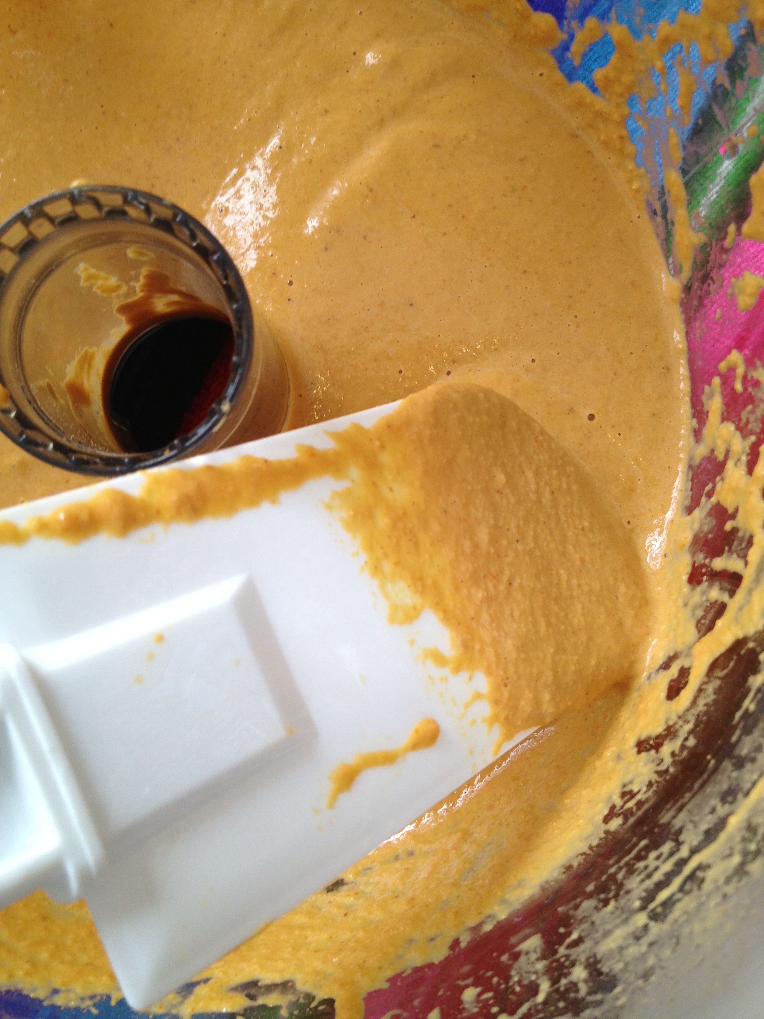 (The above photo with two piles shows the unroasted and roasted peanuts). Take the seeds out of the yellow peppers and put them in a food processor or blender, add the peanuts, garlic, salt and water. You are looking for a smooth sauce.