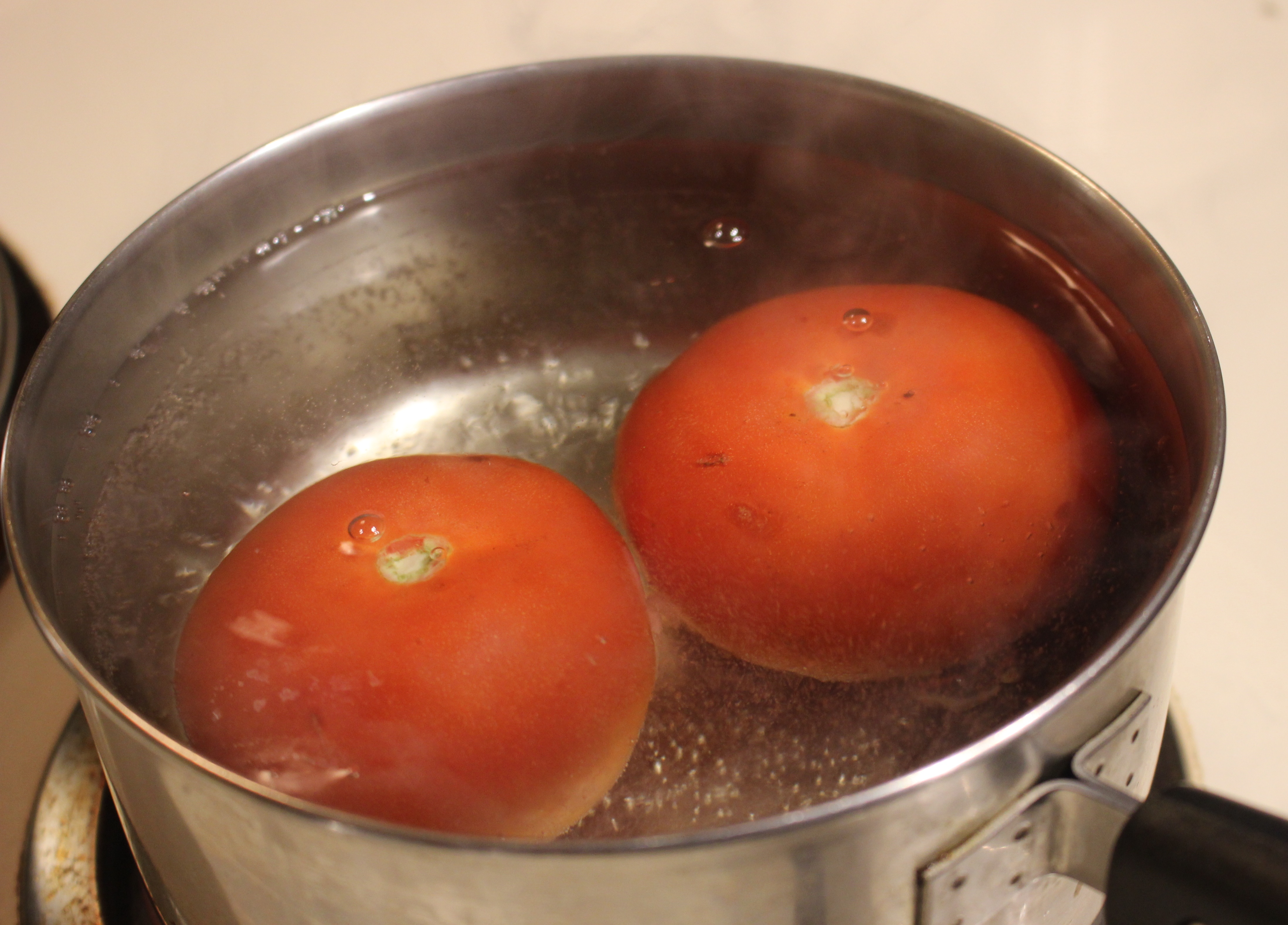 Boil water and add the tomatoes. Cook them for 2 min, no more than that. The skin will get loose.
