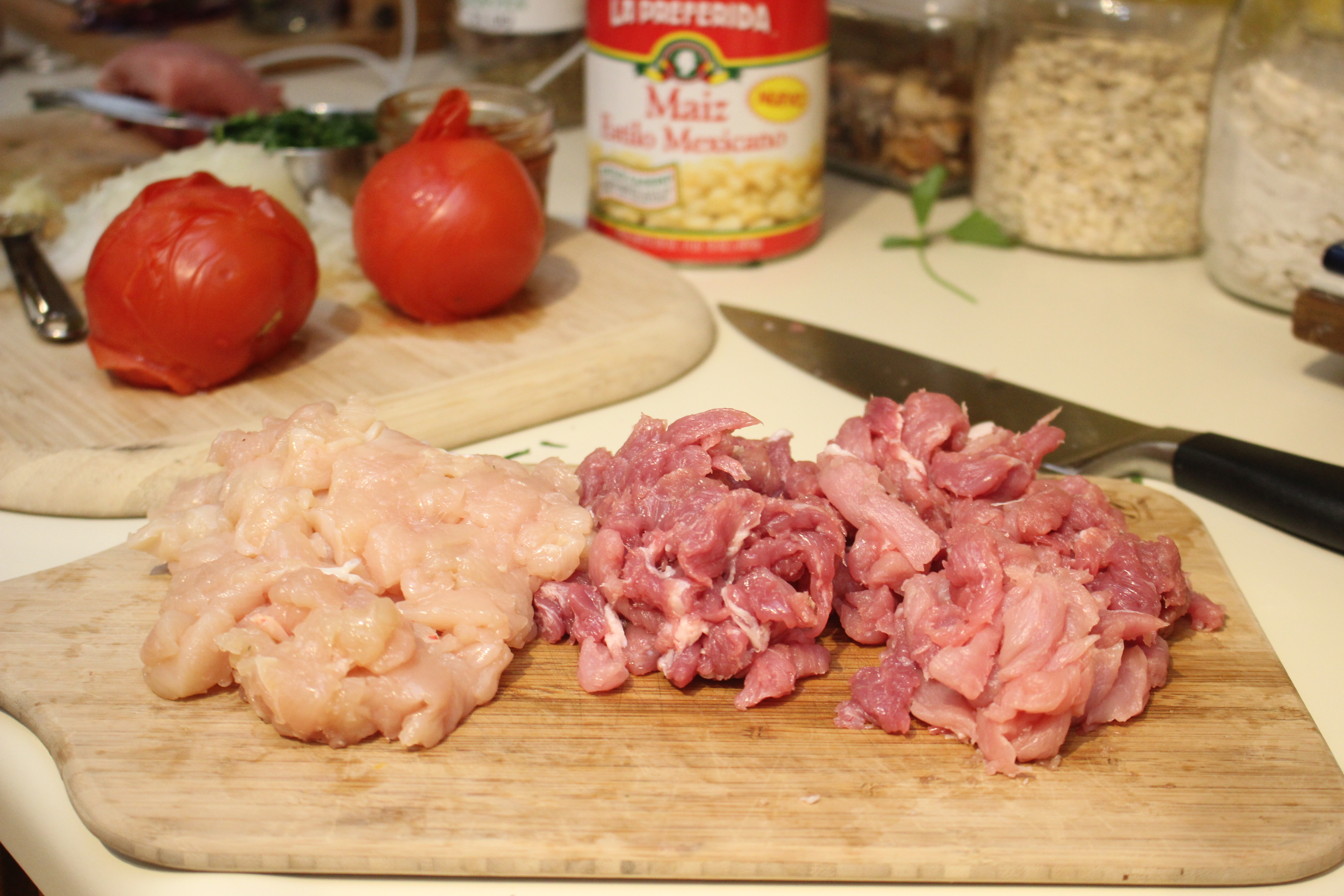 Cut the meat in tiny pieces by hand. This takes a little bit of time but it’s worth it and gives the menudito more body.