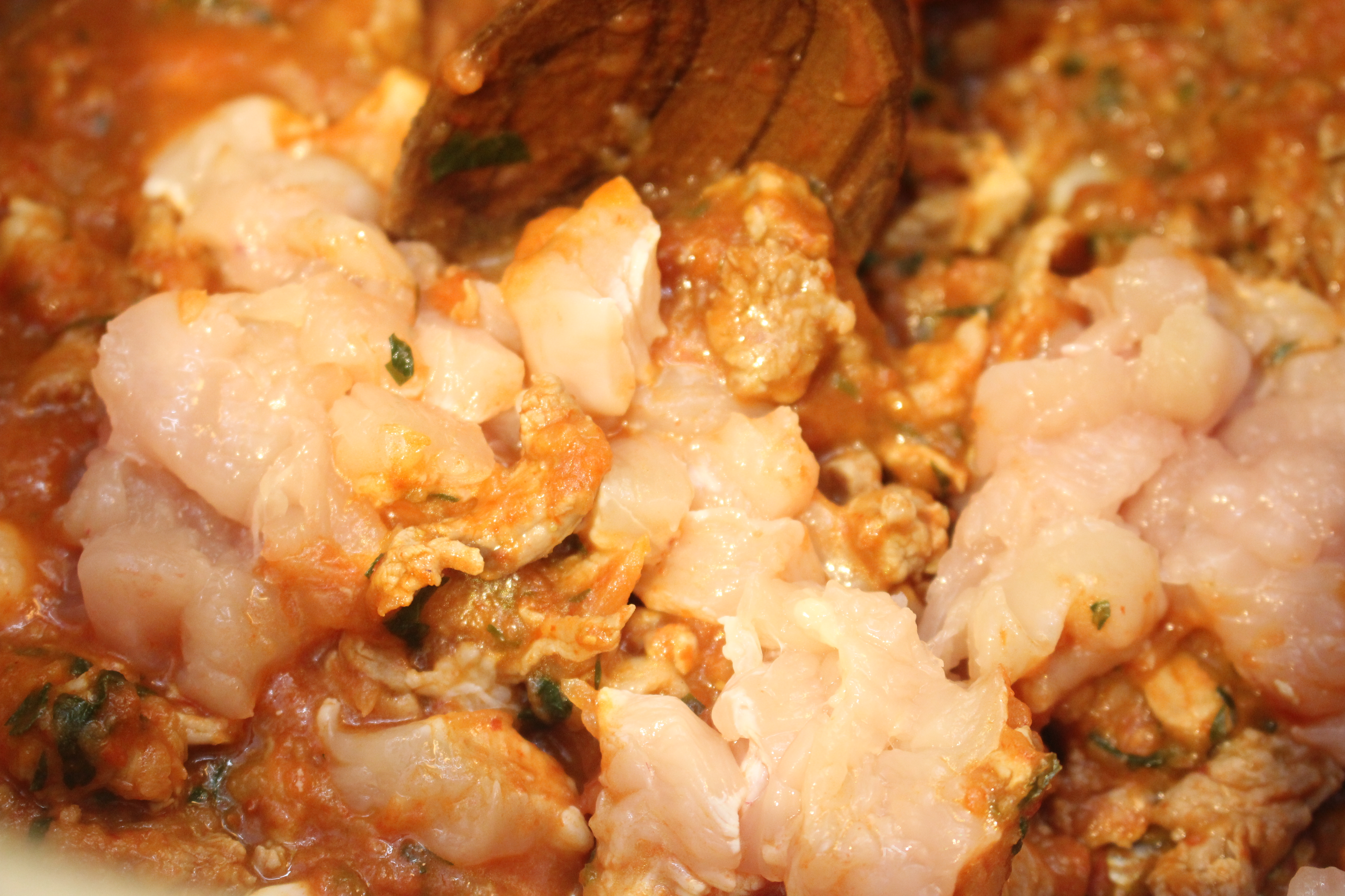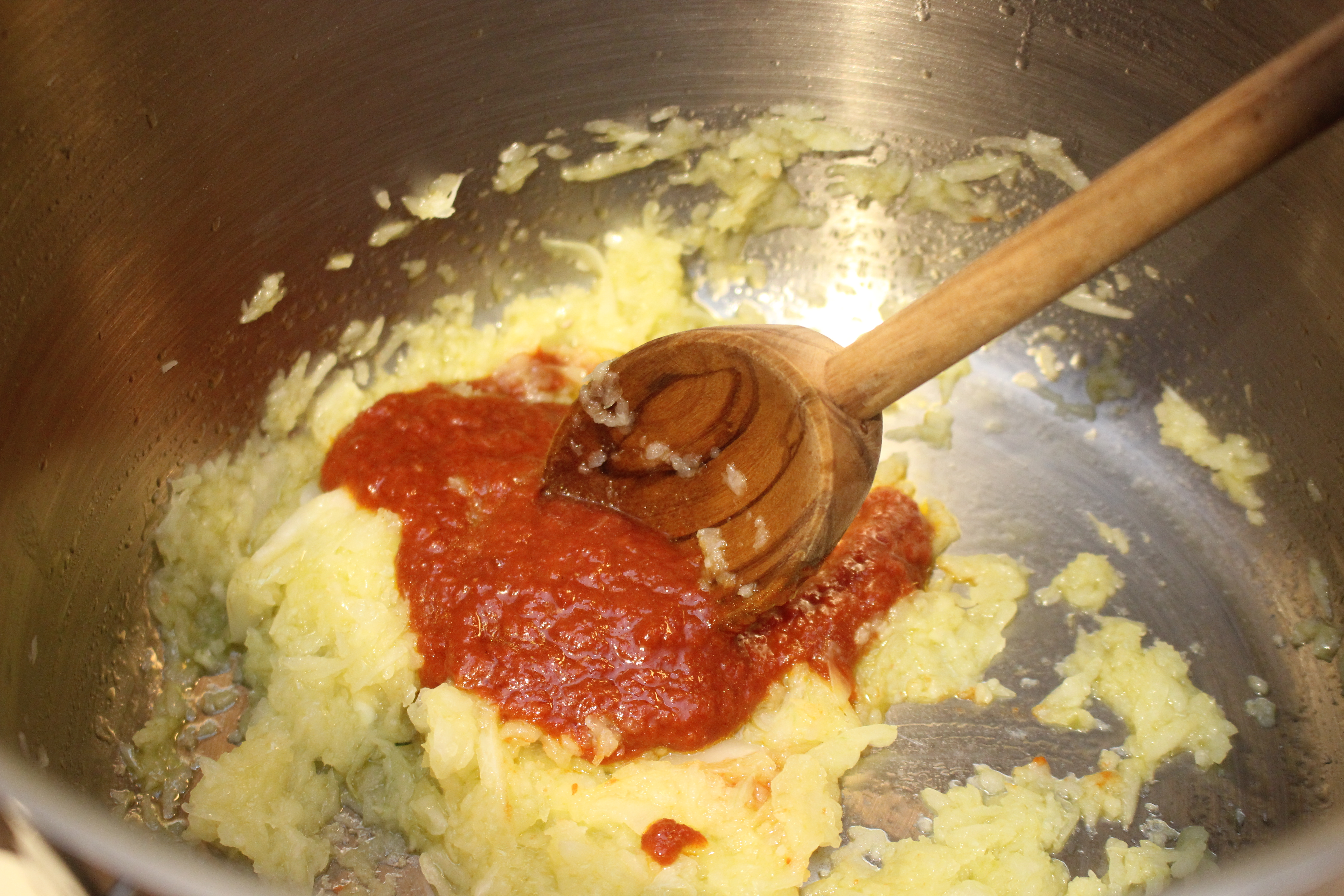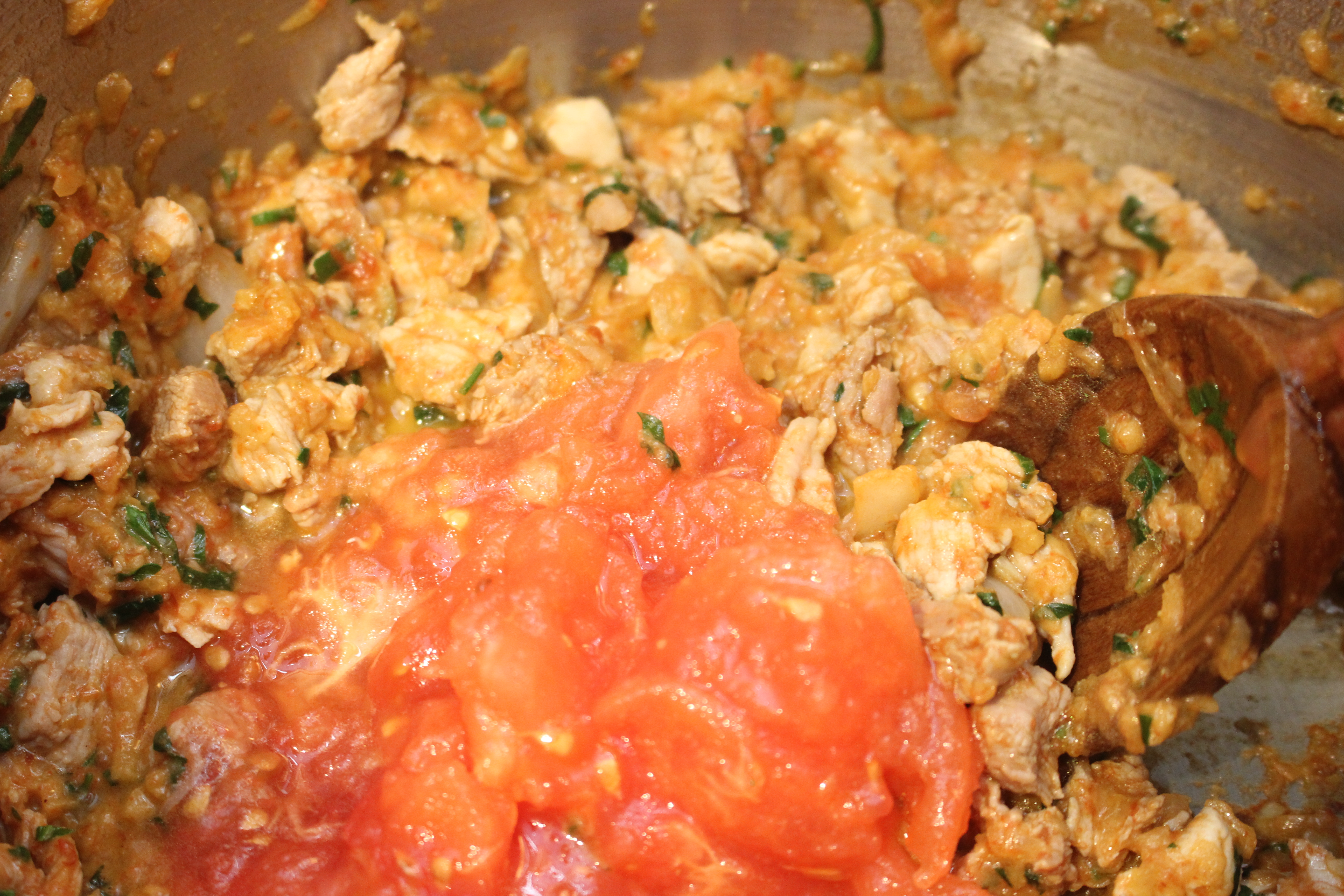 Add the 2 tomatoes that are peeled. When you add them crush them in your hand so it’s more like a puree. Cook for another 5 min.